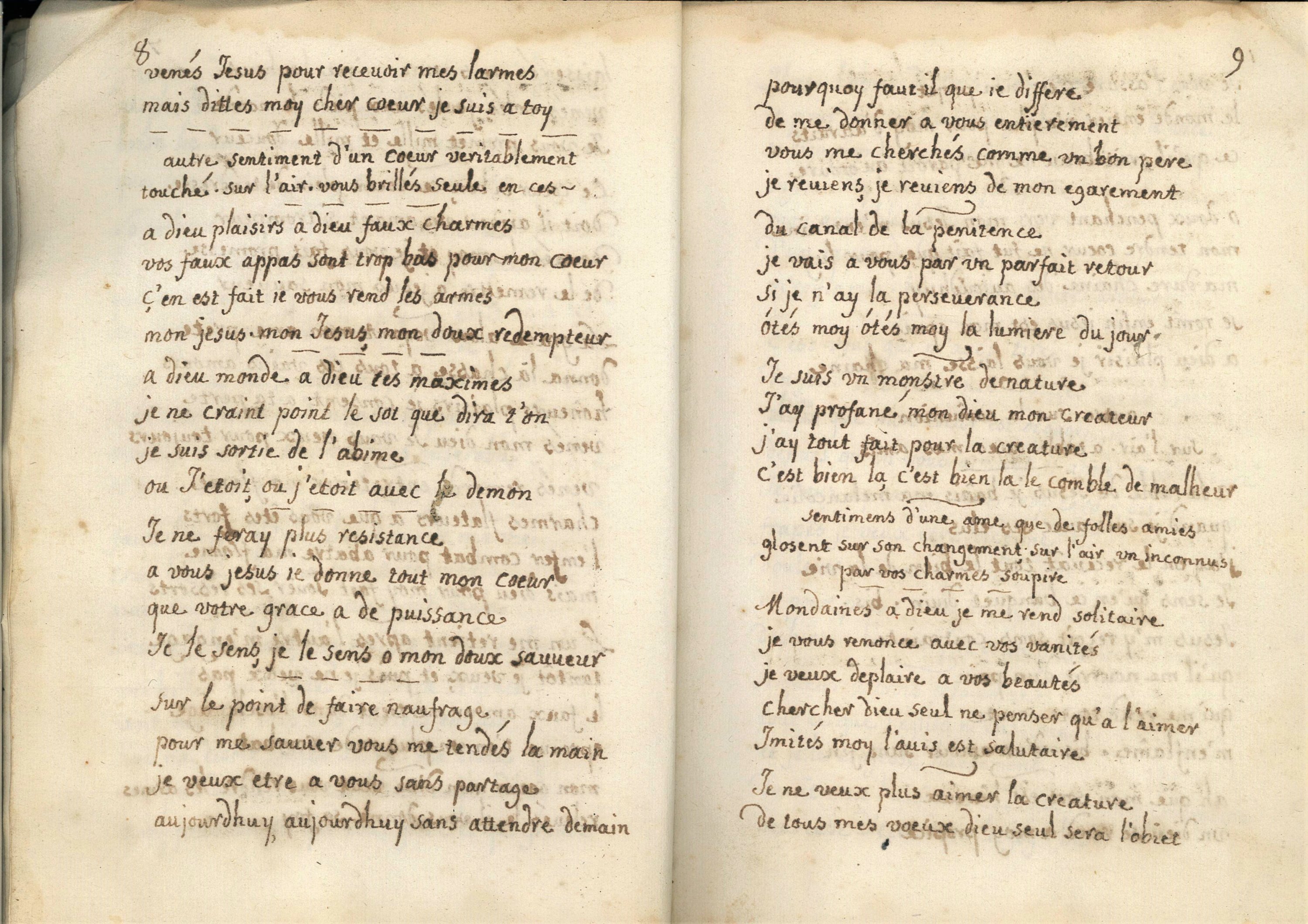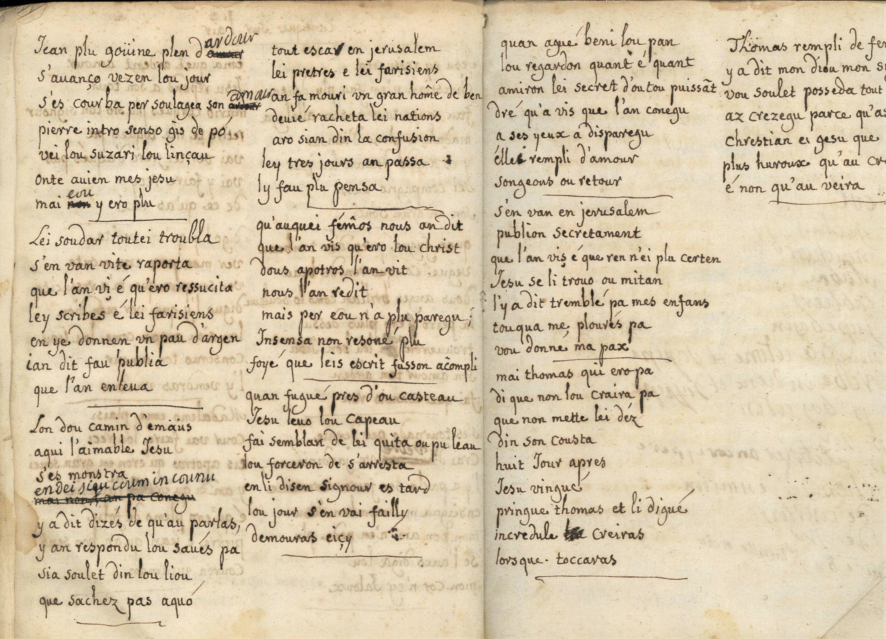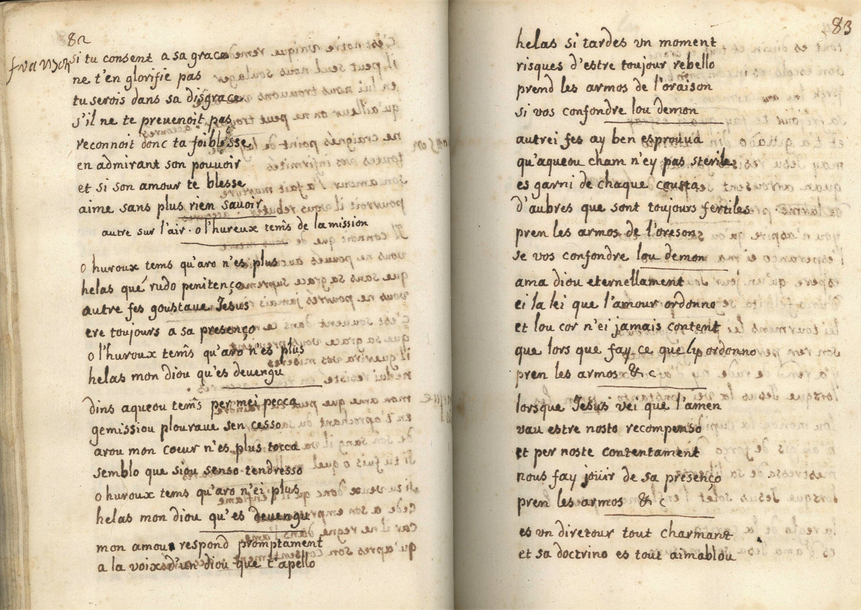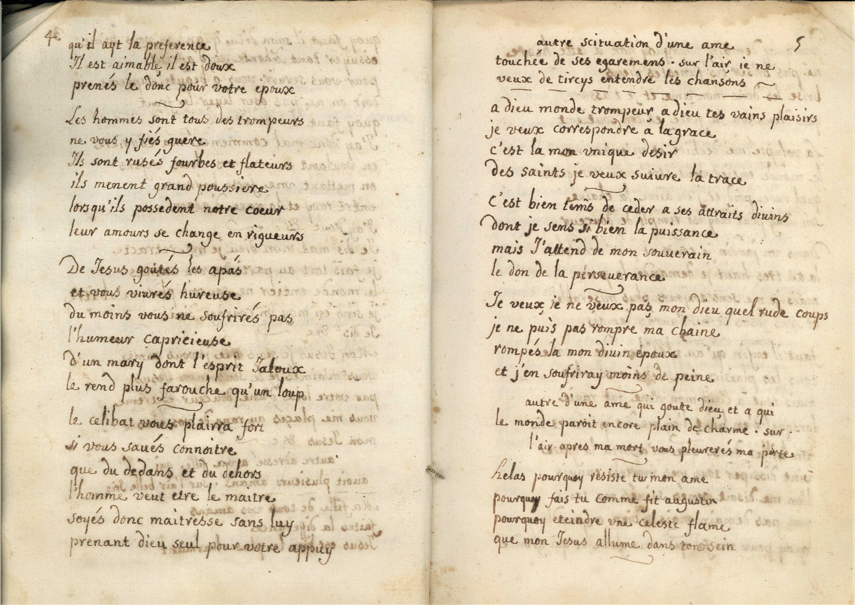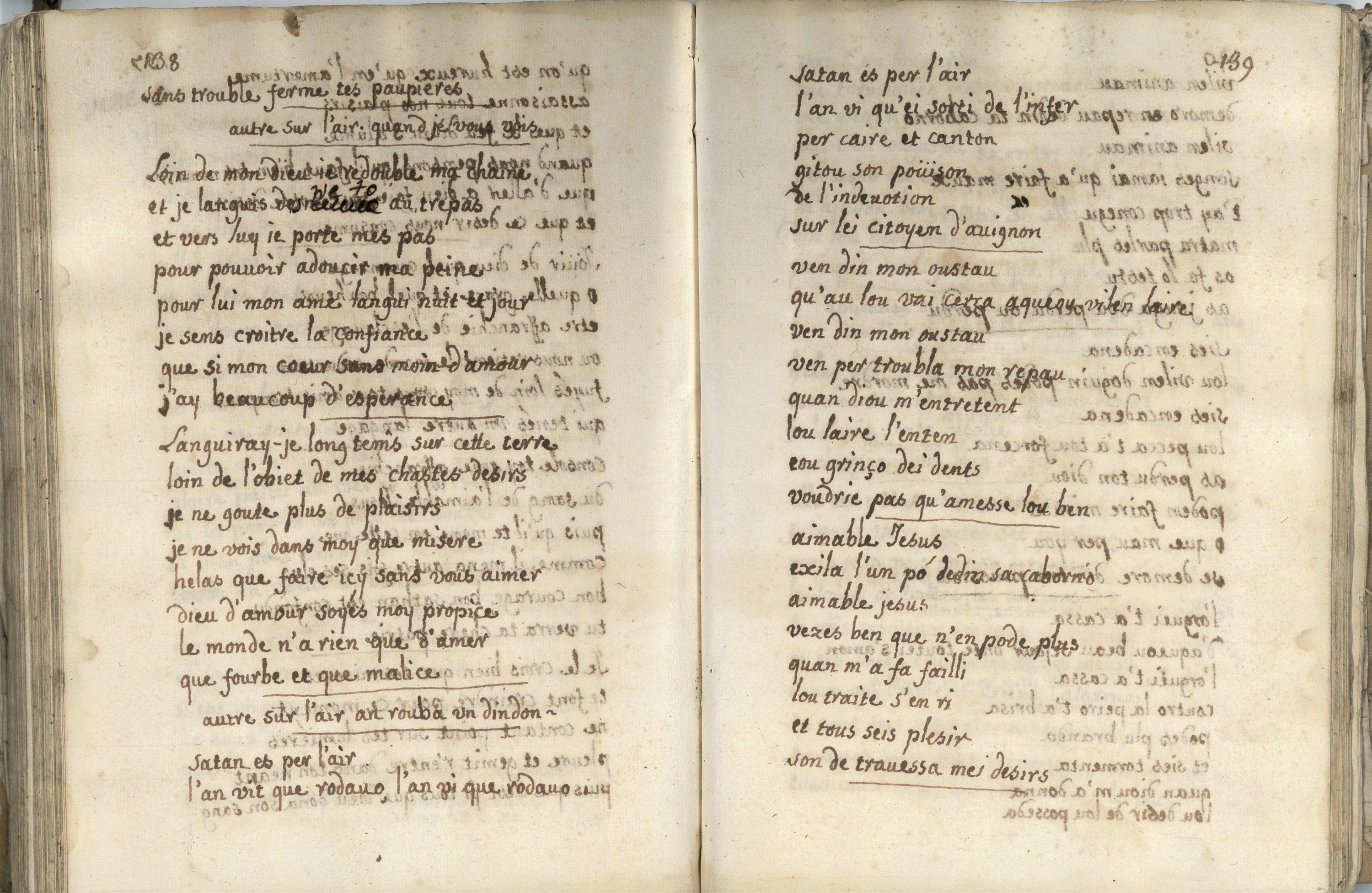 Recueil manuscrit de cantiques religieux populaires, certains écrits en provençal, 195 pages in-4 (taches), rel. en parchemin, titré en 1ère page Cantiques sur plusieurs sujets. Commencé en 1715. Le chant, sous la forme des cantiques, est un moyen largement employé par le clergé au 18e siècle pour rappeler aux adultes sous une forme plus attrayante le catéchisme, les vérités de la religion, les obligations morales quelles entraînent et ainsi guider leurs dévotions. Conformément au modèle de la Compagnie italienne de Sainte Ursule, les Ursulines avaient pour mission de préparer aux sacrements les jeunes filles et à leur enseigner la doctrine chrétienne. Notre manuscrit révèle lesprit dune novice ou professe entièrement vouée à lamour quasi charnel voire « érotique » dédié à Dieu, à son fils rédempteur et à la Vierge Marie. Nombreux passages écrits en provençal.