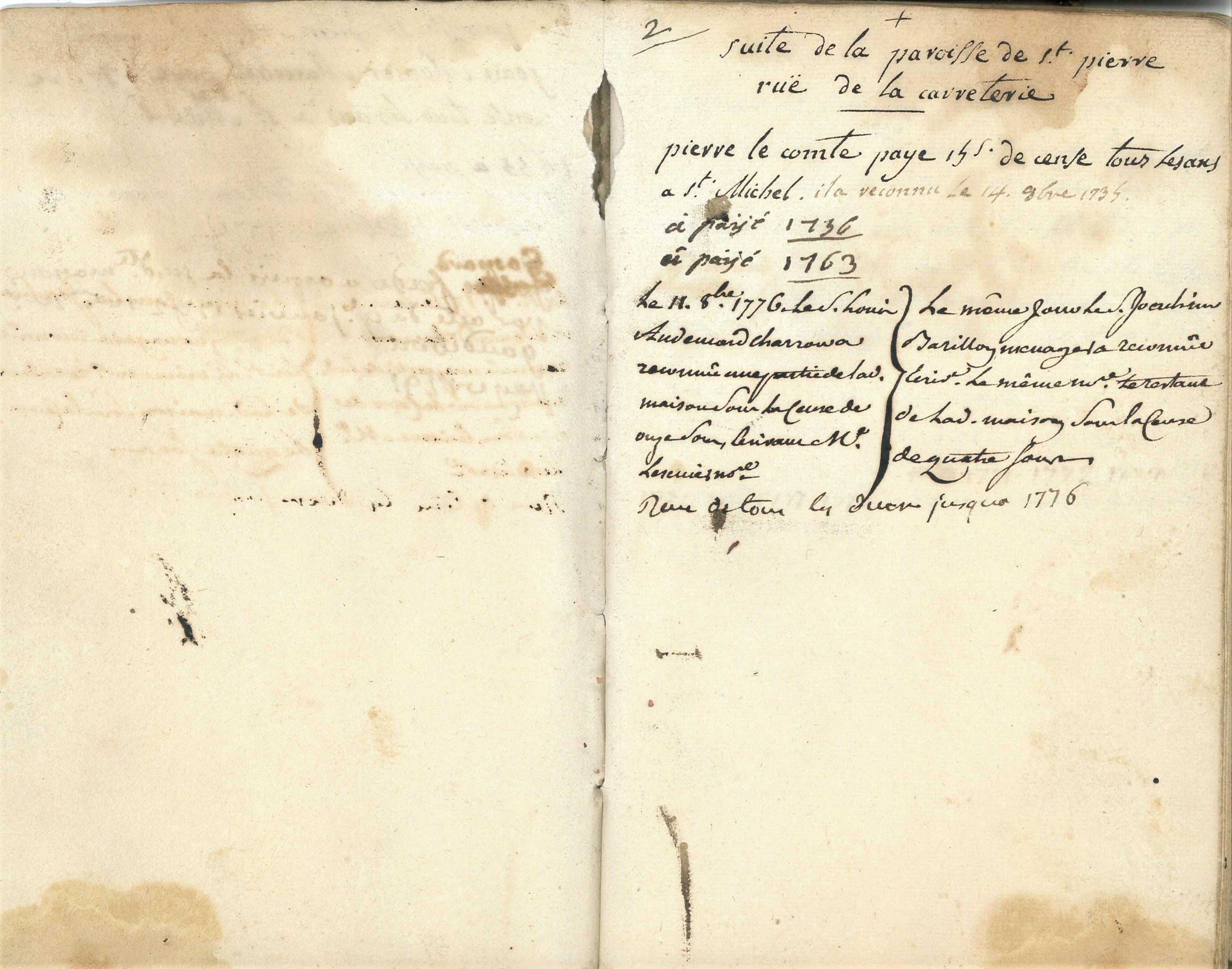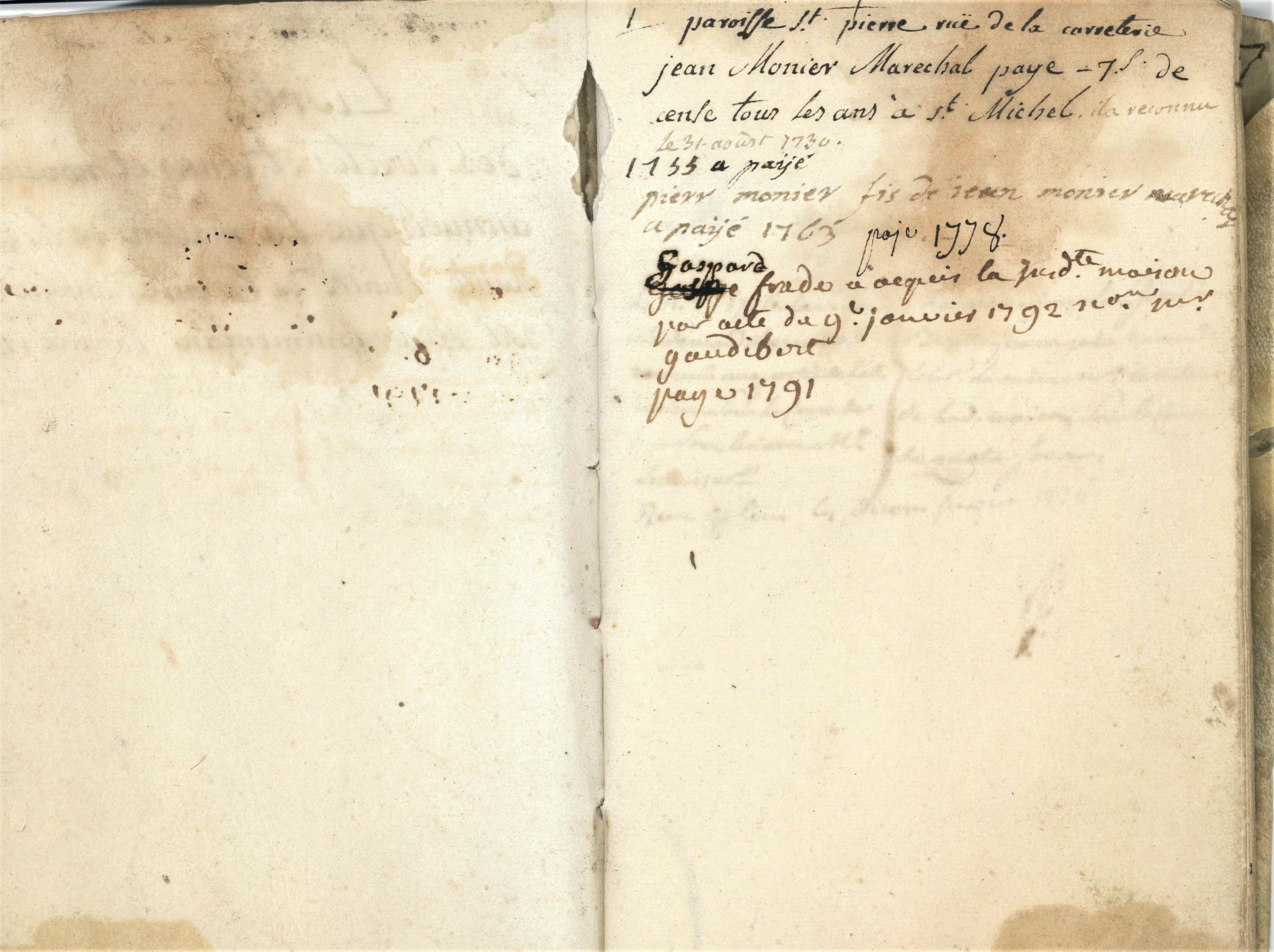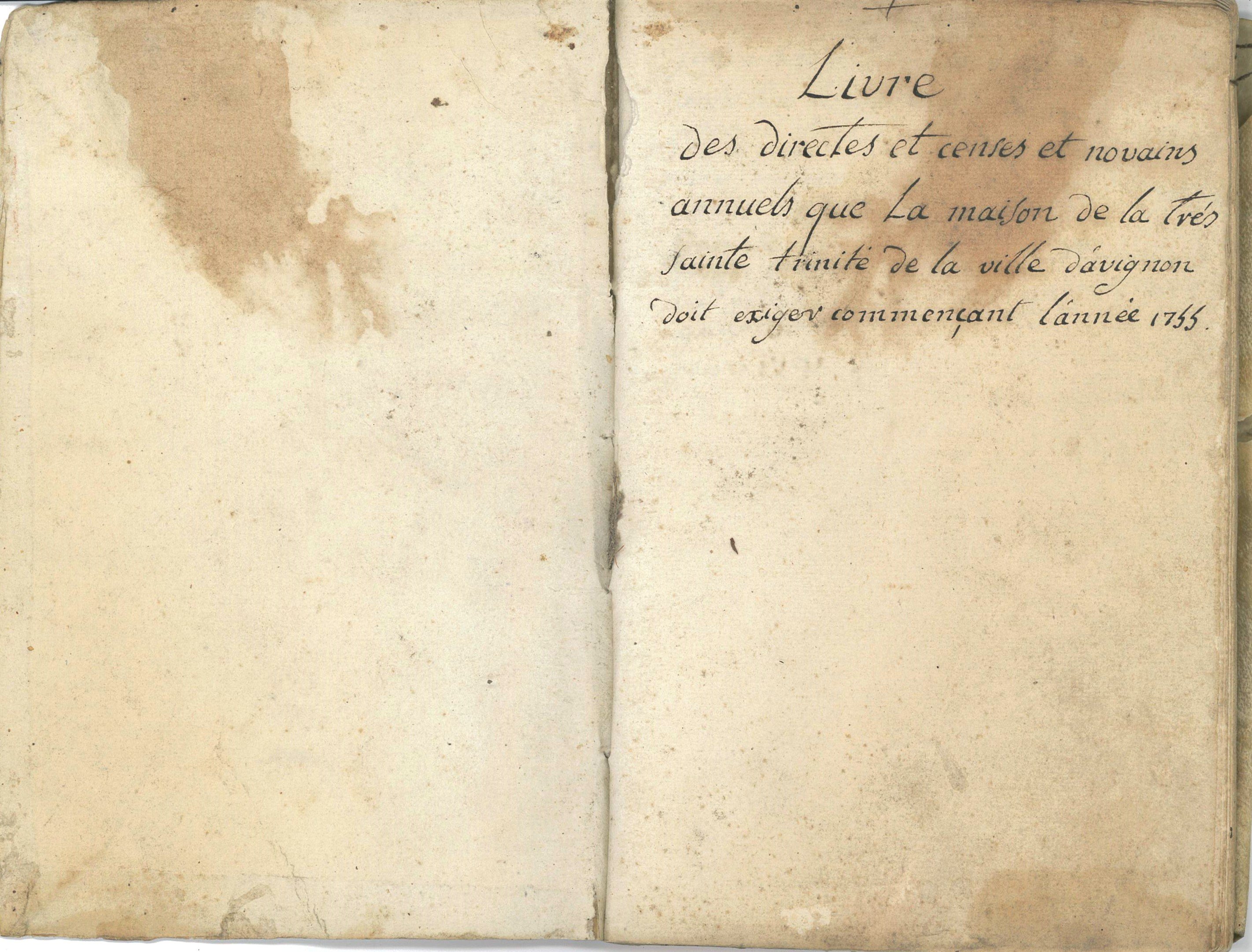 Couvent des Trinitaires, Livre des directes et censes et novains annuels que la maison de la très sainte Trinité de la ville dAvignon doit exiger commençant lannée 1755, cahier manuscrit 40 pages in-8 rel. en parchemin ;