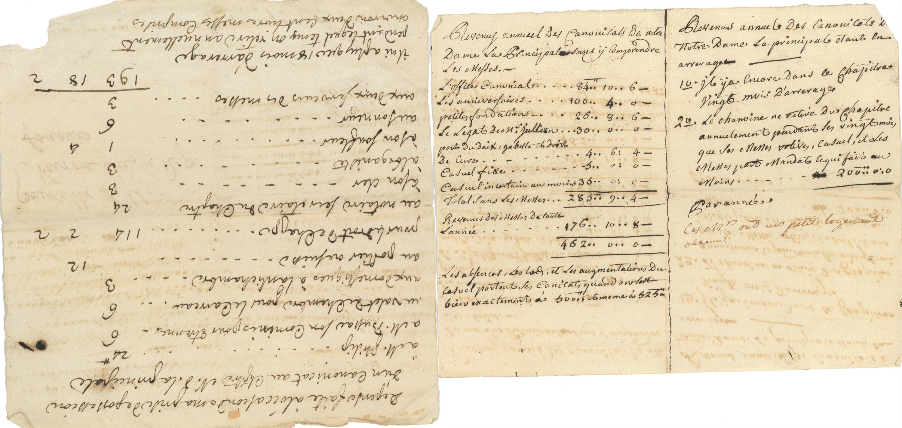 Testament du 26 février 1639 de Jeanne de Pape, veuve Jean de Fontainerousse marchand de soie à Avignon, fondatrice dun nouveau canonicat au chapitre de Notre-Dame-La Principauté dAvignon par le paiement de rentes dues notamment par un marchand et un teinturier de soie, 64 pp. in-4 ; joint 2 petites notes manuscrites : Revenus annuel des canonicats de Notre-Dame-la-Principale sans y comprendre les messes et Dépense faite à loccasion de ma prise de possession dun canonicat au chapitre de N.D. la Principale ;