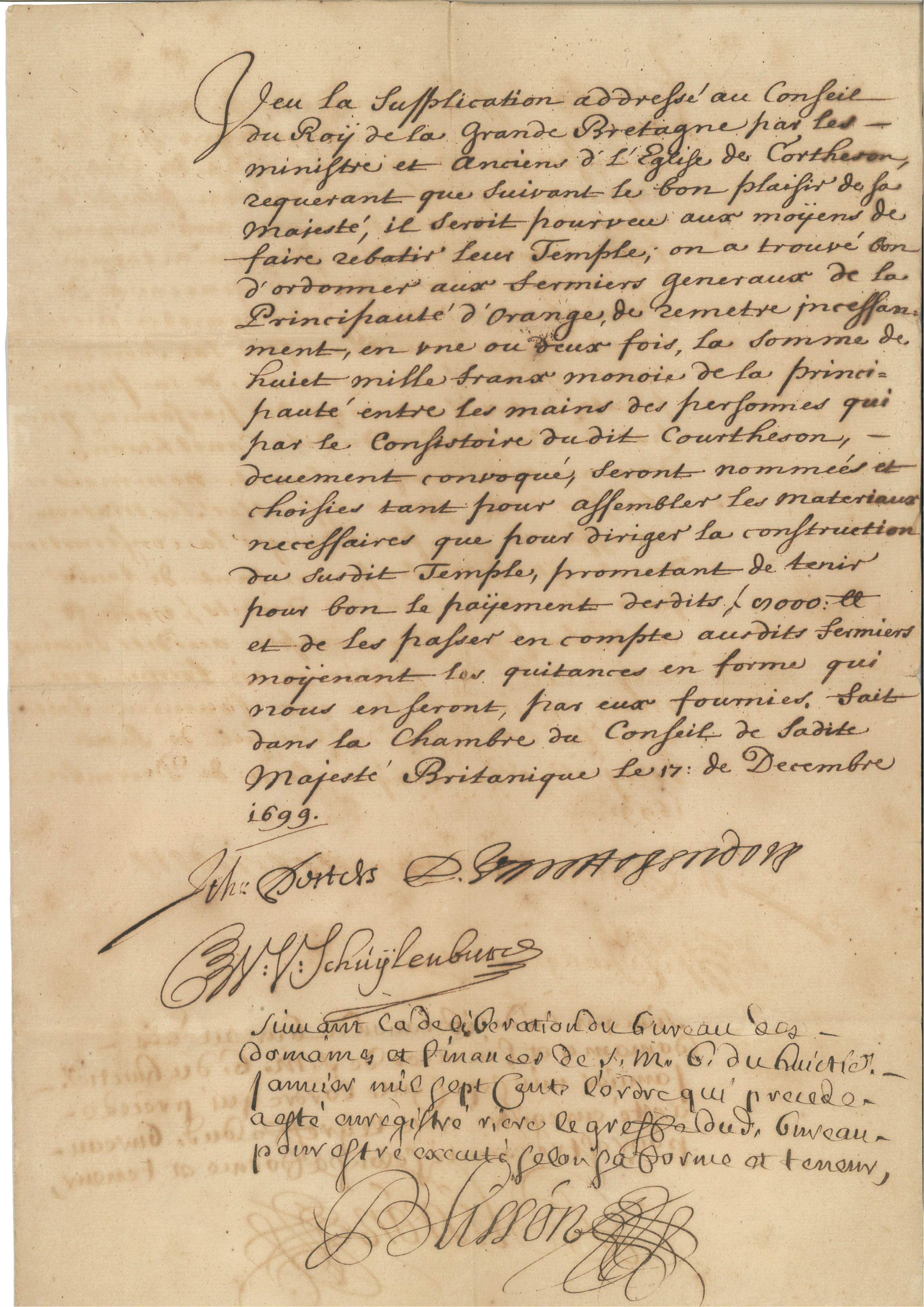 P.S., [Saint Germain en Laye], 17 décembre 1699, 1 page in-4 ; intéressante et rare pièce manuscrite signée par des officiers jacobites (anglais et hollandais) composant la chambre du conseil du roi Jacques II, roi dAngleterre, en exil en France, ordonnant aux fermiers généraux de la principauté dOrange de payer la somme de huit mille francs monnaie aux personnes chargées de la reconstruction du consistoire protestant de Courthézon, détruit par ordre de Louis XIV entre 1685 et 1697.
