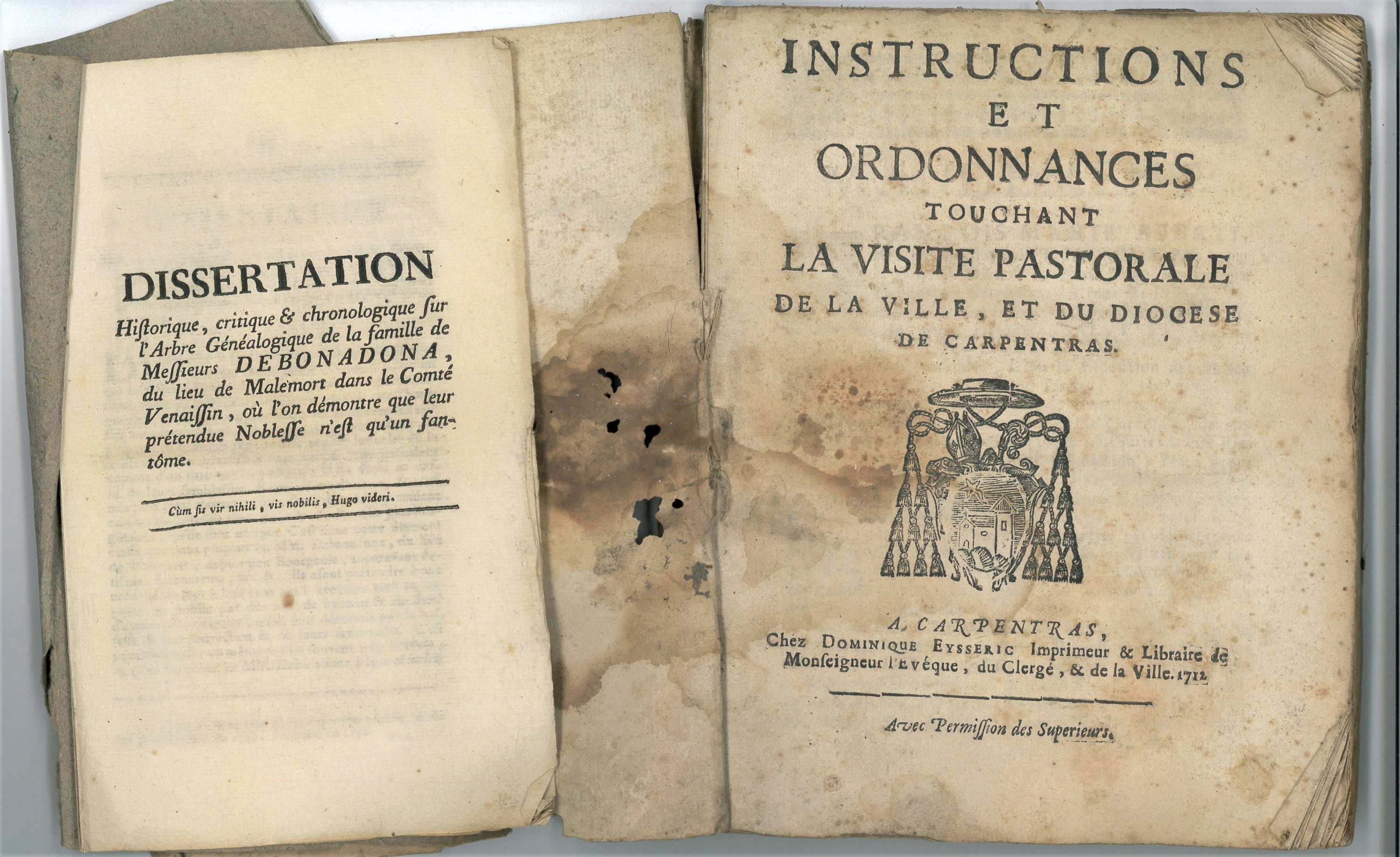 Instructions et ordonnances touchant la visite pastorale de la ville et du diocèse de Carpentras, Carpentras, chez Dominique Eysseric, 1712, in-8, 121 pp. (rousseurs) ;