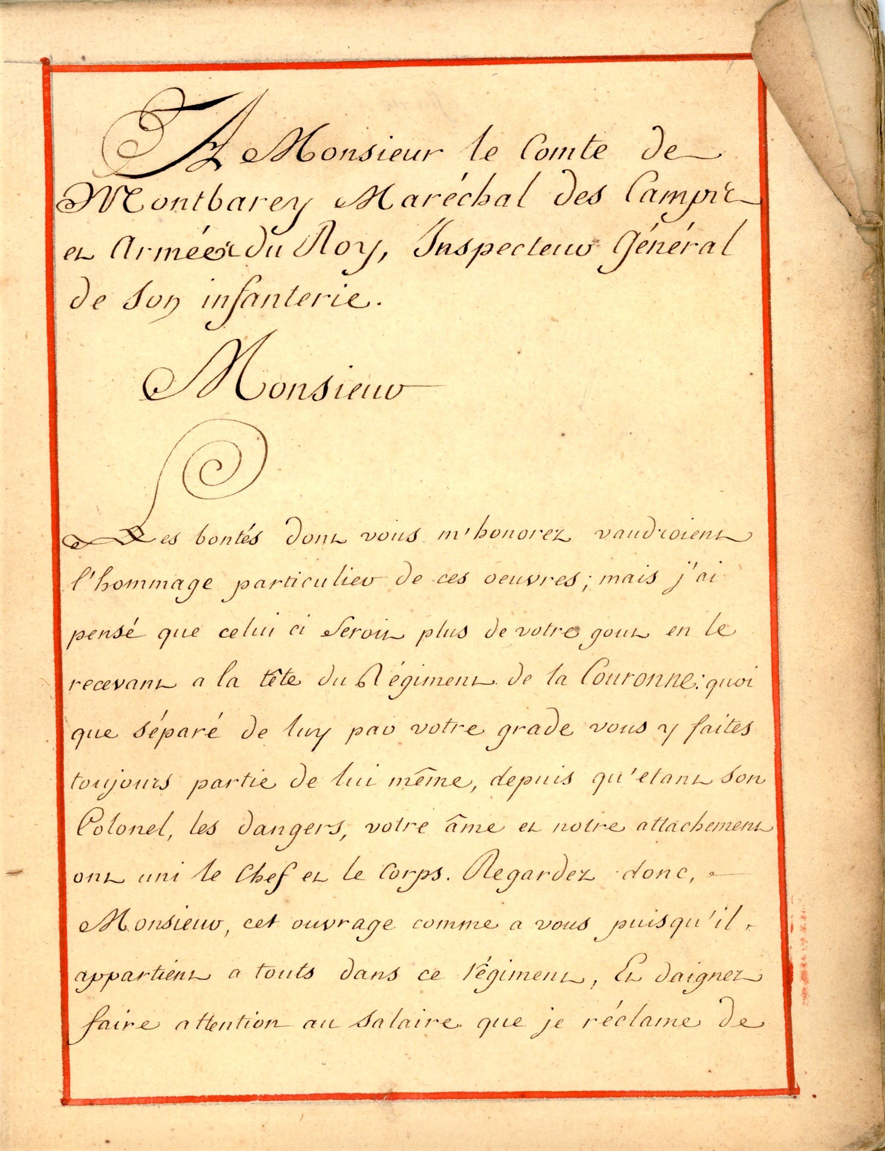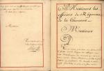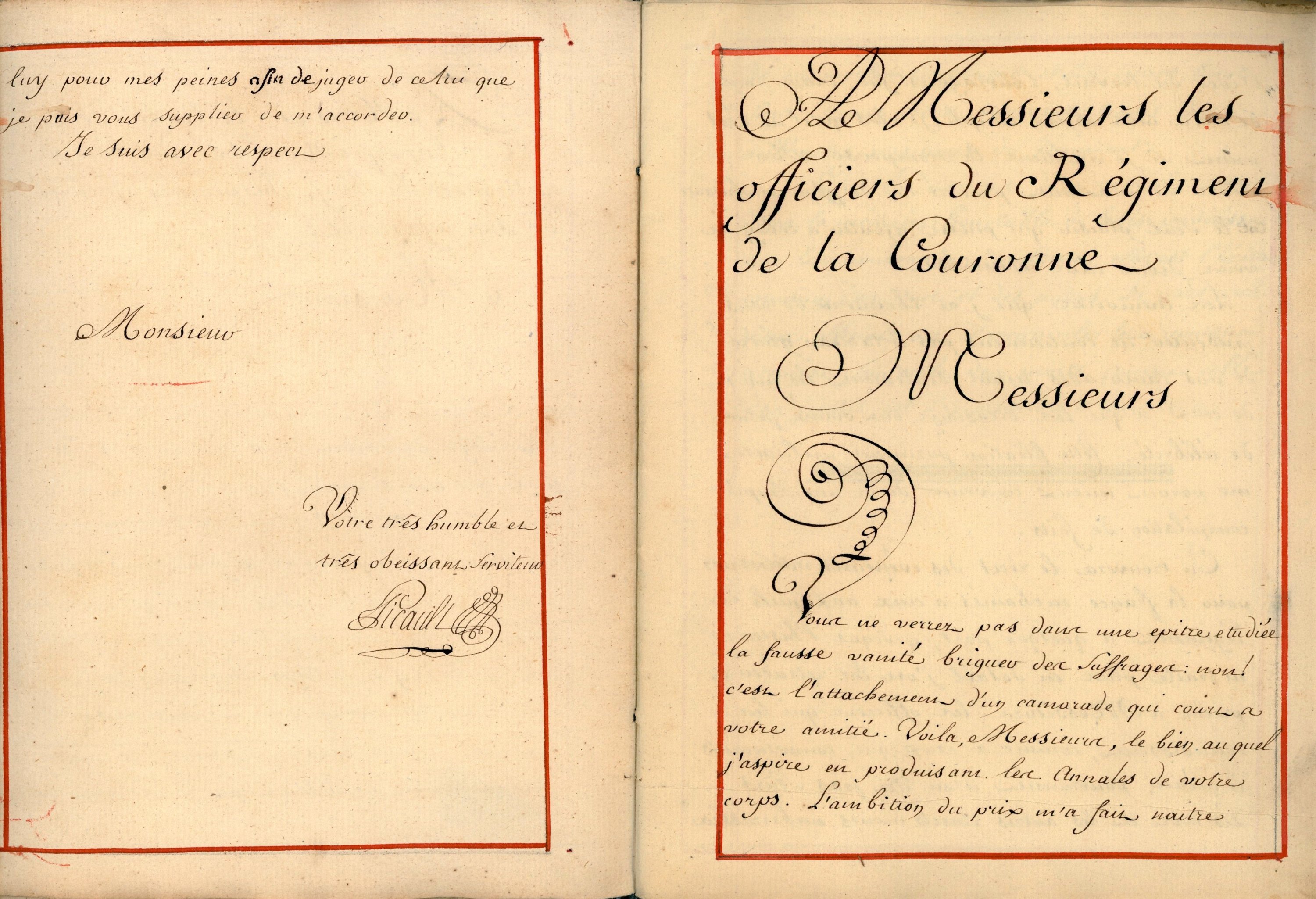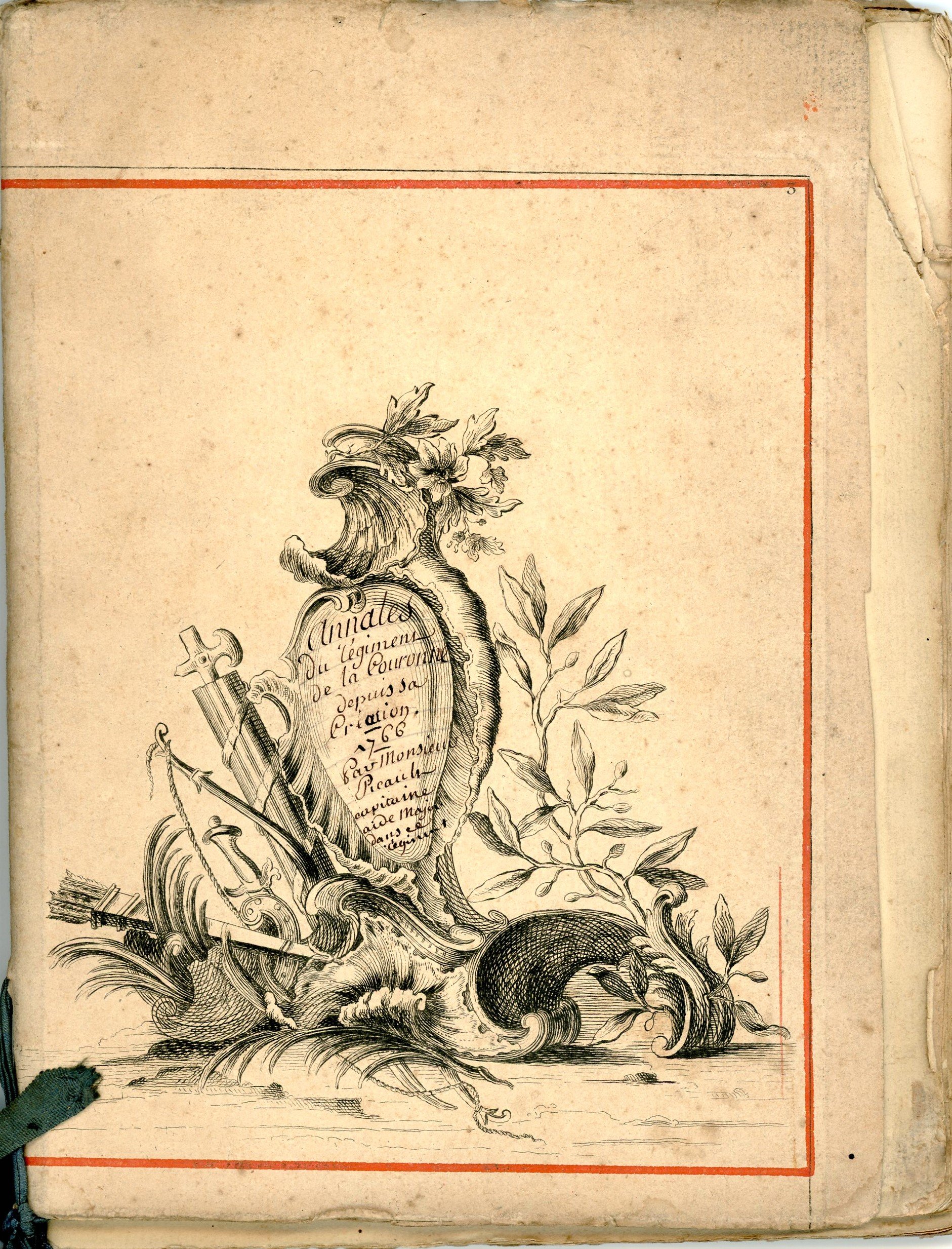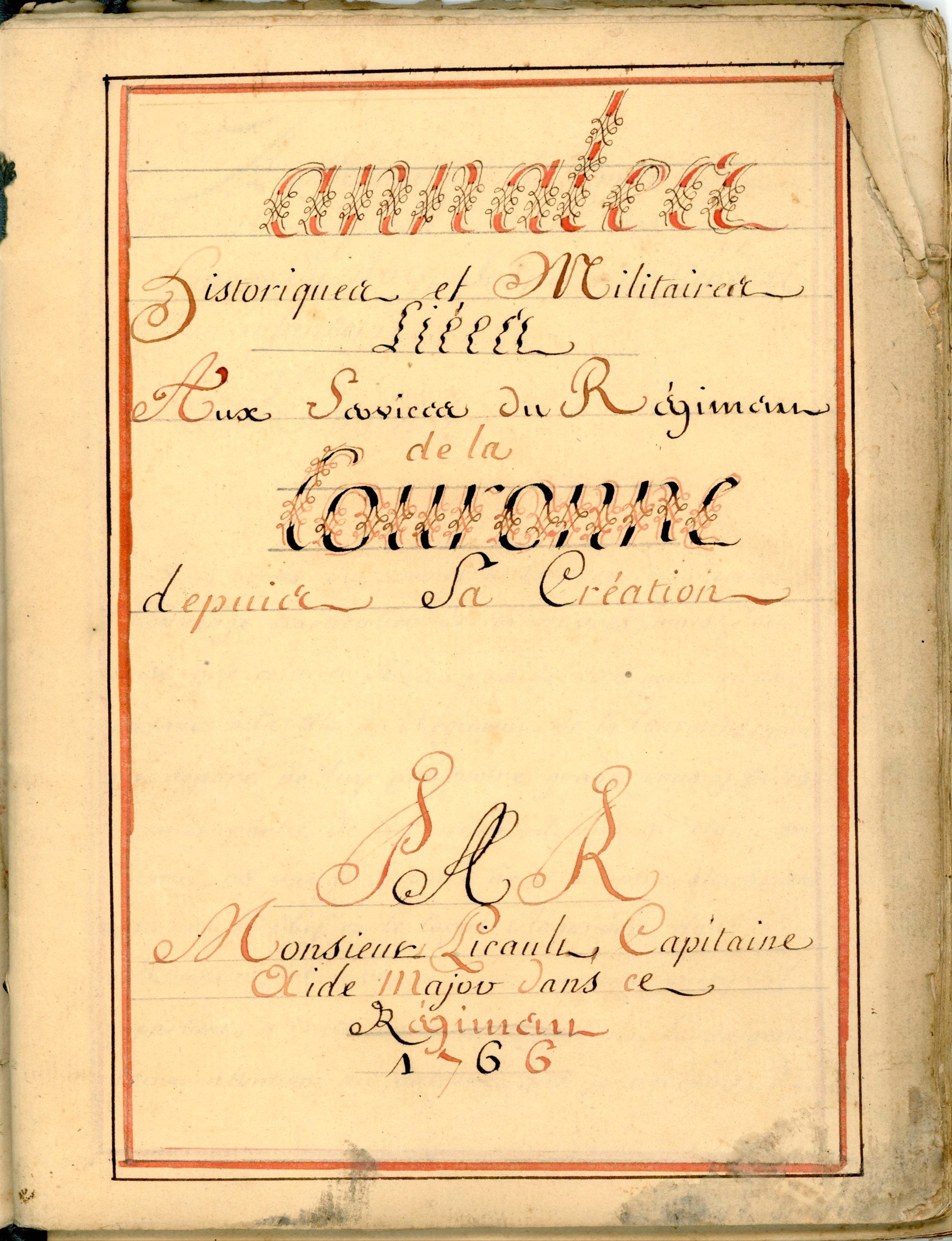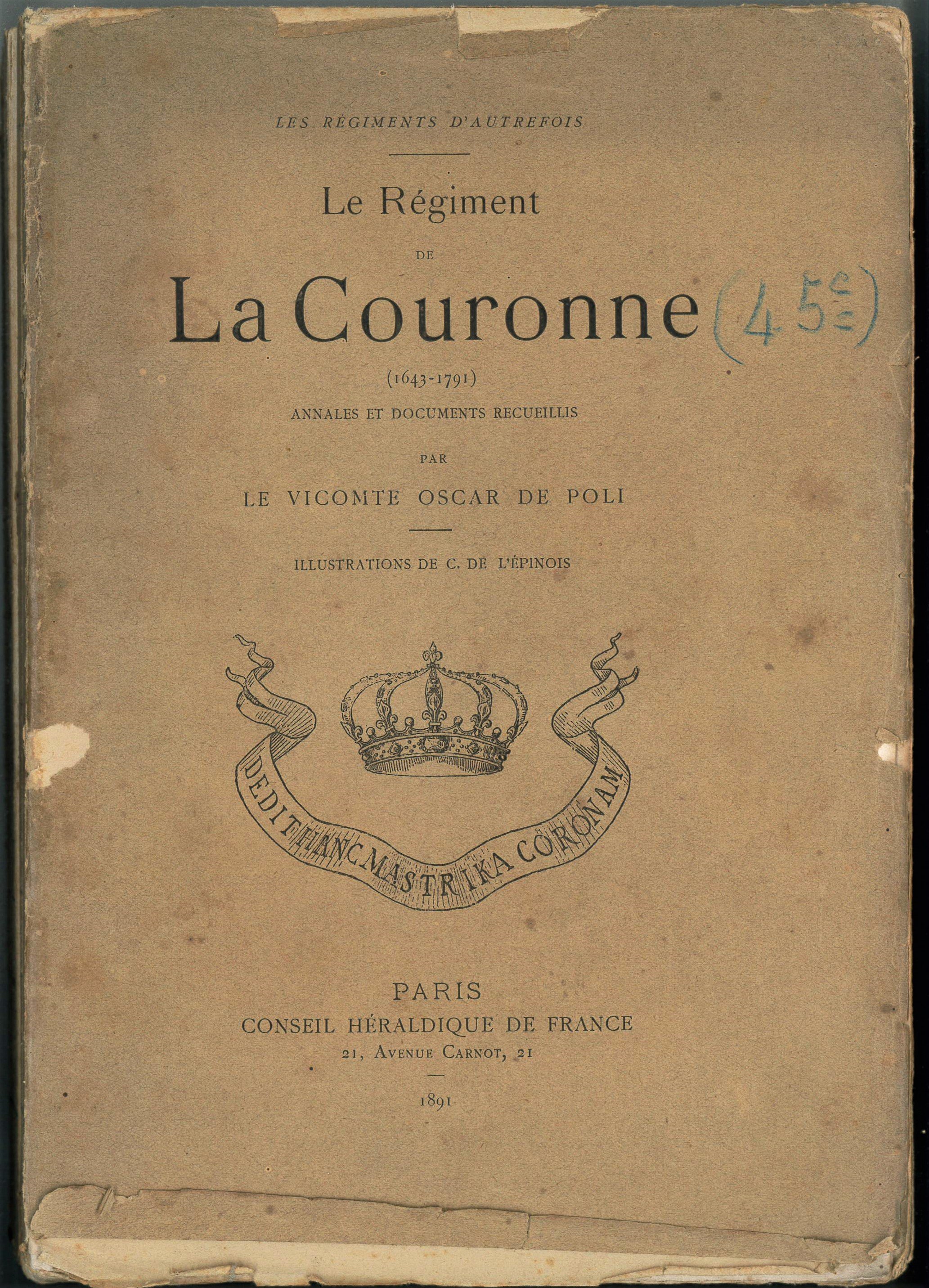 • Annales du régiment de la Couronne depuis sa création, 1766, par monsieur Picault capitaine aide major dans ce régiment, manuscrit composé de 14 petits cahiers in-8 (+ de 400 pages), frontispice dessiné à la plume, incomplet (manque p.49 à p.96), seconde moitié du XVIIIe siècle. Rare manuscrit dont un seul exemplaire connu est conservé à la bibliothèque Mazarine à Paris (Ms 2862) ; Joint: Vicomte Oscar de Poli, Le Régiment de la Couronne (1643-1791), Paris, Conseil héraldique de France, 1891, br. in-4, 370 pp. (en l’état) ;