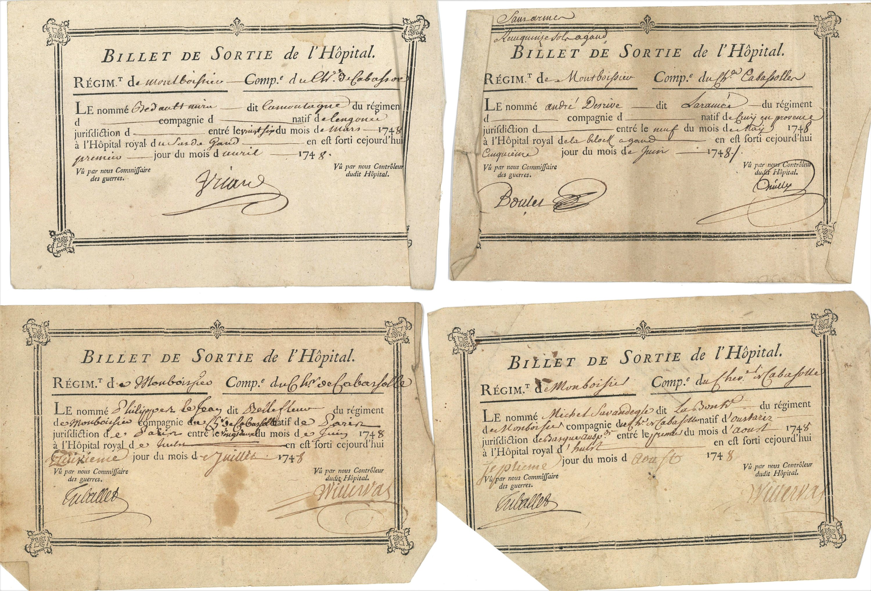 • 12 billets de sortie de l’hôpital royal à Gand, avril-août 1748, du régiment de Montboissier, compagnie du chevalier de Cabassolle, qui prit part durant la guerre de Succession d’Autriche au siège de la ville de Maastricht au printemps 1748 ;