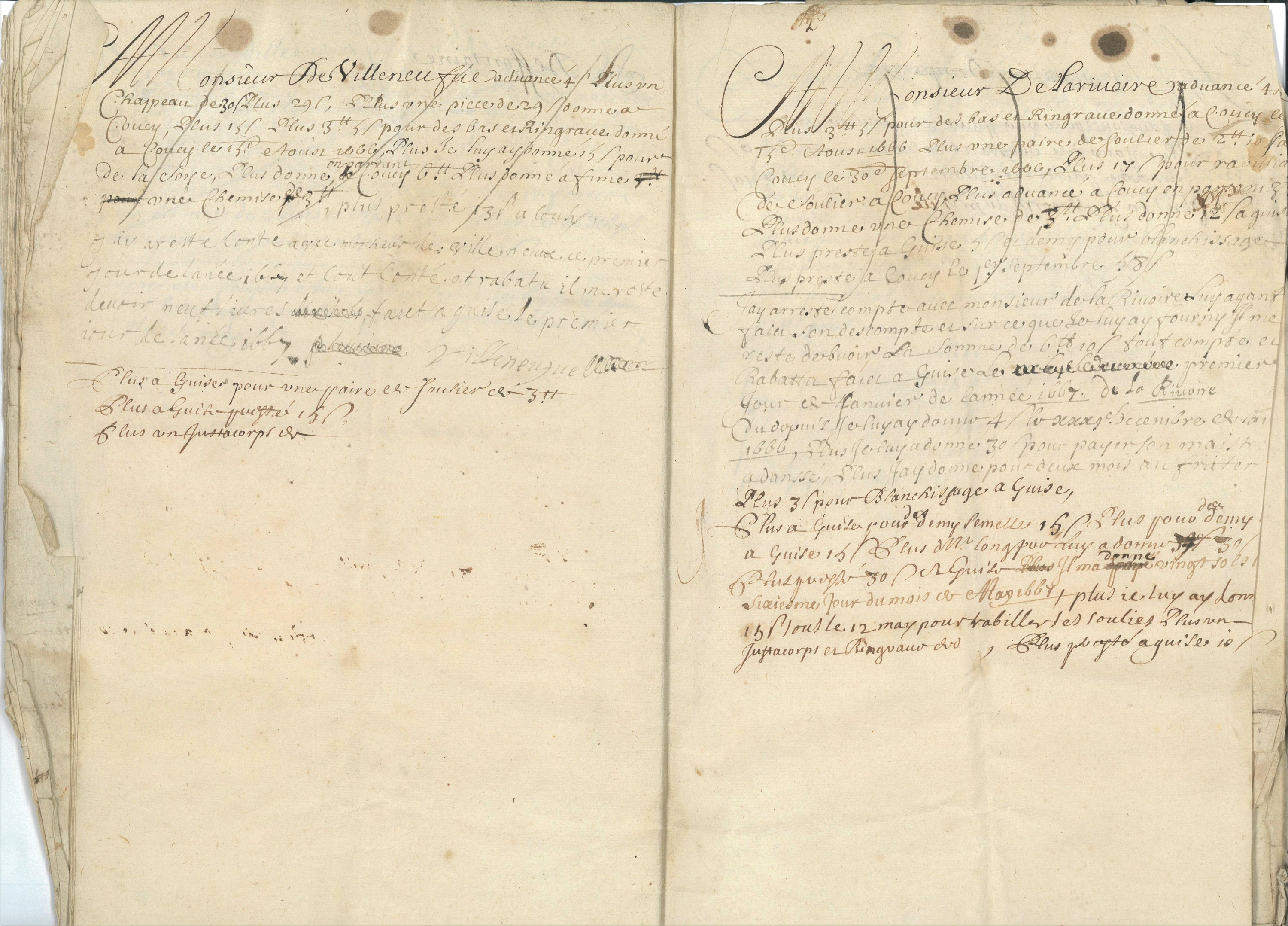 Manuscrit anonyme, 1666-1667, in-4, 50 pp. (plis, manques), titré Controlle de tout ce qui mest dheub par les soldats de ma compagnie que je leur ay advancé depuis le dix huitième jour de febvrier mil six cent soixante six ; Brouillon manuscrit dun cahier de comptes personnel tenu par un officier militaire commandant une compagnie dans lequel il note toutes les dépenses dhabillements, armes, soins, frais de voyage délivrées à ses hommes (soldats, officiers ou sous-officiers, domestique) à partir de février 1666 jusquen 1667 (campagne de Flandre ?), passant par Bergues, Guise, Montreuil, Grammont, etc.
