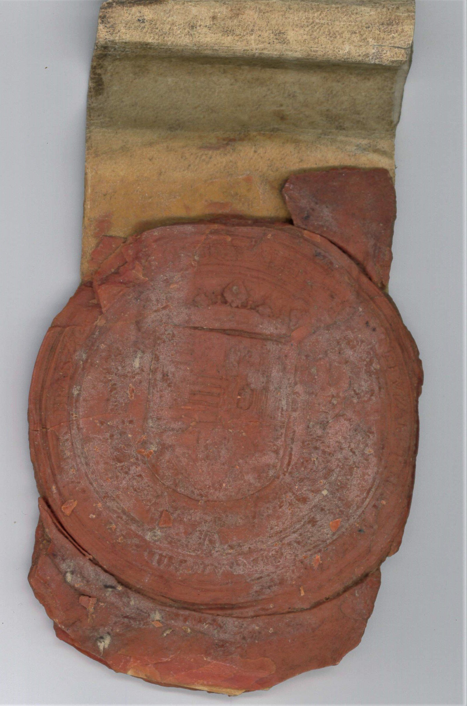 Rare et beau grand sceau de cire rouge (relief un peu aplati) pendant sur queue, aux armes d’Albert VII archiduc d’Autriche (1559-1621) et de son épouse Isabelle Claire Eugénie d’Espagne (1566-1633), gouverneurs des Pays-Bas espagnols. Les armoiries représentées à l’avers et au revers sont celles d’Albert d’Autriche entourées du collier de la Toison d’Or. Le couple souverain est représenté en effigie de chaque côté de l’écusson sur l’avers.