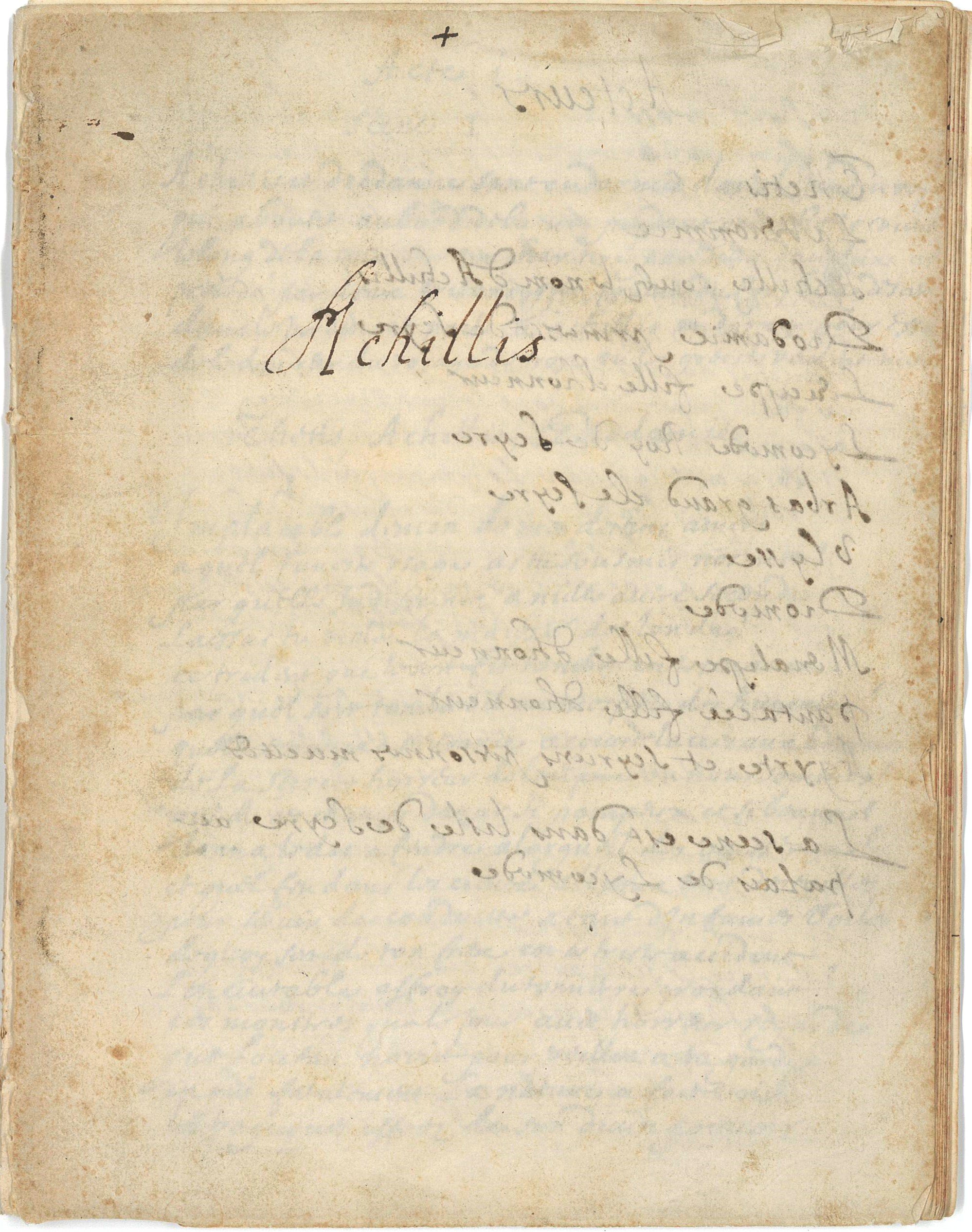 Achillis, manuscrit à l’encre brune sur papier vergé filigrané, 58 pp. in-8 ; texte inédit de composition d’une tragédie en vers inspirée du célèbre poète grec Homère, et plus particulièrement l’épisode de l’idylle amoureuse entre Achille et la princesse Déidamie, dont la scène se déroule dans l’île de Scyre [Skyros] au palais du roi Lycomède. Cette pièce s’inscrit parfaitement dans l’esprit de l’époque, faisant apparaître le héros homérique sous un nouveau jour, celui de la sensibilité et de la beauté, habituellement intrépide et colérique, dont la valeur militaire va de pair avec la puissance et l’orgueil.