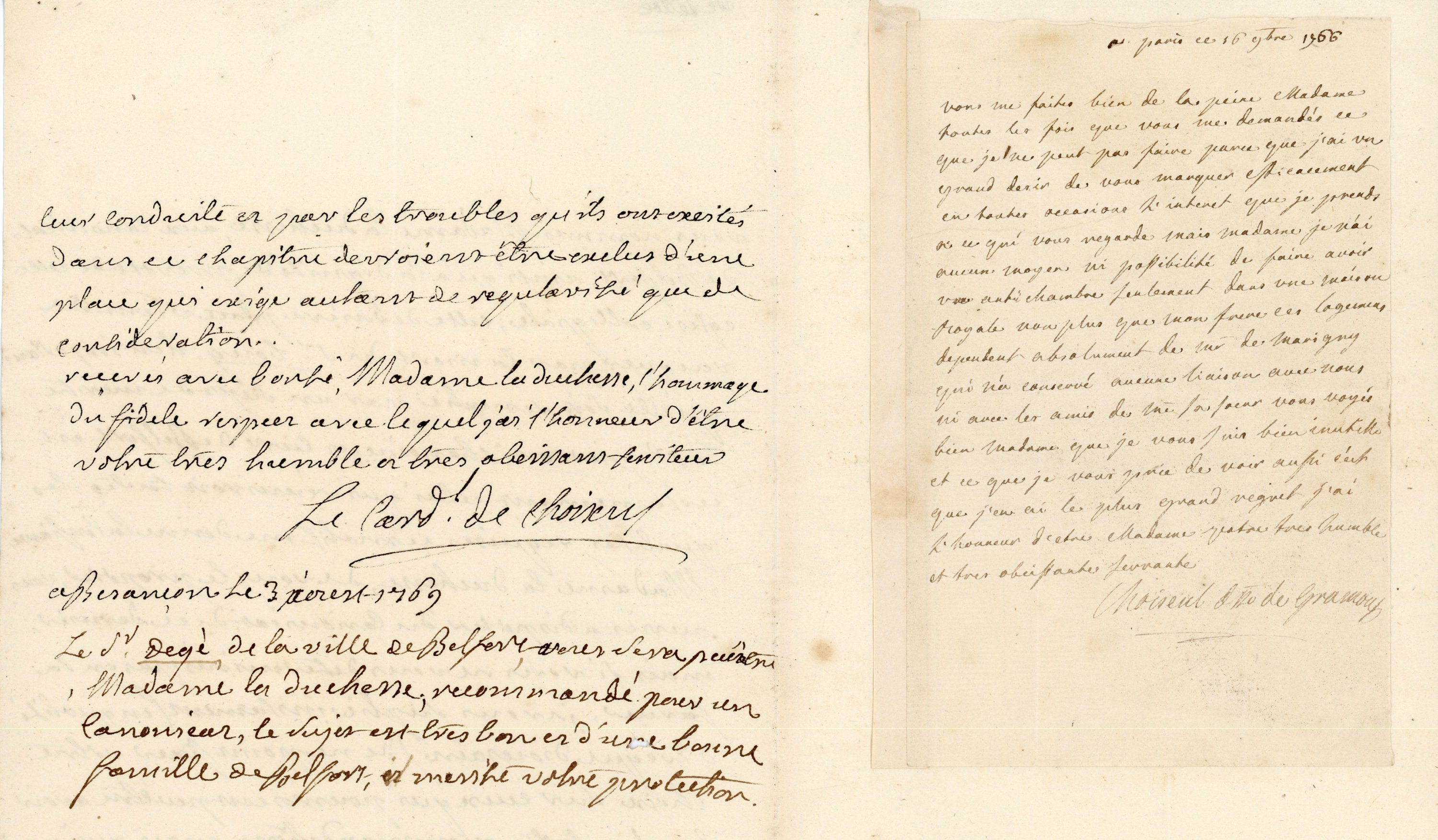 • L.A.S., Besançon, 3 décembre 1769, Antoine-Clériade de Choiseul-Beaupré (1706-1774), dit le Cardinal de Choiseul, adressée à la duchesse de Mazarin, 2 pages in-8, relative aux canonicats et à la dignité de prévôt à l’église collégiale de Belfort ;