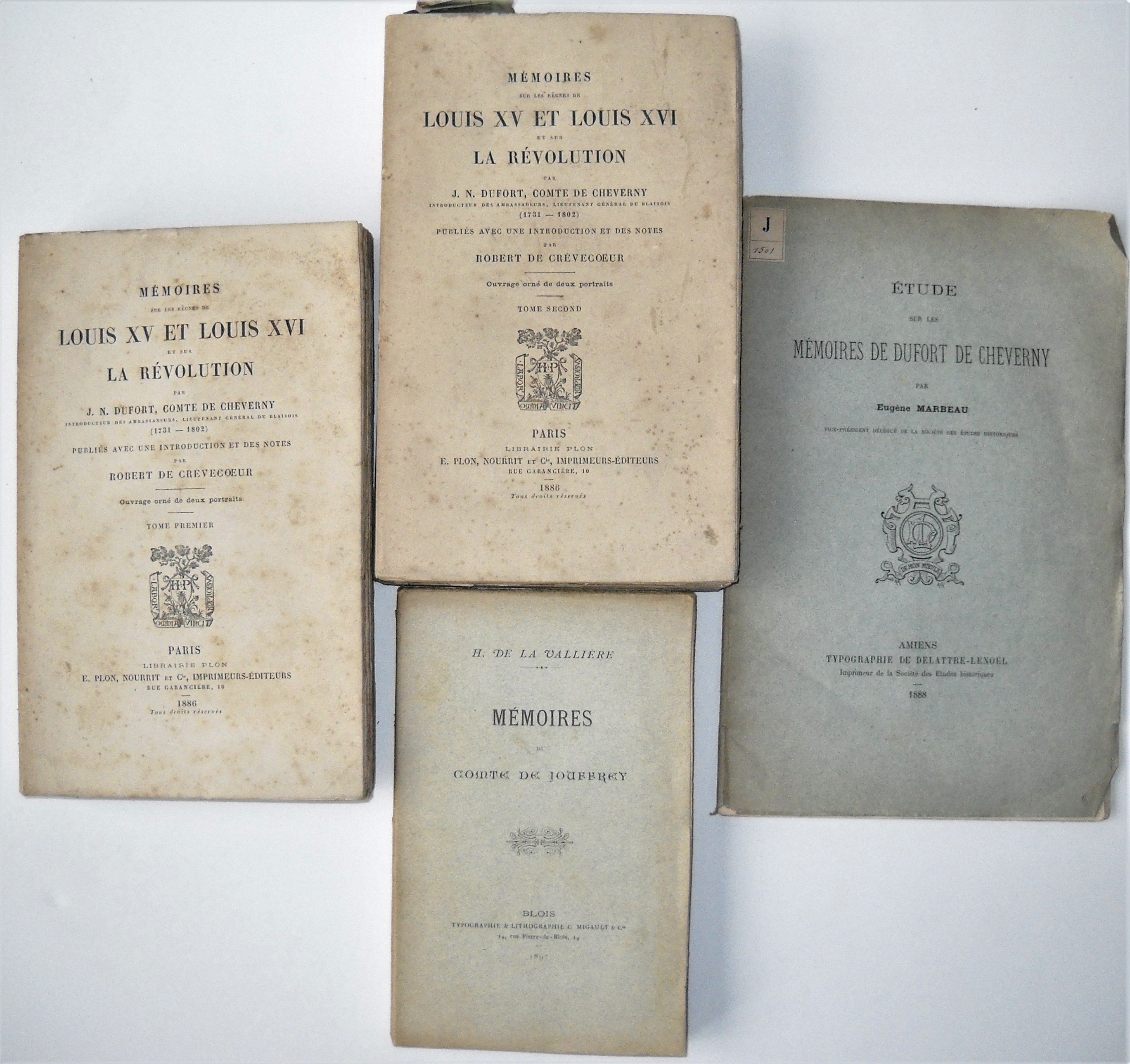 Dufort comte de Cheverny,? Mémoires sur les règnes de Louis XV et Louis XVI et sur la Révolution, 2 tomes, Plon, 1886, br. in-8, XVI-447 et 469 pp. ;