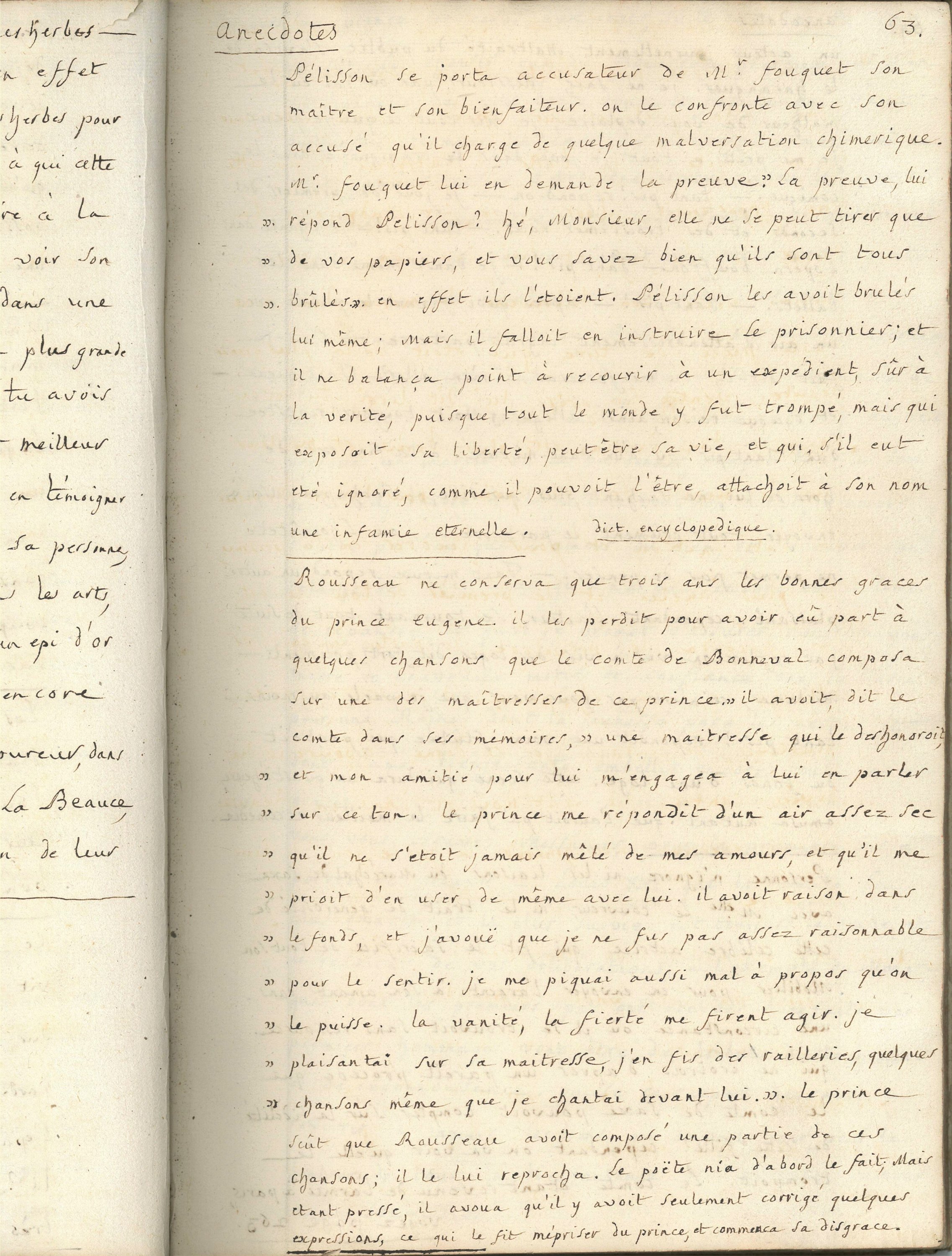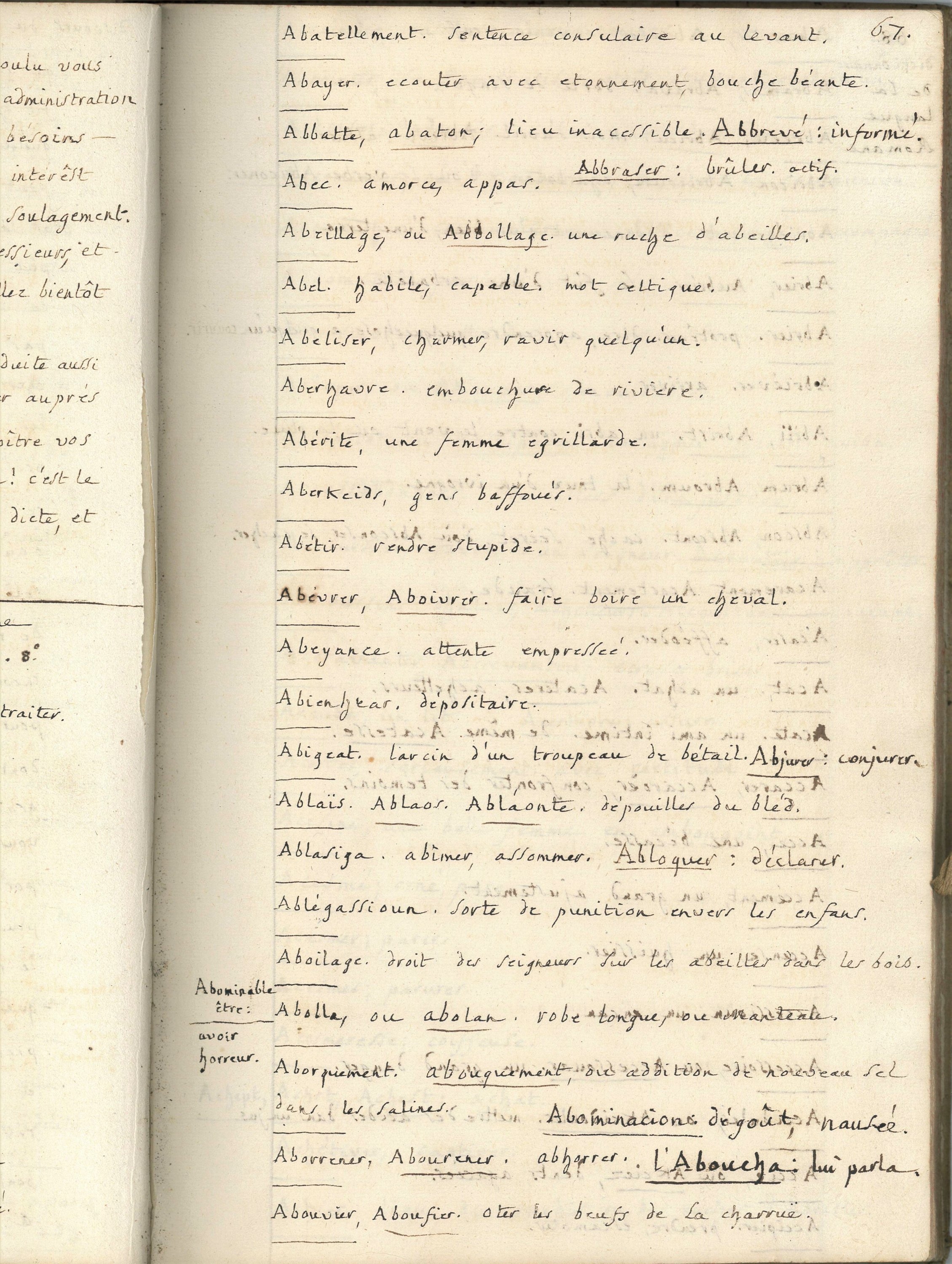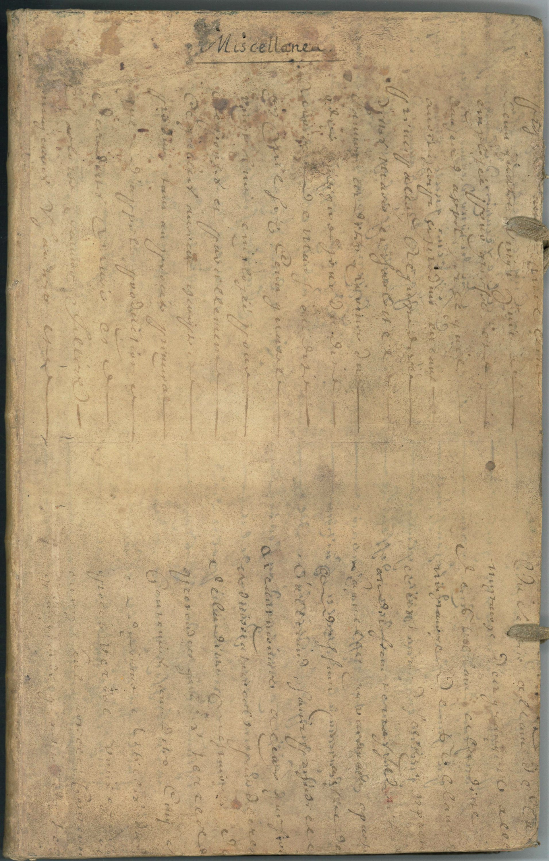 Registre manuscrit in-fol., 269 pp., rel. parchemin, vers 1780, ayant pour titre « Miscelanéa », c’est à dire mélanges littéraires divisés en deux parties ; la première partie (p.1-p. 65) constituée de notes de lecture diverses relatives à des souverains (Louis XVI, Henri IV), papes, anecdotes, bons mots, etc ; la seconde partie (p.66-p.269) est une copie partielle du Dictionnaire de la langue romane, ou du vieux langage françois, par Roman de François Lacombe paru en 1768.
