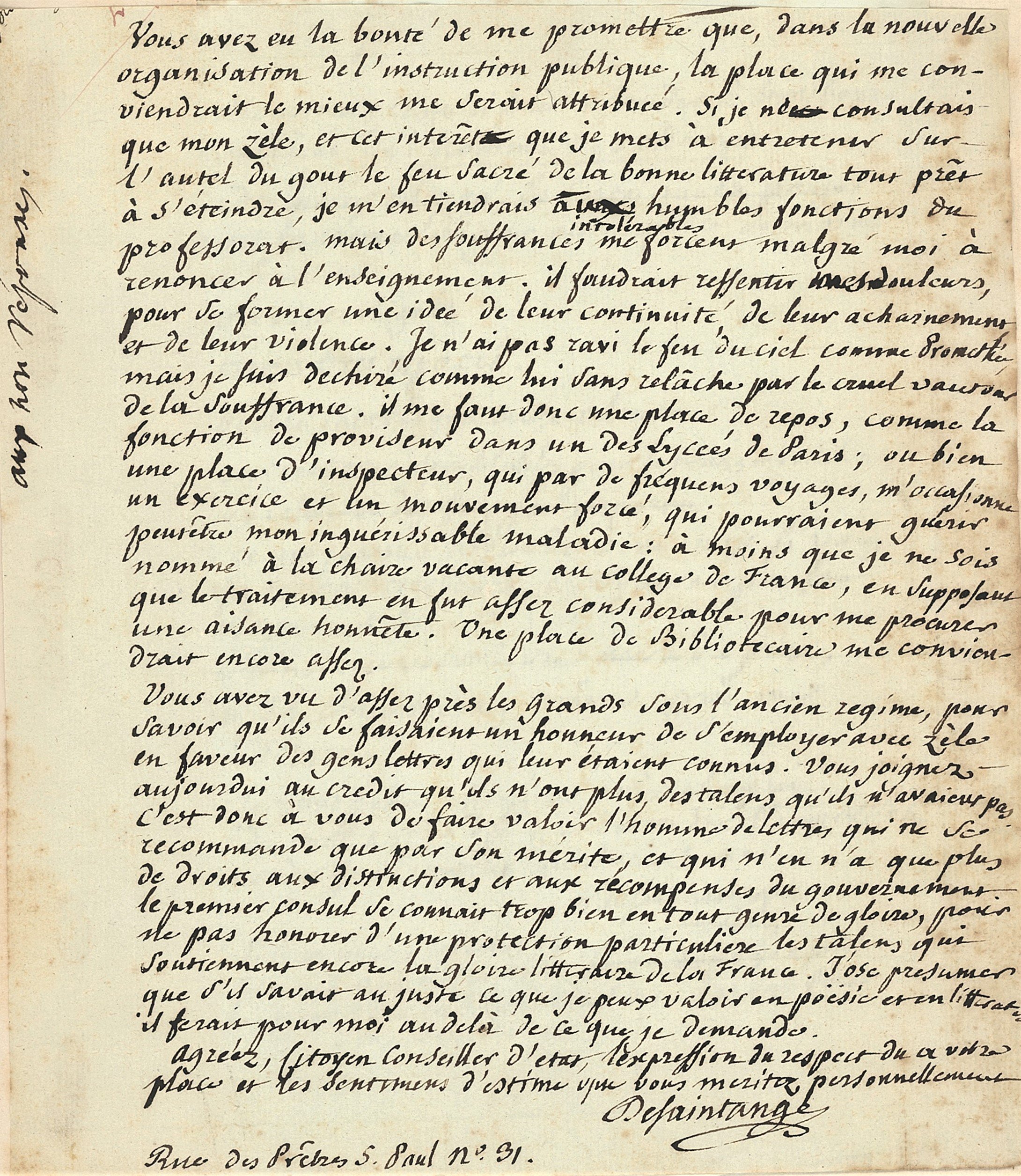L.A.S., [Paris], s.d. [vers 1802], [adressée à Jean Antoine Chaptal, conseiller détat et ministre de lIntérieur], 1 page in-8 ; intéressante lettre dans laquelle de Saint Ange réclame un nouveau poste en dehors de lenseignement dans le cadre de la nouvelle organisation de linstruction publique (loi du 11 floréal an X)