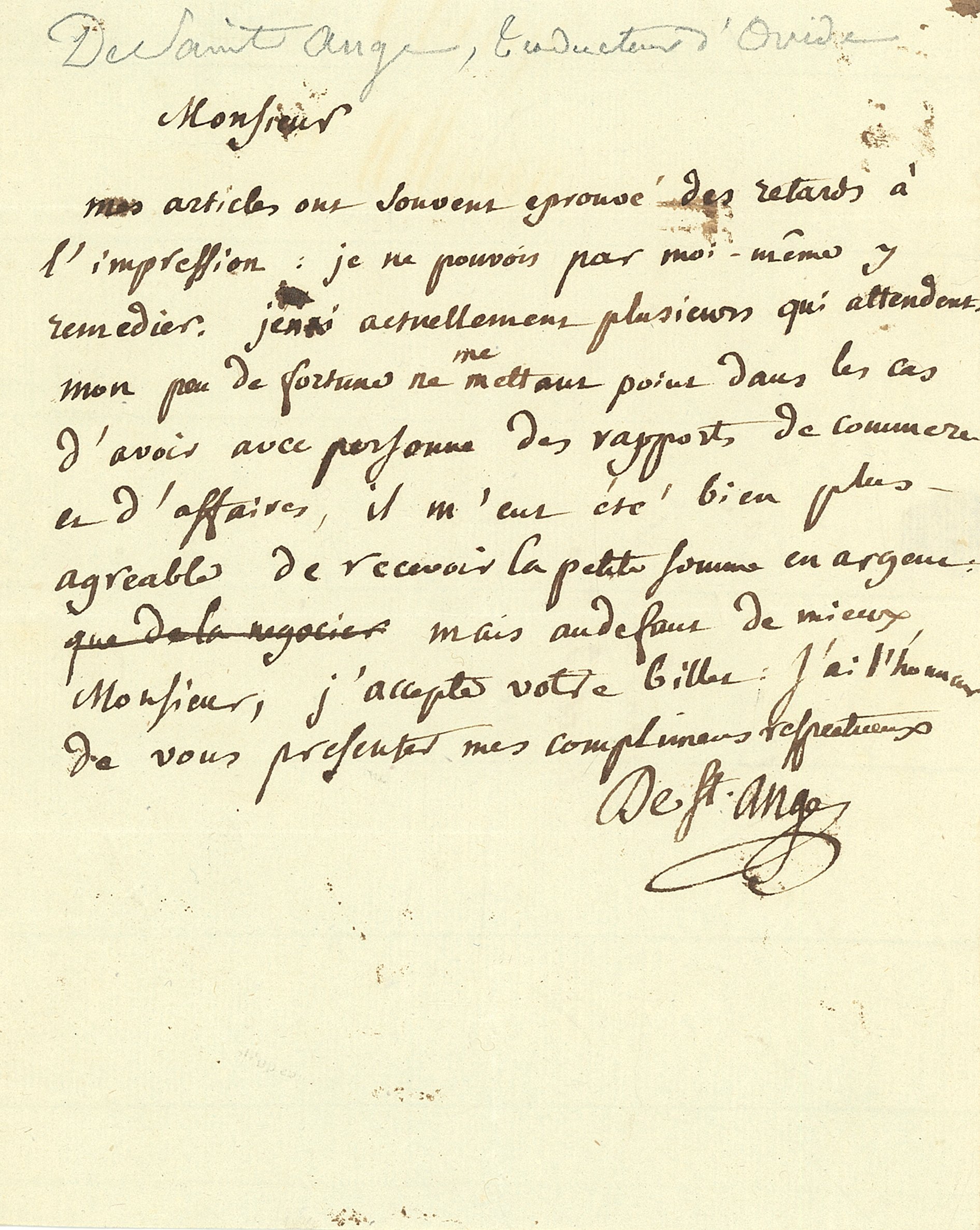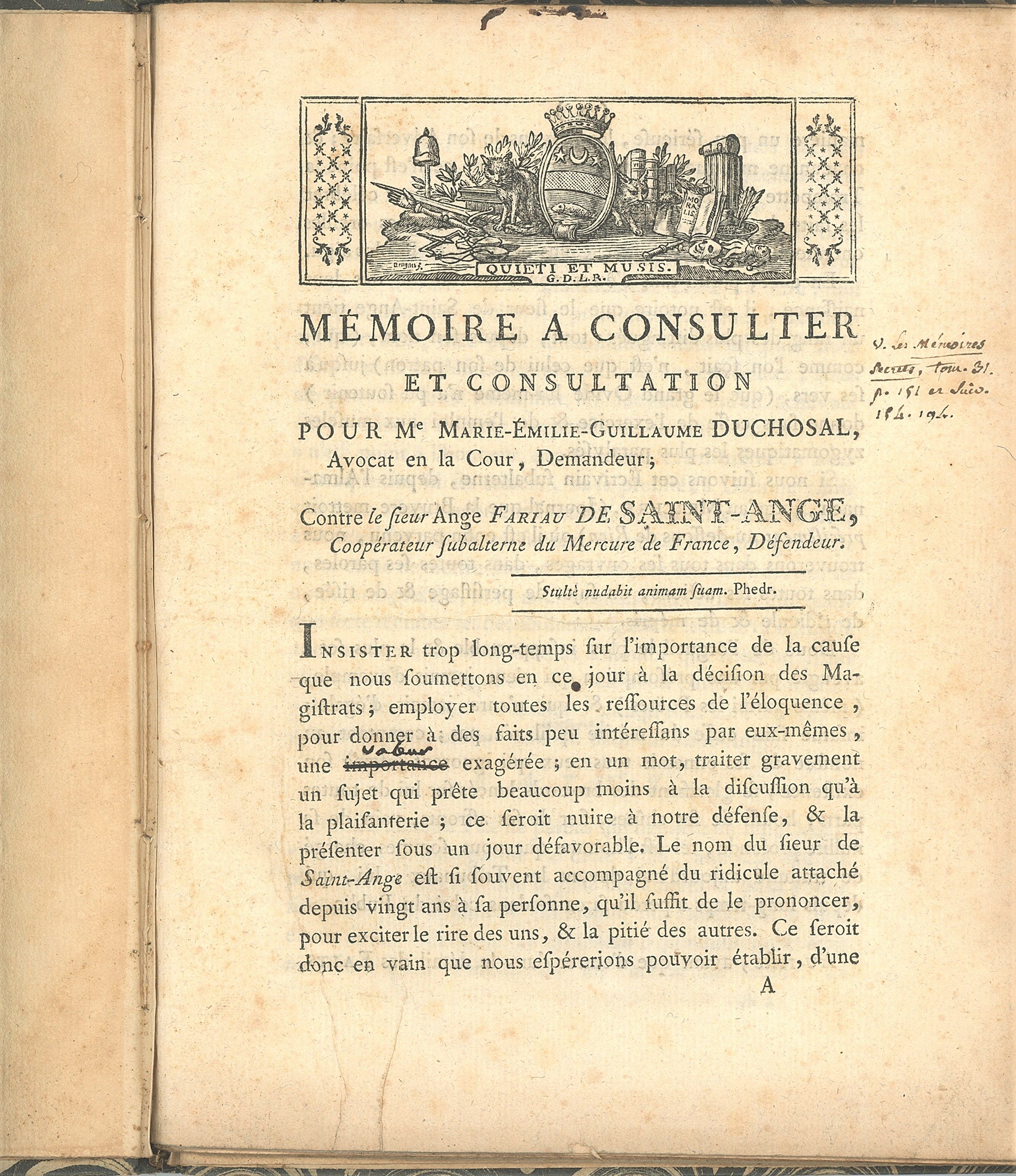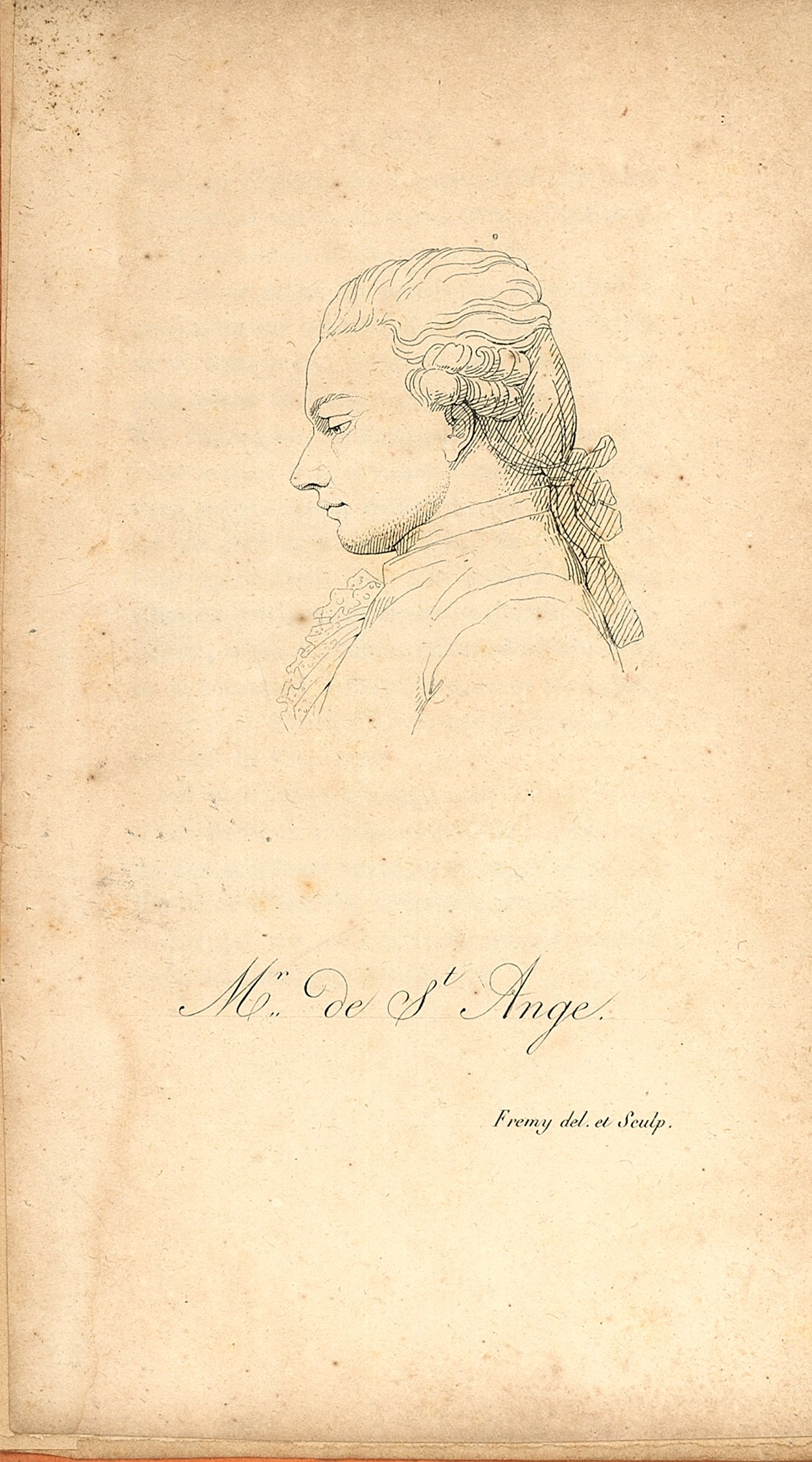 Joint : 3 pièces imprimées dont Mémoire à consulter et consultation pour Me Marie-Emilie-Guillaume Duchosal, avocat en la cour, demandeur, contre le sieur Ange Fariau de Saint-Ange coopérateur subalterne du Mercure de France, défendeur, Paris, Simon & Nyon, 1786, 40 pp. in-4 ; Institut de France Funérailles de M. de Saint-Ange le 10 décembre 1810, 4 pp. in-4 ; Portrait par Fremy.