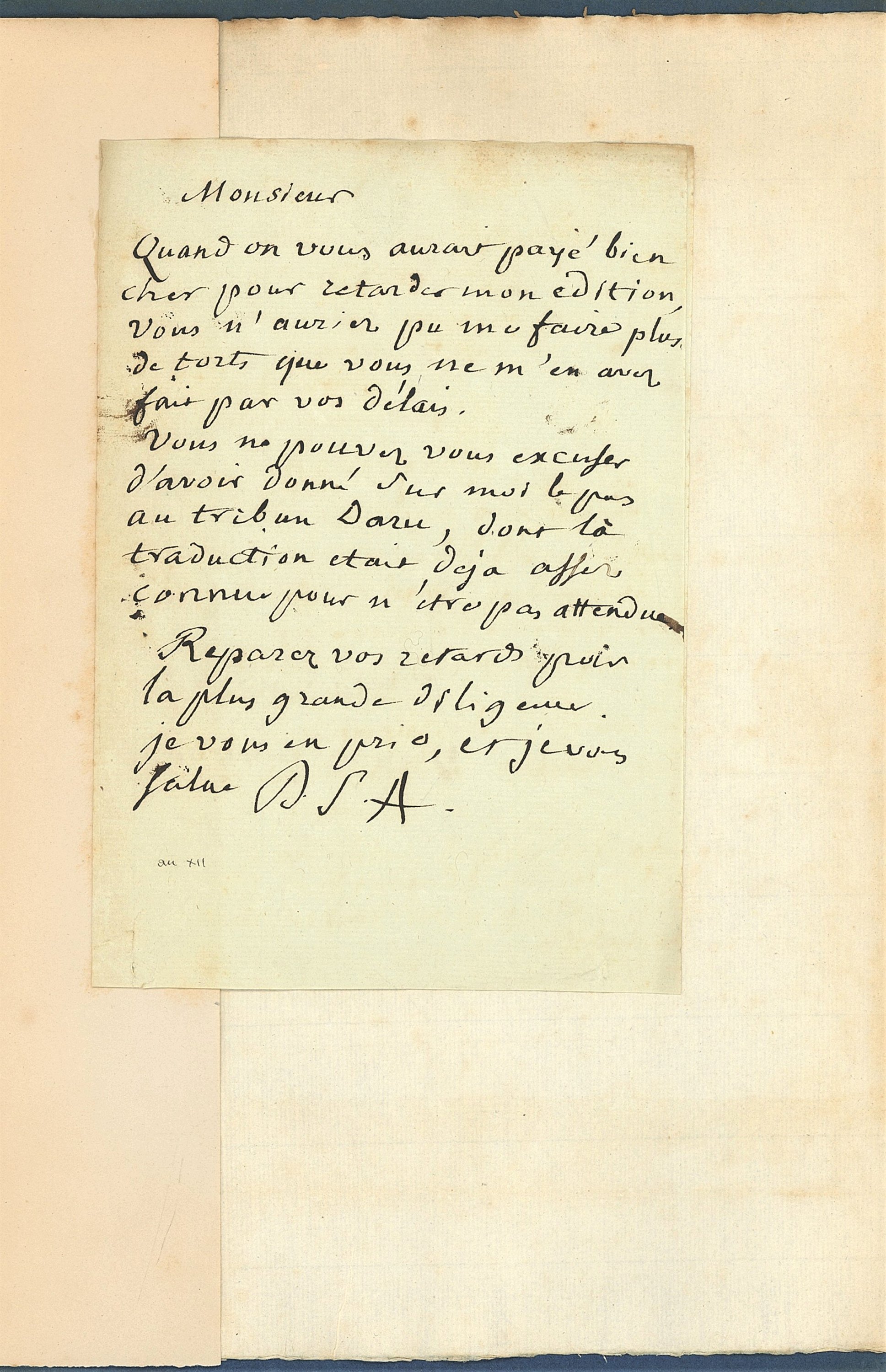 L.A.S., [vers 1804], s.l., adressée à Frédéric Schoell libraire de toutes les productions littéraires de la France et de l'Allemagne., 1 page in-12 ; Plainte du retard pour lune de ses publications