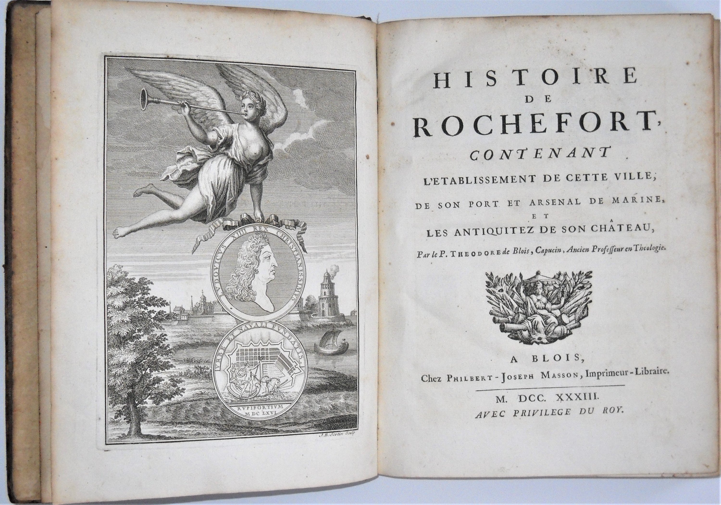 Histoire de Rochefort, contenant létablissement de cette ville, de son port et arsenal de marine, et les antiquitez de son château, Blois, Philbert Joseph Masson, 1733, rel. in-4 plein veau dépoque (en létat, épidermures), xiv-(1)-281-(12) pp., frontispice allégorique par Jean-Baptiste Scotin (qqs rousseurs).