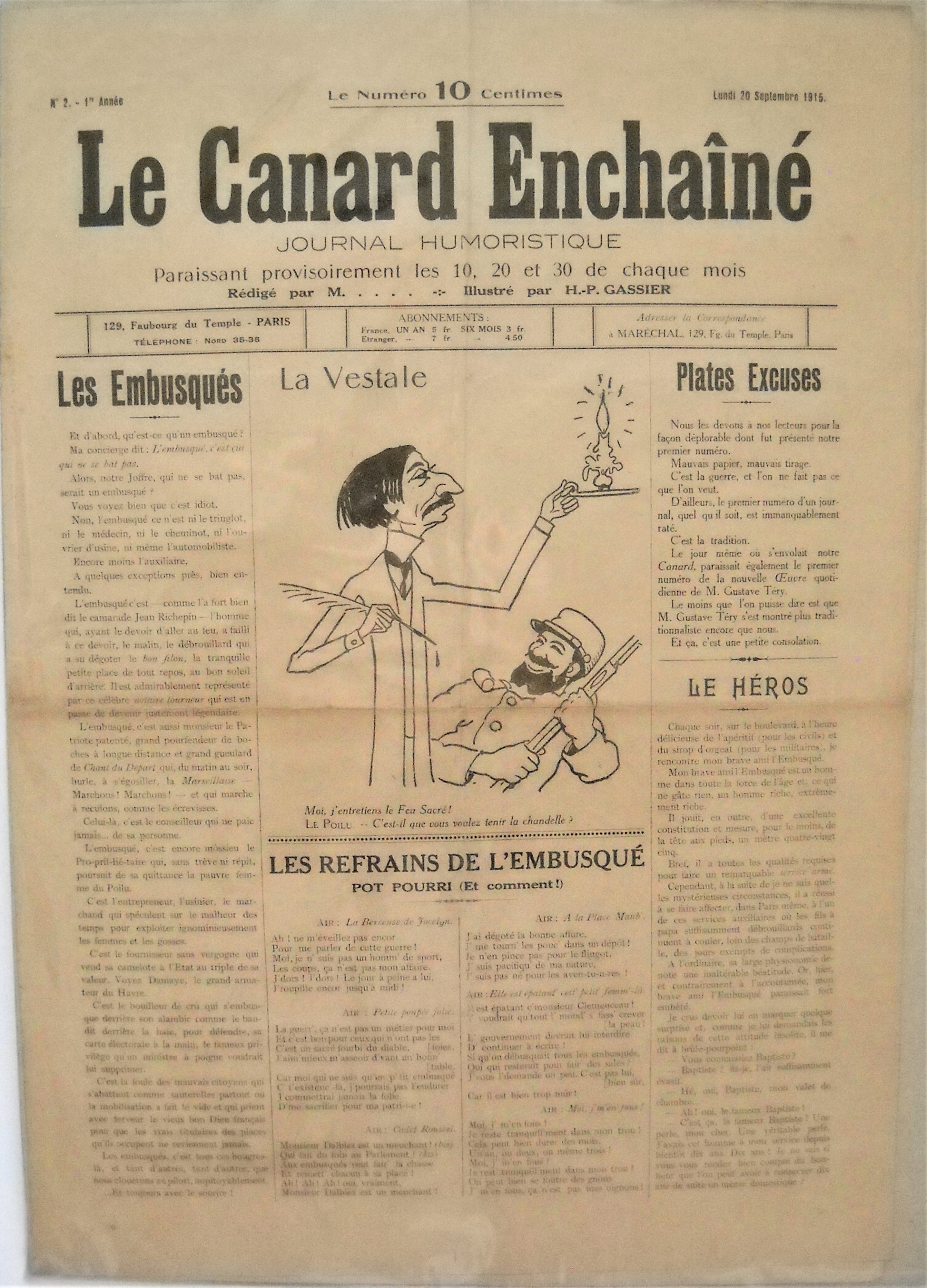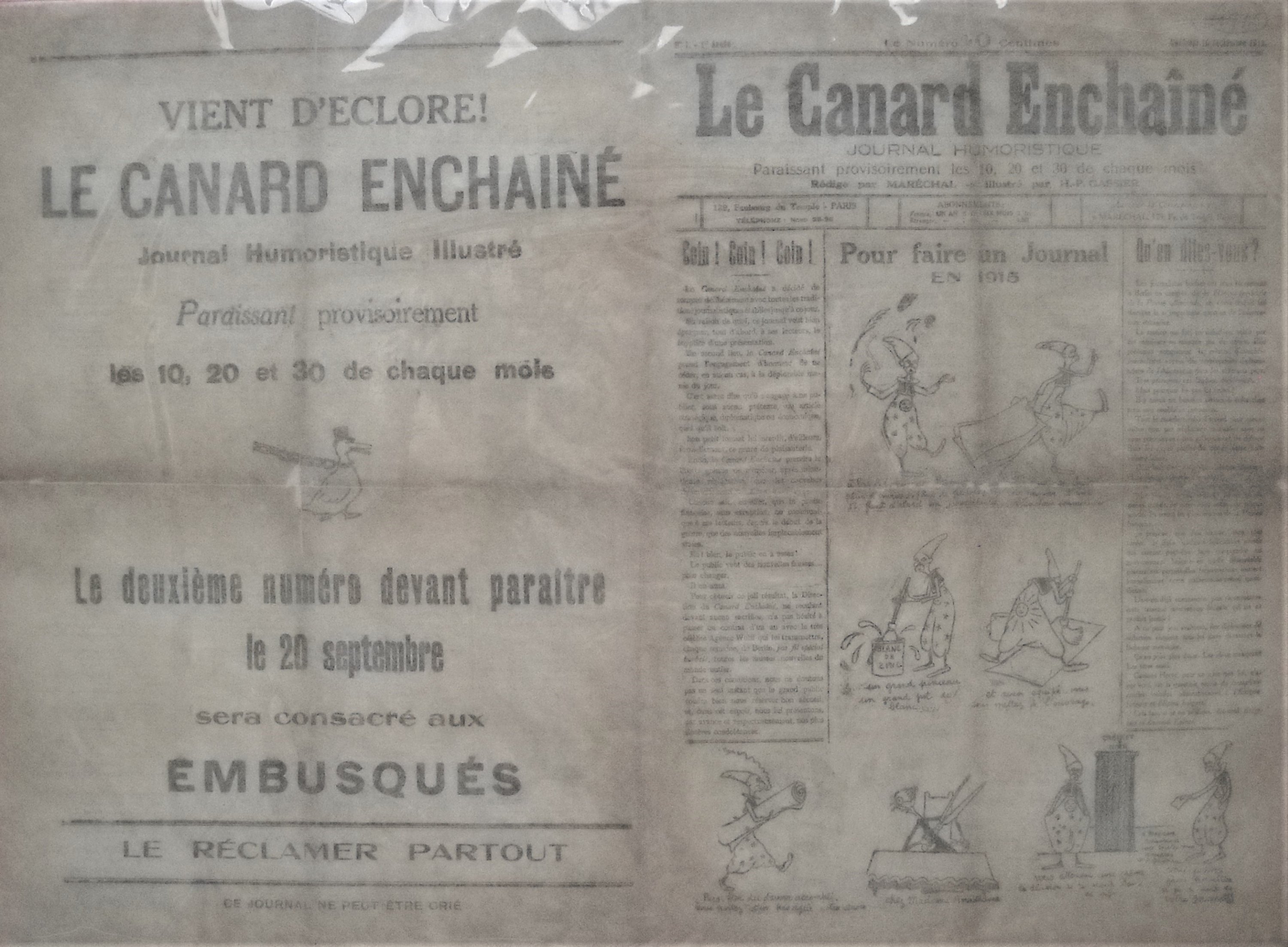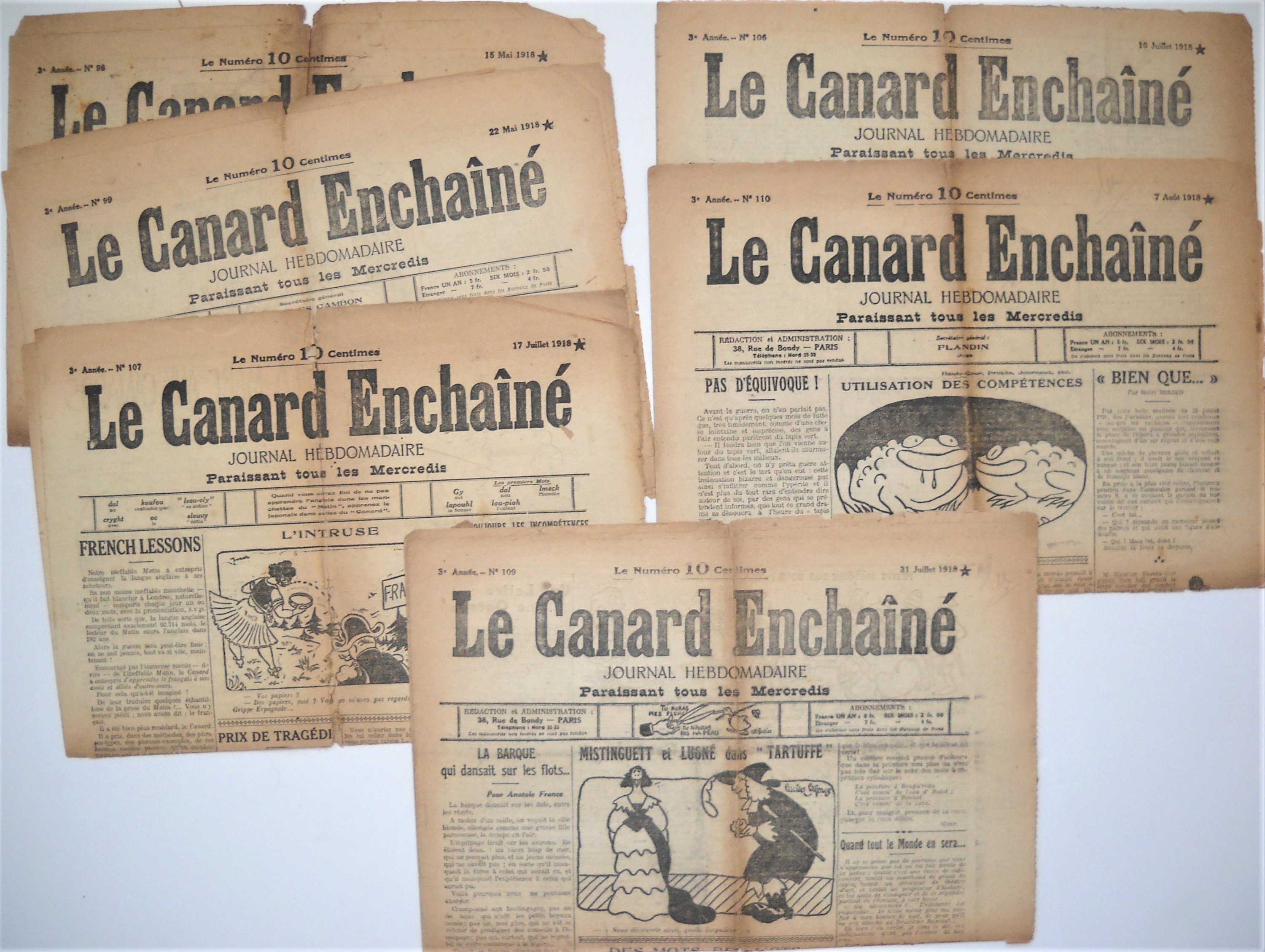 Le premier numéro du journal hebdomadaire Le Canard Enchaîné paru le 10 septembre 1915, 4 pages in-folio (restaurées et renforcées) ; rarissime exemplaire, il existe peu dexemplaires dépoque en raison de la fragilité du papier utilisé pour limpression durant la Grande guerre ;