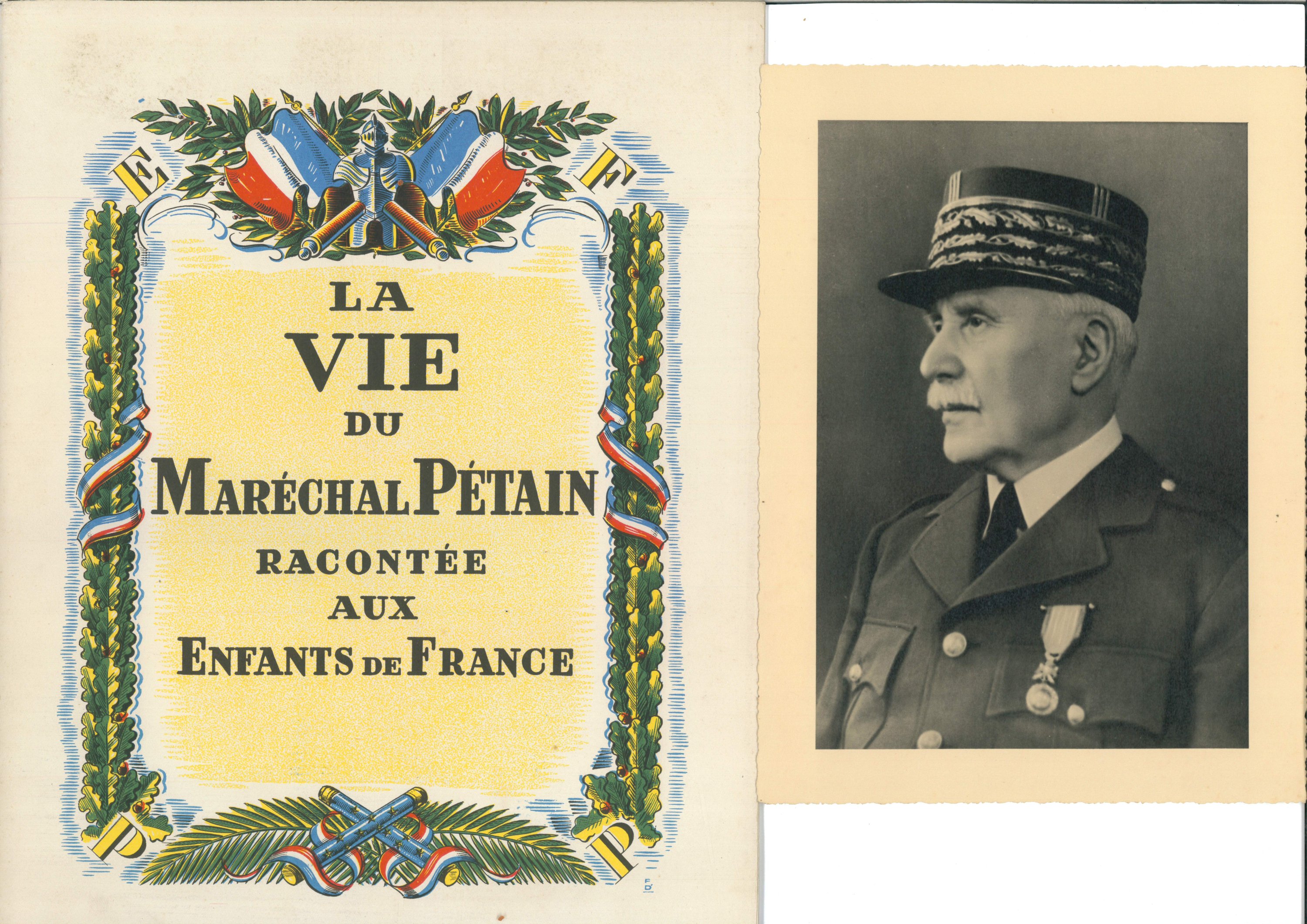La vie du maréchal Pétain racontée aux enfants de France, Edit. de la Vraie France, Nice, [1943/1944], illustrations en couleurs par Mario Simon et Francis Dujardin, 28 pages in-fol. ; avec un prospectus « Concours réservé aux enfants de France Le plus bel encadrement au portrait du maréchal », 1 page in-fol., et un portrait du maréchal Pétain, 23,5 x 17,5 cm.