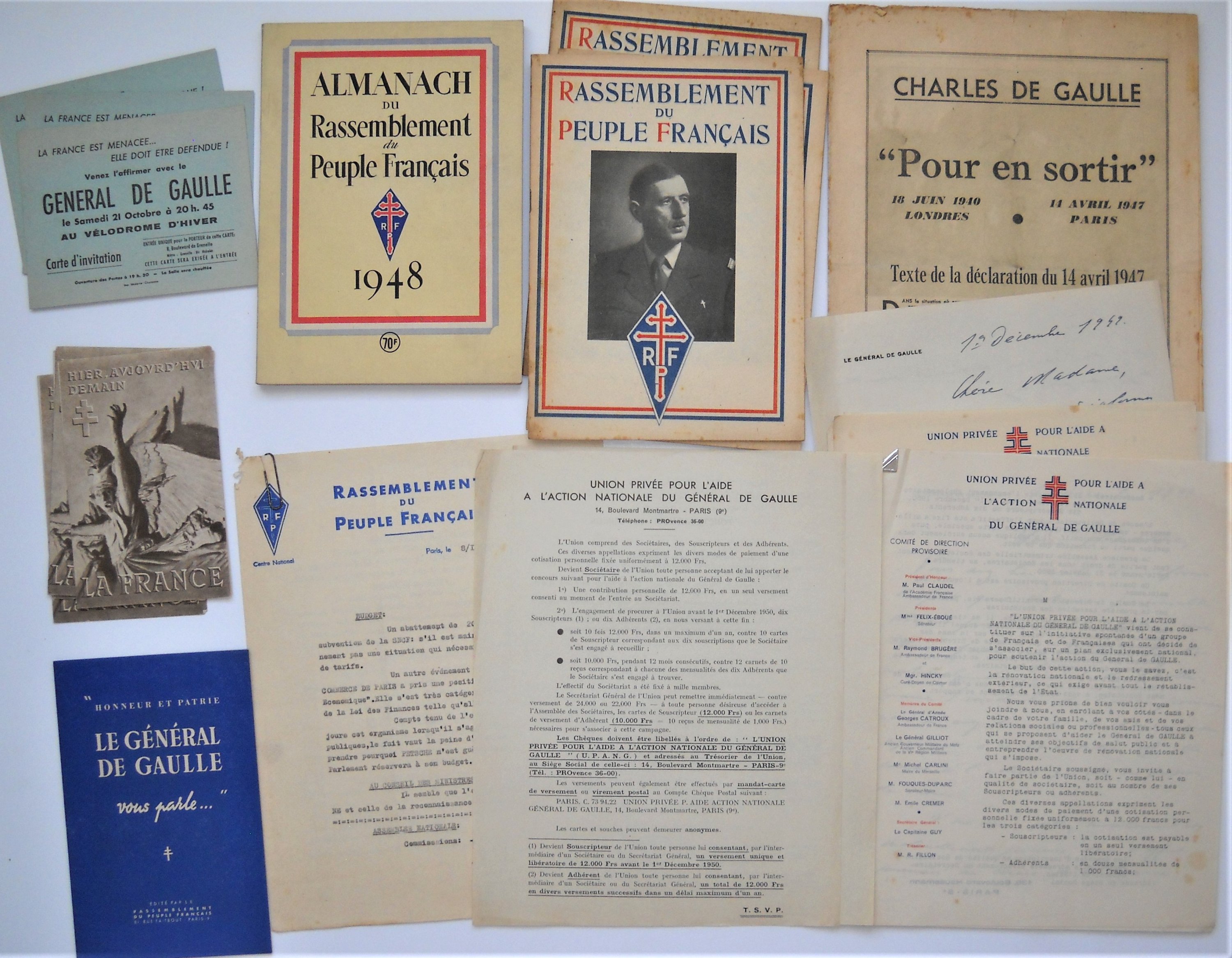 Pour s’en sortir, texte de la déclaration du 14 avril 1947 ; Honneur et Patrie, Le Général de Gaulle vous parle… (1947) ; 3 ex. du fascicule Rassemblement du Peuple Français (1947) ; Almanach du Rassemblement du Peuple Français (1948) ; Affiche du 11 février 1950, De Gaulle s’adressera au peuple de Paris, Vélodrome d’hiver, 60 x 40 cm ; 3 ex. carte d’invitation au Conseil national du RPF du 21 octobre 1950 ; 4 fascicules Hier, Aujourd’hui, Demain, La France (Législatives de 1951) + divers documents imprimés dont « Union privée pour l’aide à l’action nationale du général de Gaulle ».