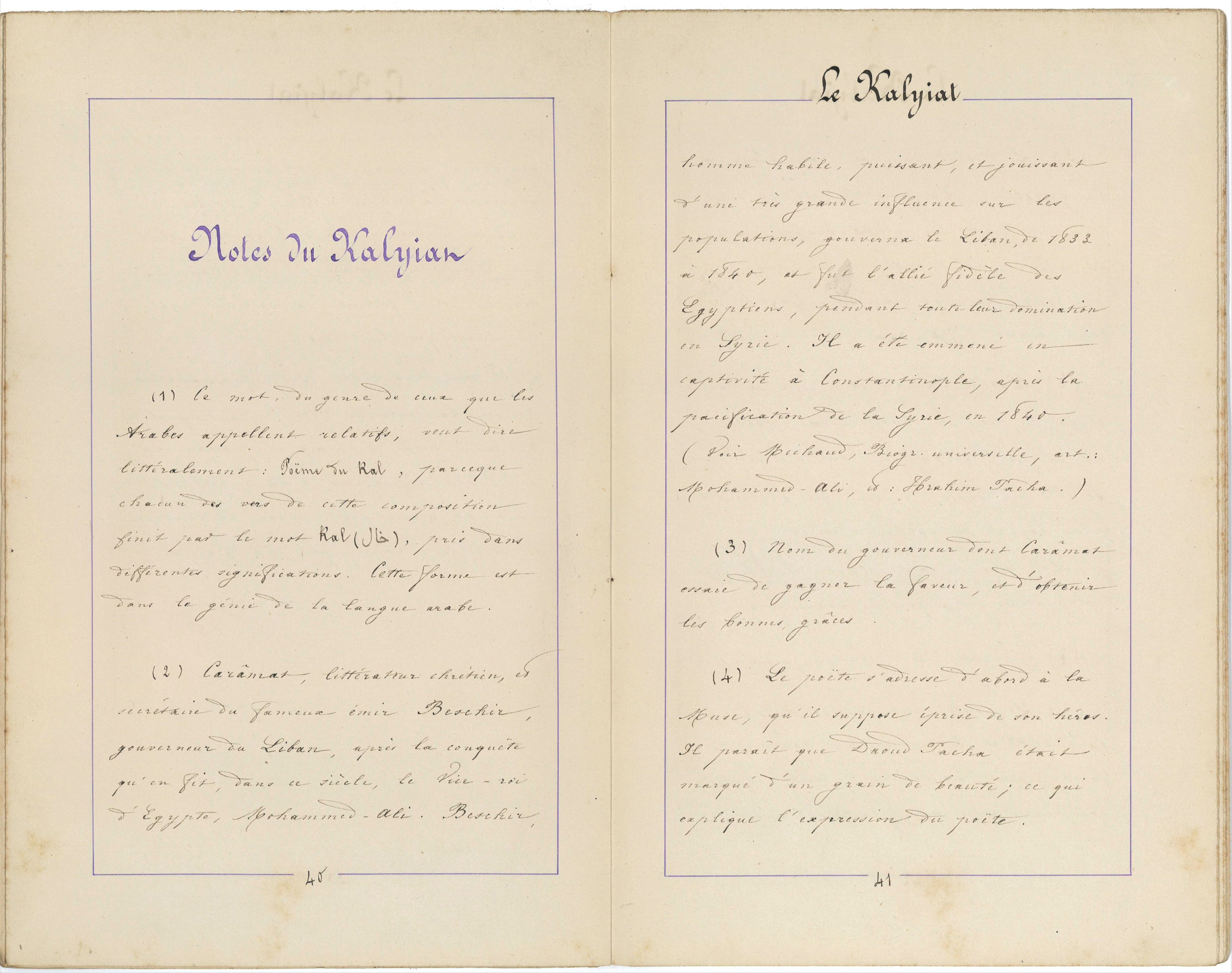 Cahier manuscrit in-4, 73 pp., fin du 19e siècle ; Copie manuscrite à lencre brune et violette, en français et en arabe, de 2 poèmes libanais :