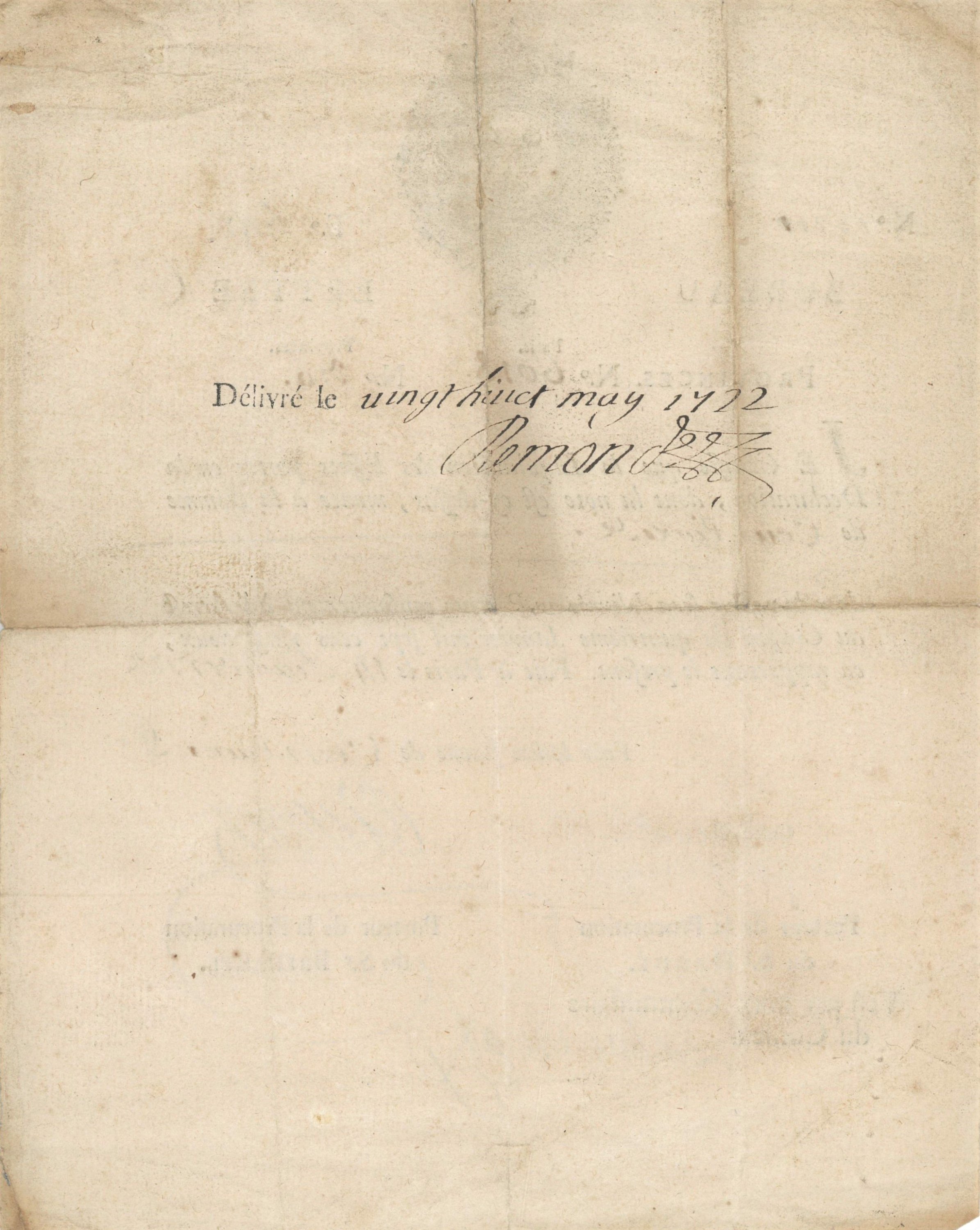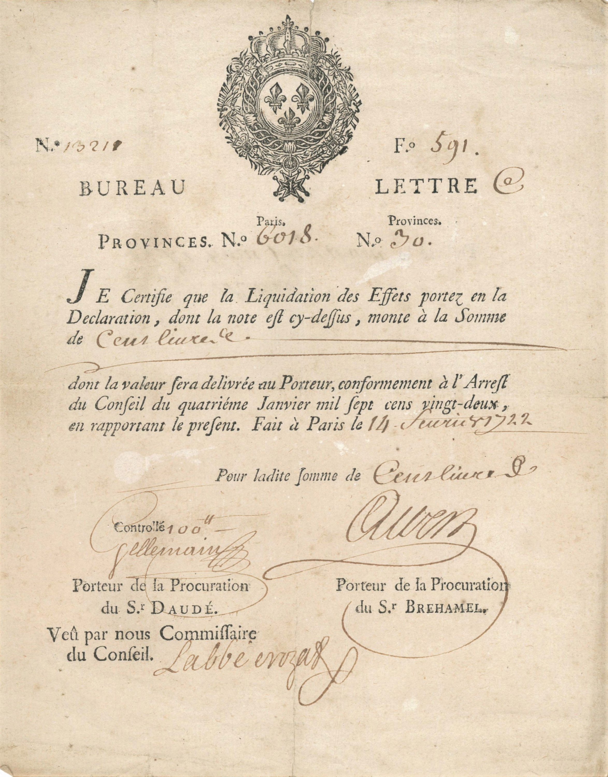Rarissime « bureau-lettre » ou certificat de liquidation émis le 14 février 1722 pour une valeur de 100 livres, signé par Jean-Baptiste Crozat, abbé de Genlis, 19,5 x 15,5 cm.
