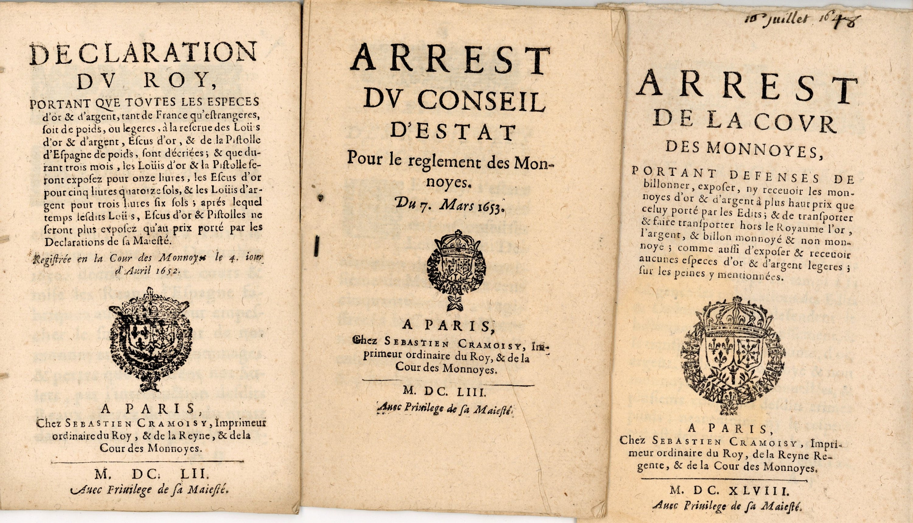Déclaration du roi portant sur les monnaies dor et dargent, avril 1652, Chez Sébastien Cramoisy, Paris, 15 pp. in-12 ; Arrêt du conseil détat pour le règlement des monnaies, 7 mars 1653, Chez Sébastien Cramoisy, 14 pp. in-12 ; Arrêt de la cour des monnaies portant défenses de billonner, exposer, ni recevoir les monnaies dor et dargent à plus haut prix que celui porté par les édits