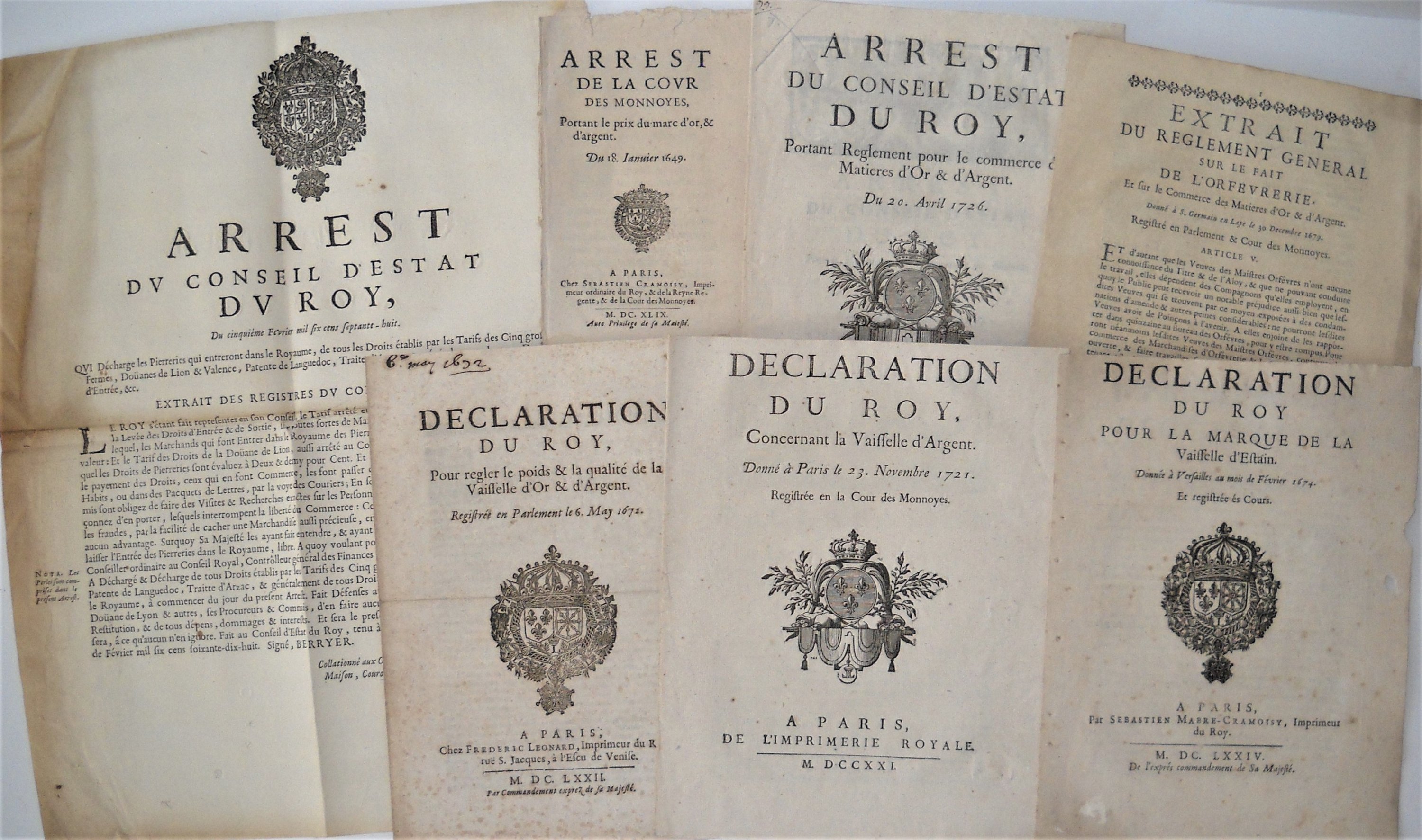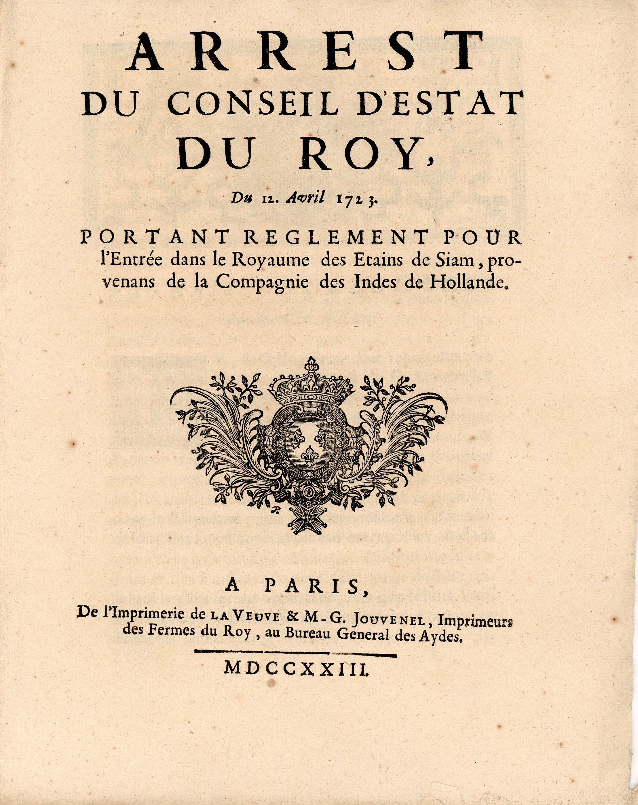 , placard, 40 x 30 cm ; Arrêt du conseil détat du roi portant règlement pour lentrée dans le royaume des étains de Siam, provenant de la Compagnie des Indes de Hollande, 12 avril 1723, 7 pp. in-4 ; 3 déclarations du roi portant sur la vaisselle dor, dargent et détain, 1672, 1674 et 1721 ; 2 arrêts portant sur le commerce des matières dor et dargent.