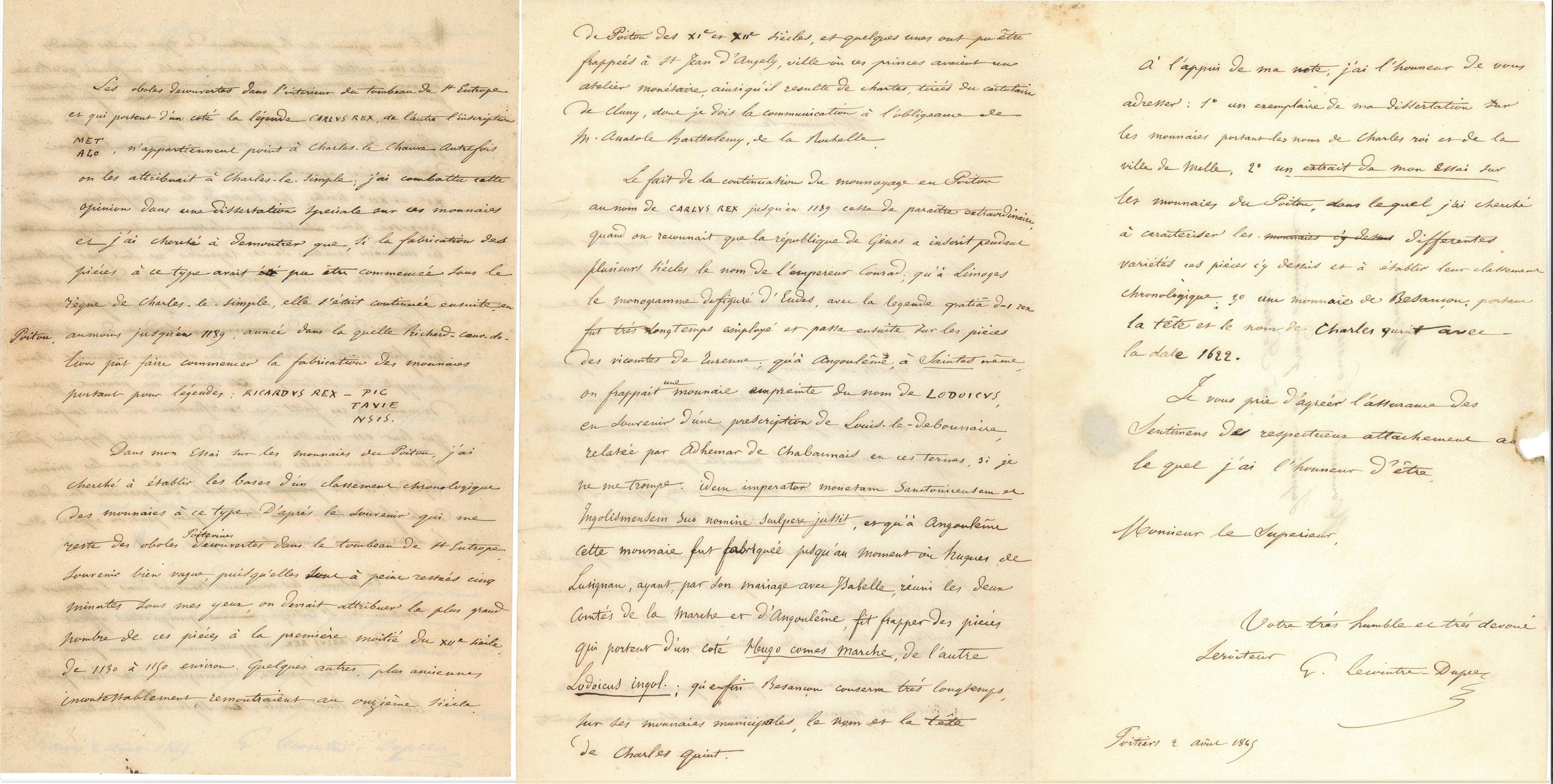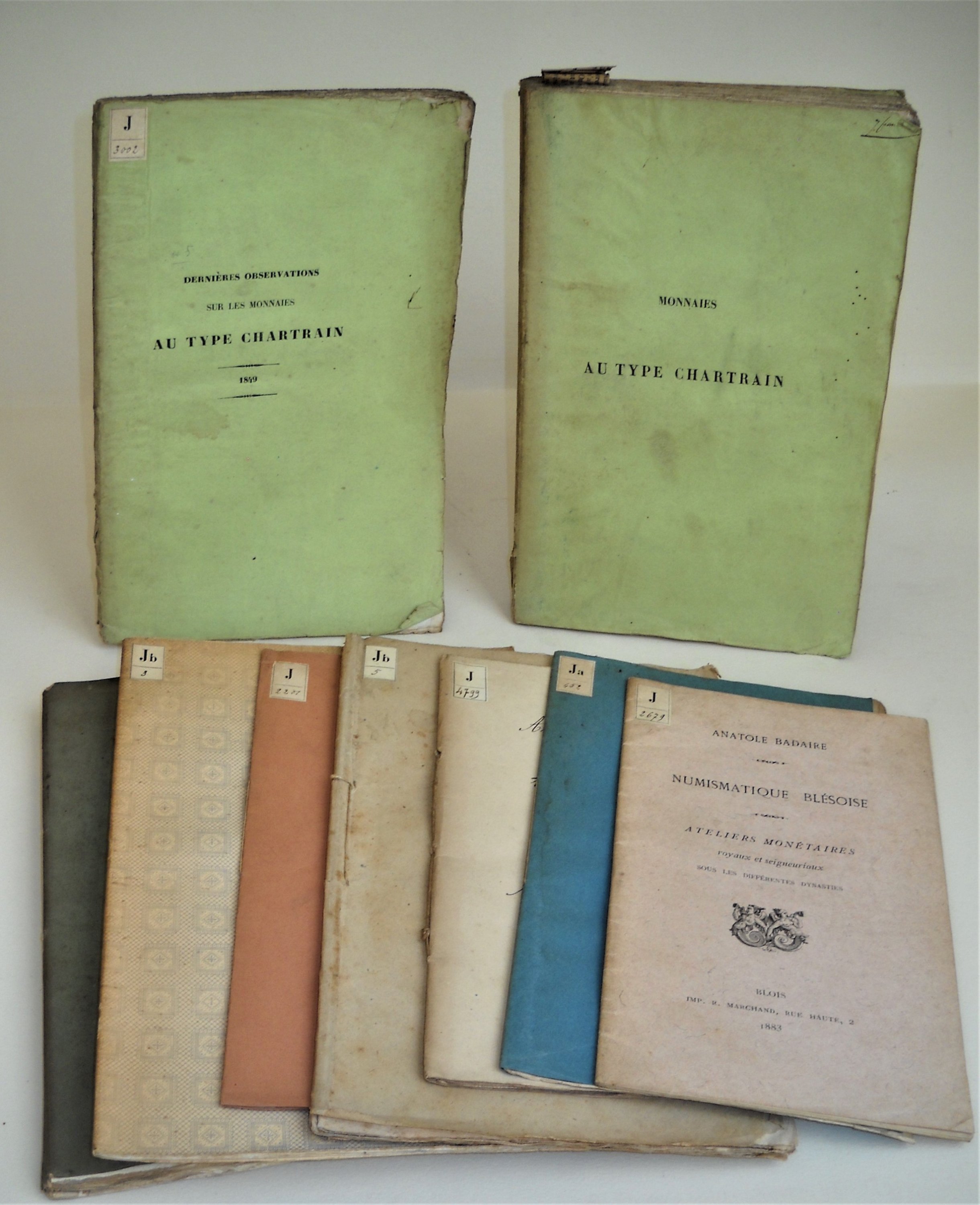 et dans les communes de Baccon, Cravant, Josnes, et Orléans, Roret, Paris, 1833, 20 pp. et 1 pl. dépl. ; Lecointre-Dupont, Dissertation sur des monnaies portant les noms de Charles roi de la ville de Melle, Dézairs, Blois, 1840, 28 pp., avec 2 L.A.S. dont une de Lecointre-Dupont, 6 pp. in-8, datée du 2 août 1845 et adressée au supérieur du grand séminaire de Poitiers, sur lexamen de monnaies féodales confiées ; Louis de La Saussaye, Mélanges de numismatique, Dézairs, Blois, 1841, 106 pp. et pl. h.t. (incomplet) , Fillon et de Chasteigner, Mémoires sur des monnaies du Moyen-Age, Dézairs, Blois, 1844, 35 pp. ; Cartier, Recherches sur les monnaies au type chartrain frappées à Chartres, Blois, Vendôme, etc, Rollin, Paris, 1846, 237 pp. et 7 pl. h.t. ; Cartier, Dernières observations sur les monnaies au type chartrain, 1849, 48 pp. avec 2 pl. h.t. ; Huron, Notice sur quelques monnaies tirées dune petite collection, Lemercier, Vendôme, 1856, 16 pp. ; Badaire, Numismatique blésoise, ateliers monétaires royaux et seigneuriaux, Blois, 1883, 29 pp. ; etc.