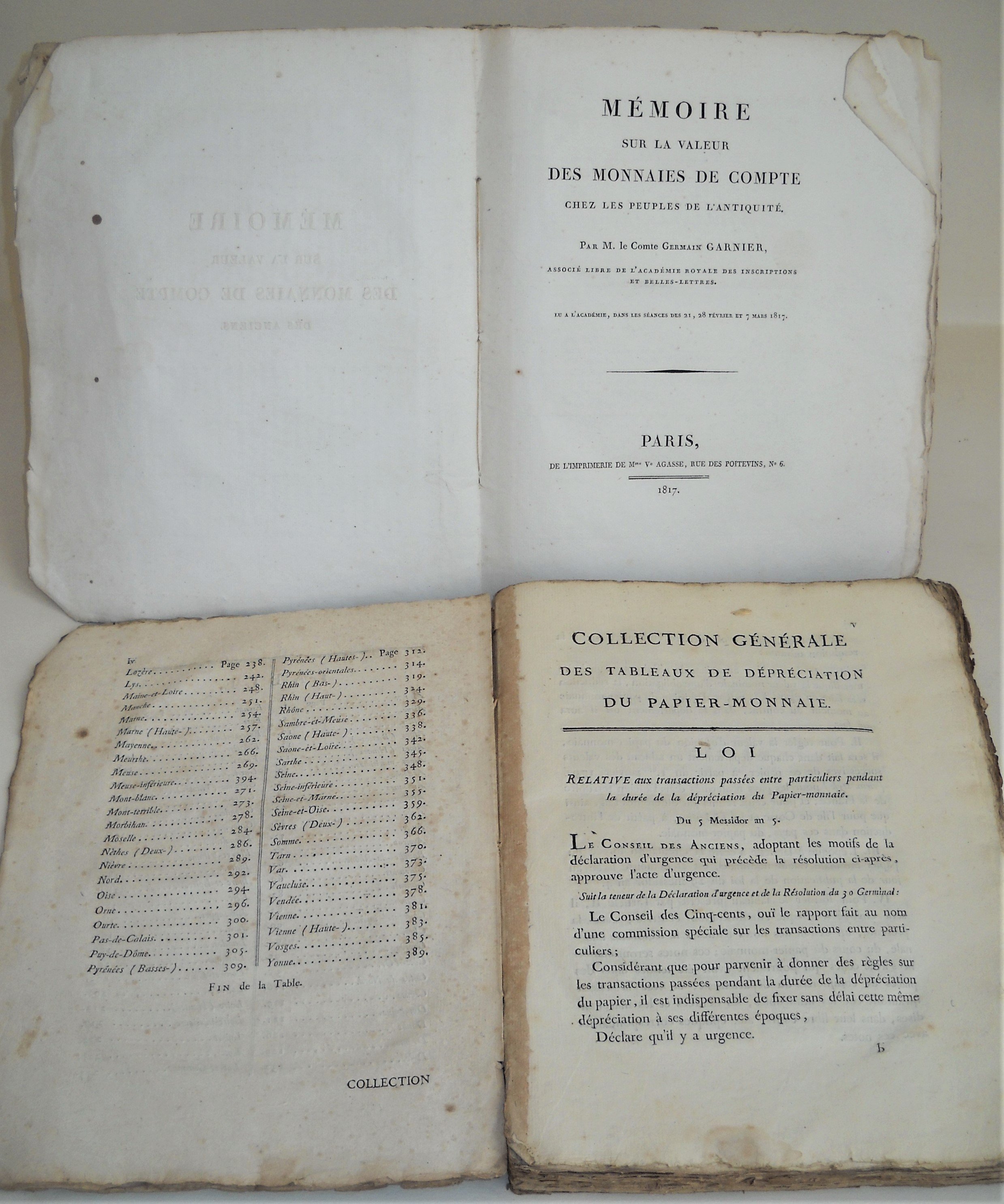 Collection générale des tableaux de dépréciation du papier-monnaie, Imp. de la République, Ventôse an VI [1798], Paris, 395 pp. ; Millin, Description dun sceau dor de Louis XII, Paris, Wasermann, 1814, 29 pp. ; Comte Germain Garnier, Mémoire sur la valeur des monnaies de compte chez les peuples d lAntiquité, Vve Agasse, Paris, 1817, 91 pp. ; Vergnaud-Romagnési, Mémoire sur des médailles romaines