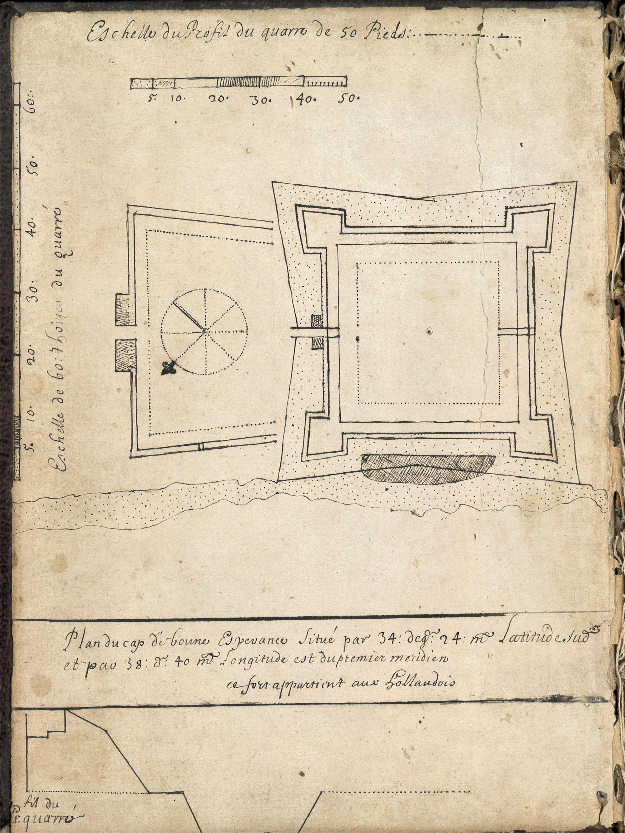 Sur la première contregarde, il est dessiné à la plume un « Plan du Cap de Bonne espérance » avec échelles et accompagné dun profil.