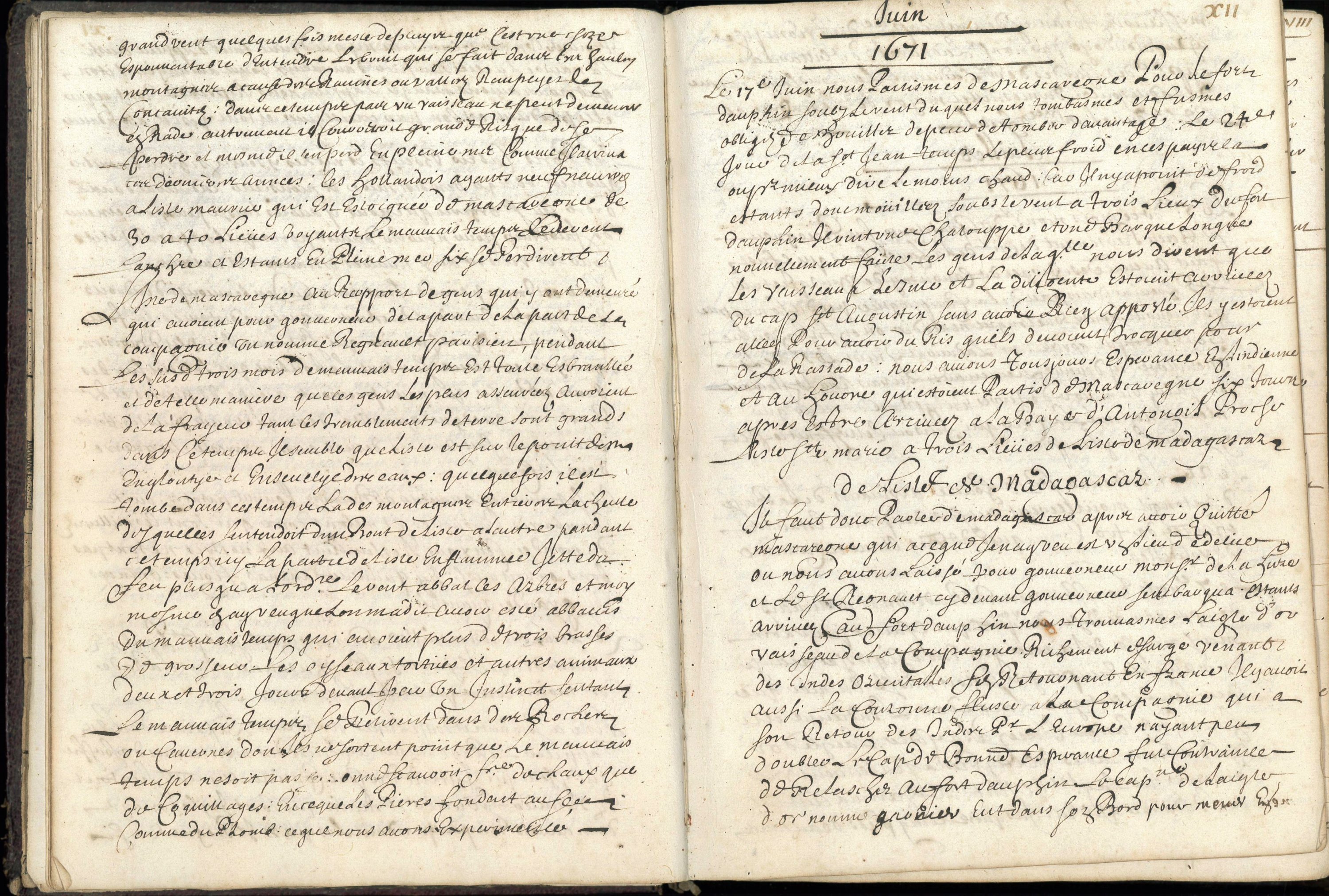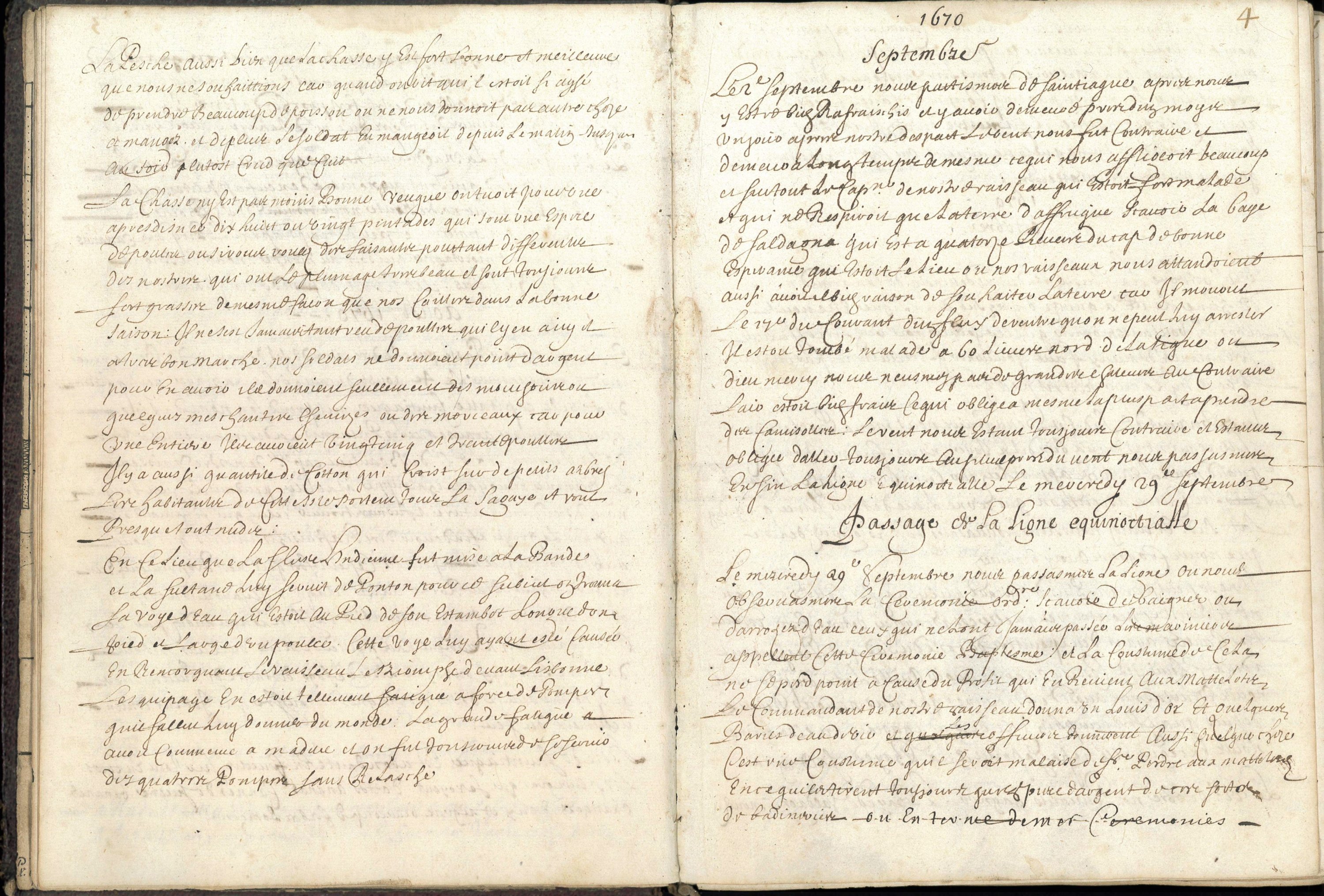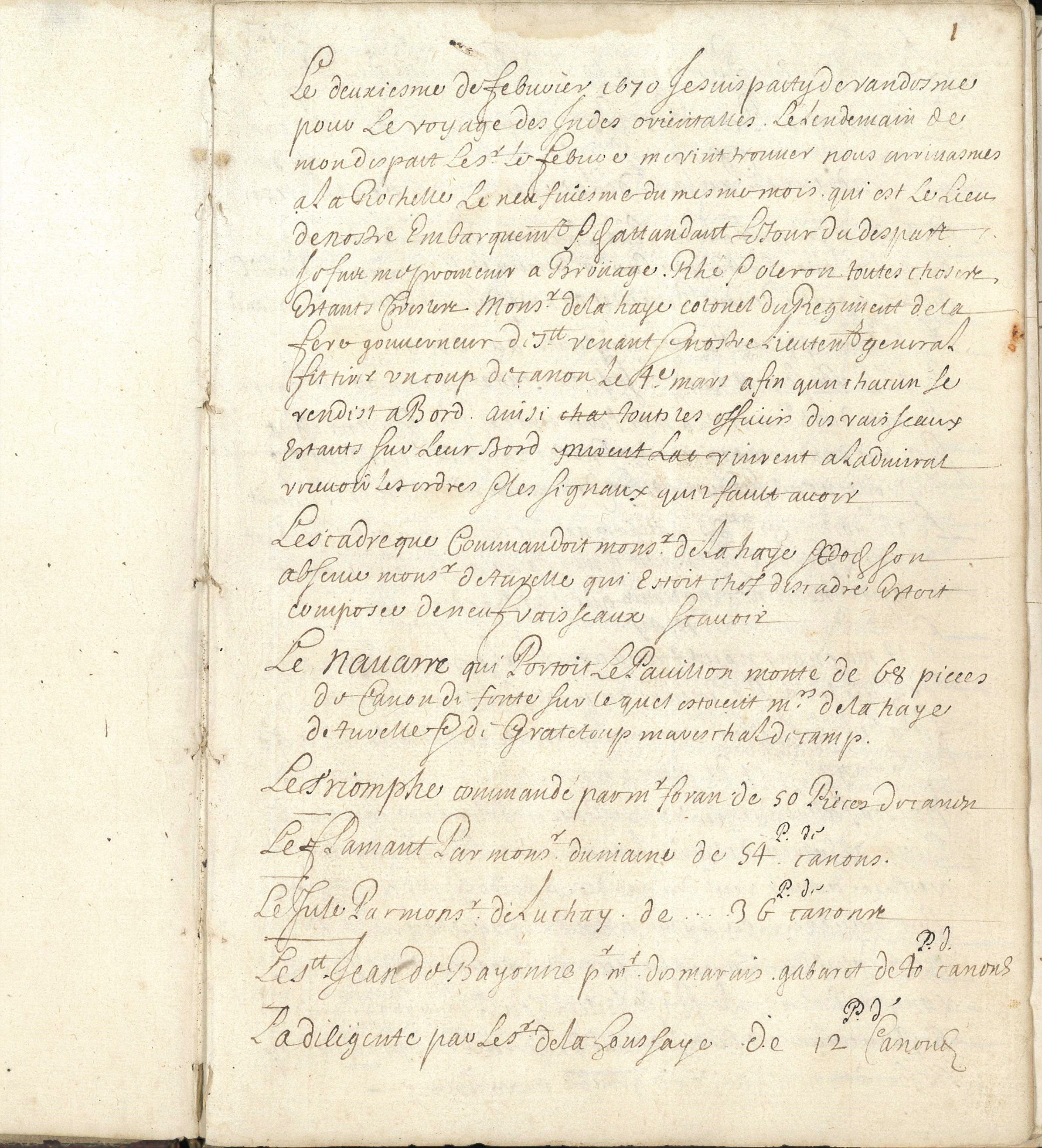 La première partie de la relation de voyage dans les Indes est paginée et débute au fol.1 (5e feuillet) par « Le deuxième de febvrier 1670 je suis party de vandosme pour le voyage des Indes orientales