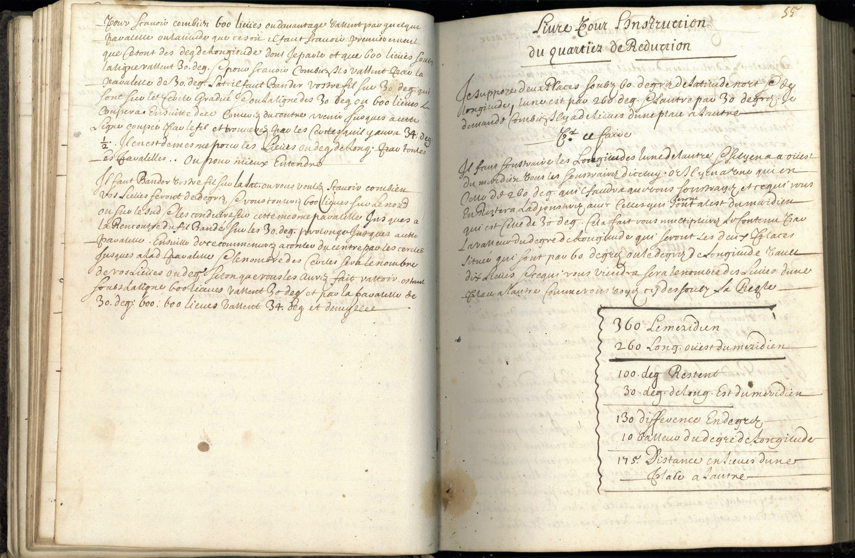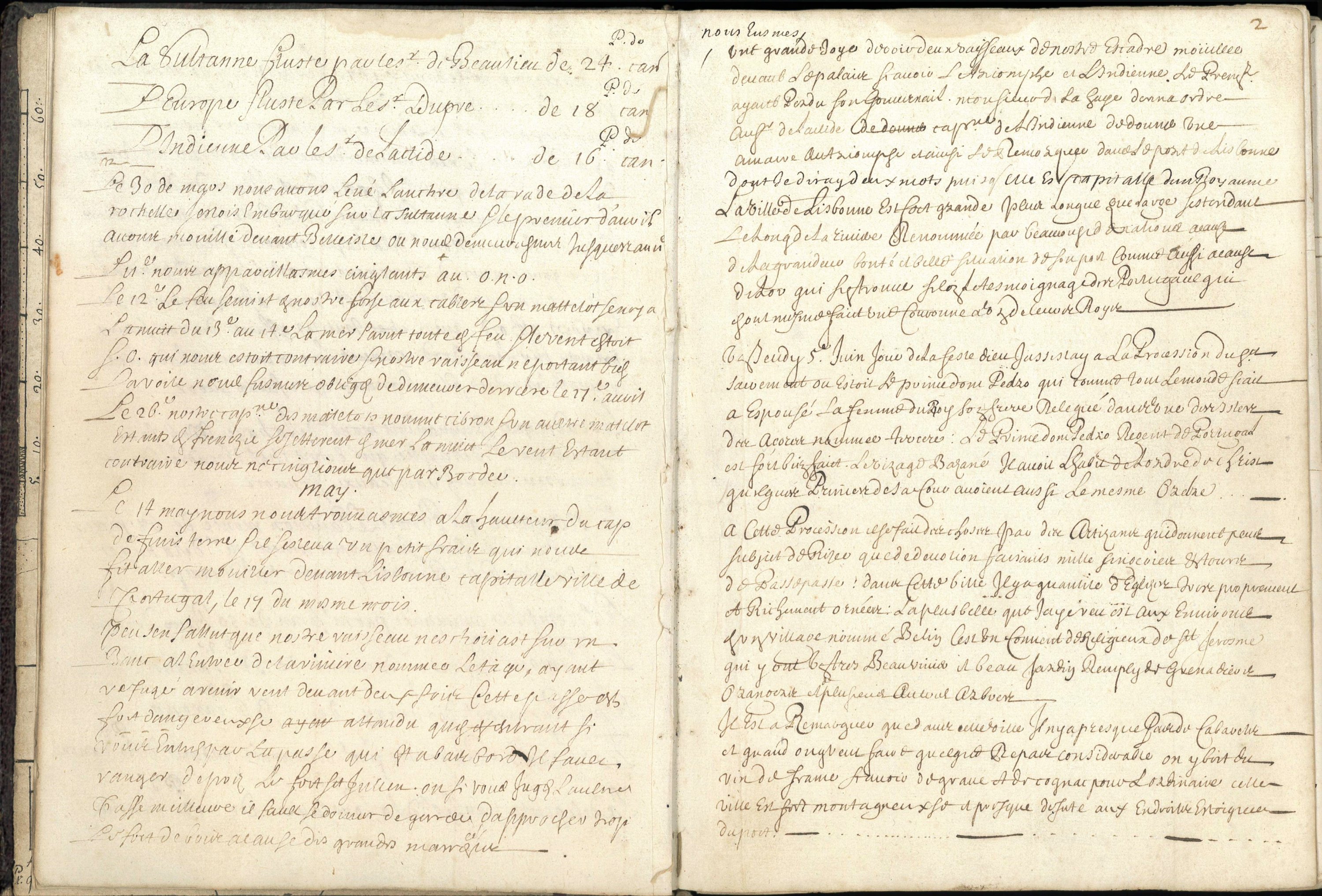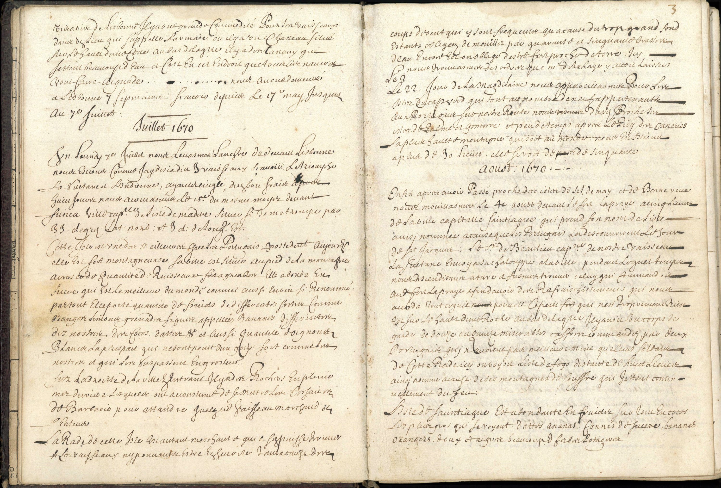 Recueil écrit entièrement de la main de Louis-Auguste Bellanger de Lespinay, qui est composé d'un récit en deux parties narrant son expédition dans les Indes Orientales de 1670 à 1675, et de plusieurs courtes notes abordant différents sujets ayant trait pour certains au métier des armes et à la marine.