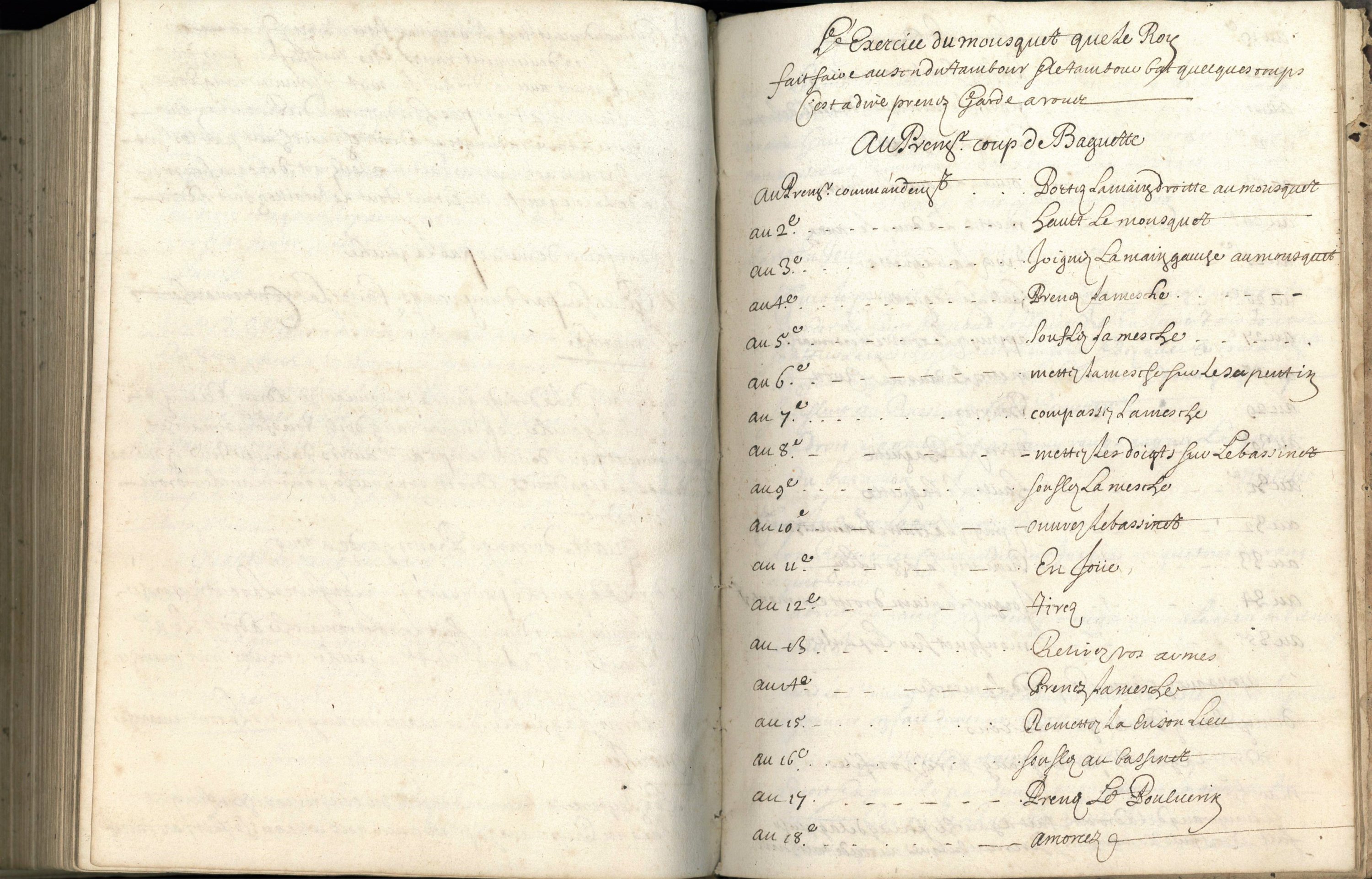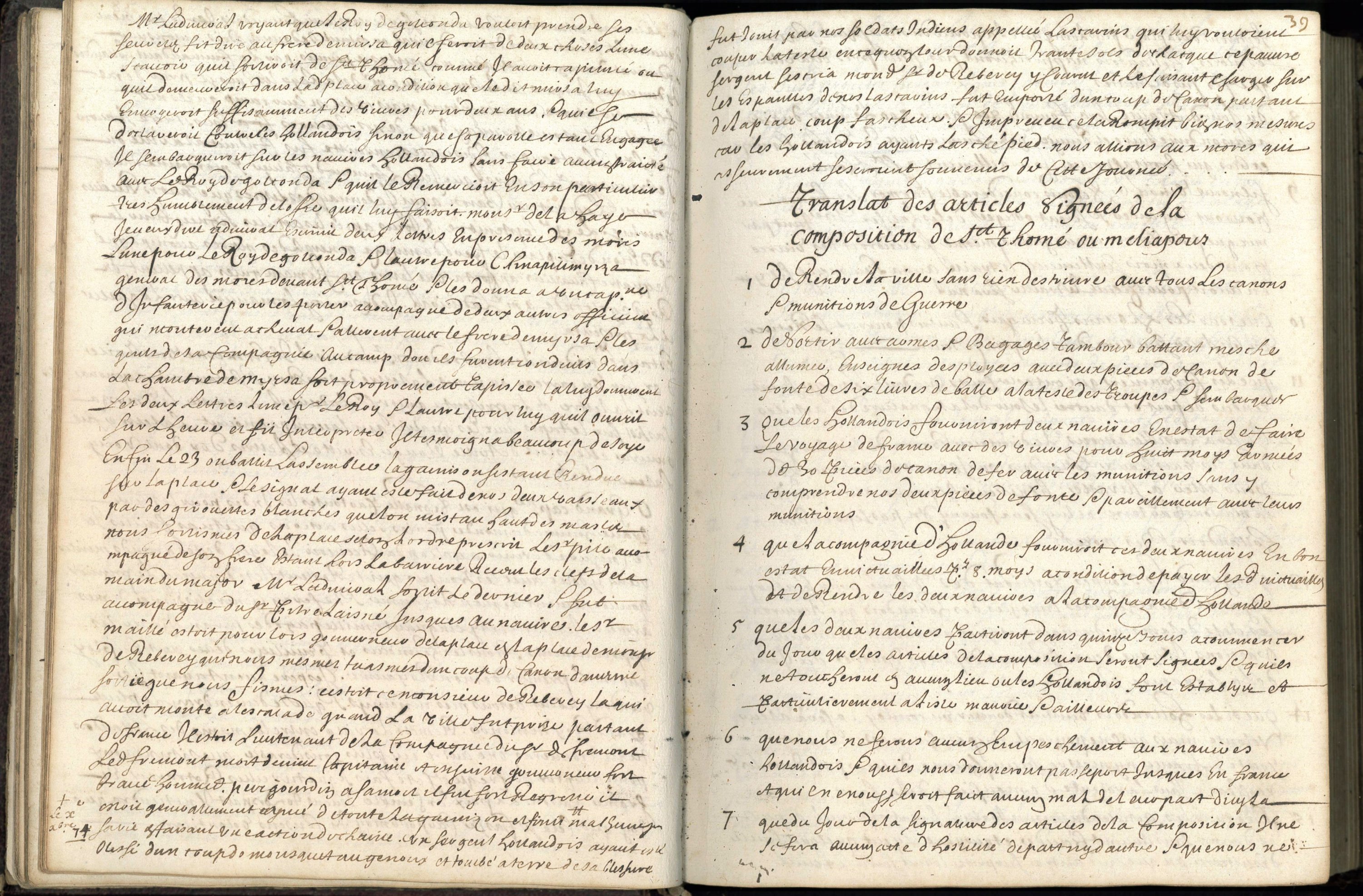 » et se termine au fol.108 ro par « le tout faisant 135 pièces de canons », suivi de la copie de lordre reçu de Blanquet de la Haye vice-roi aux Indes Orientales et copie de son brevet daide de camp.