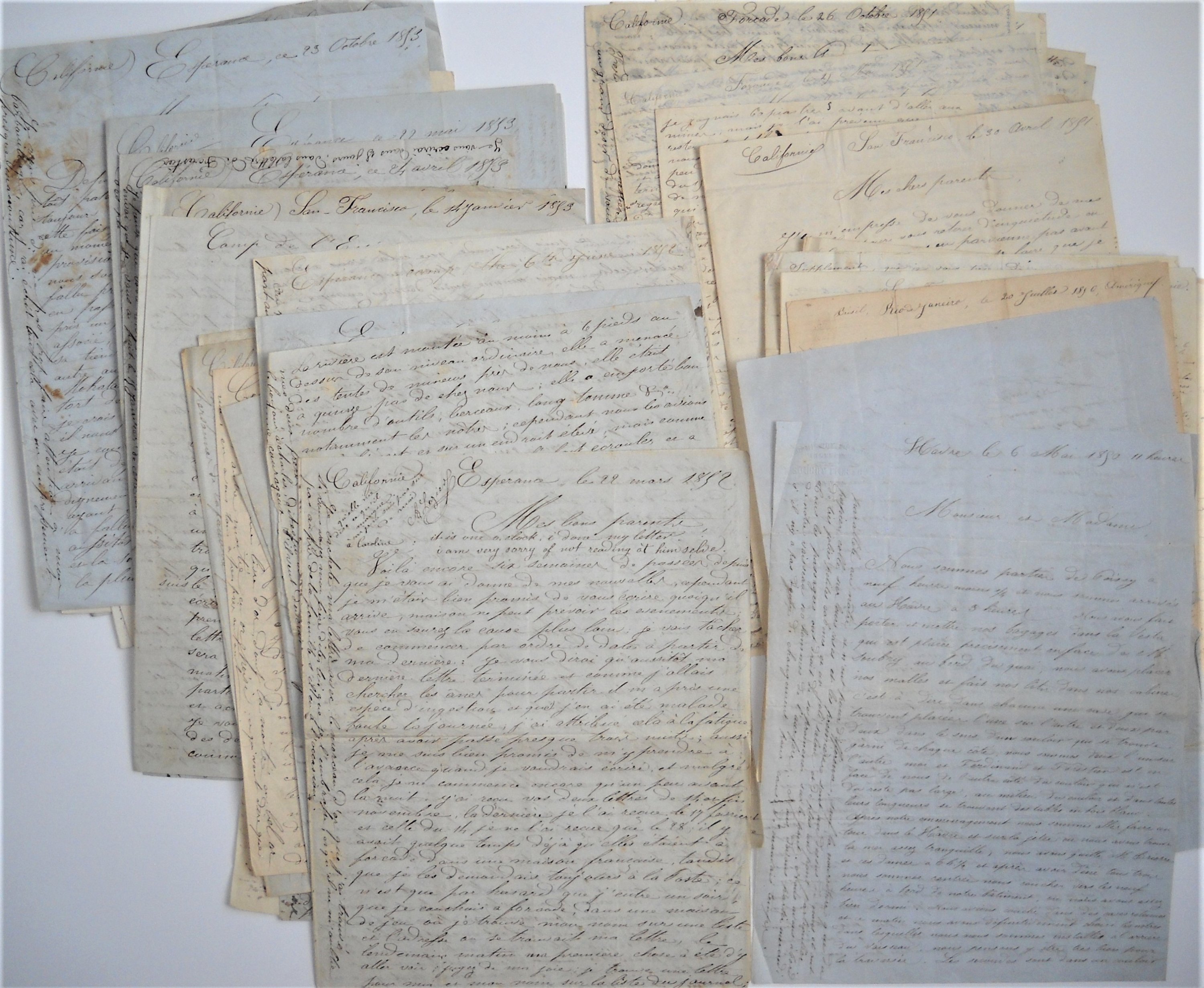 Env. 47 L.A.S., 188 pages in-8 et in-4, adressées à sa famille, écrites entre 1850 et 1853, depuis son départ du Havre, de son escale à Rio au Brésil, et en majorité de San Francisco et des deux camps de chercheurs dor, basés à Forcade et Espérance en Californie ;