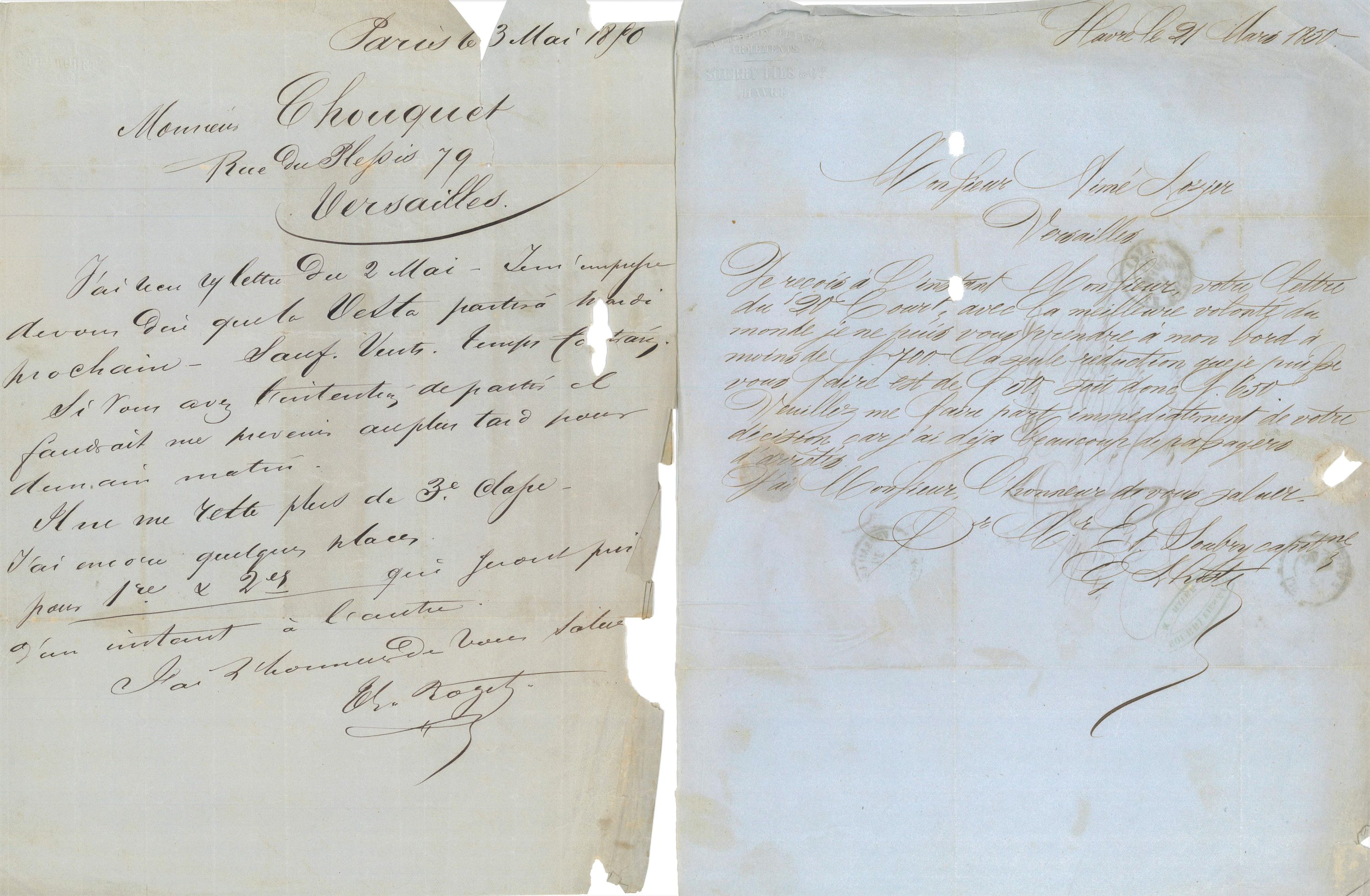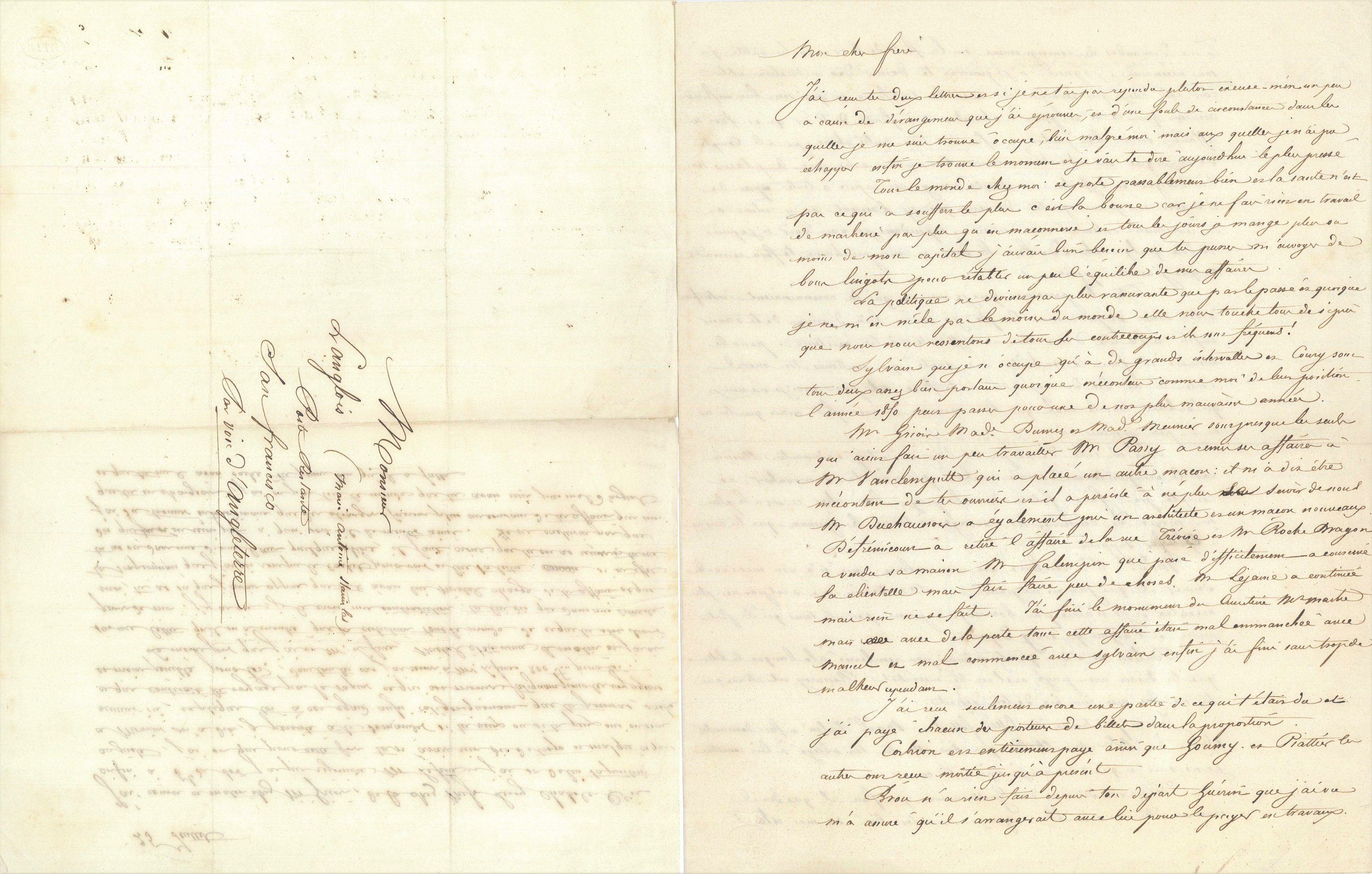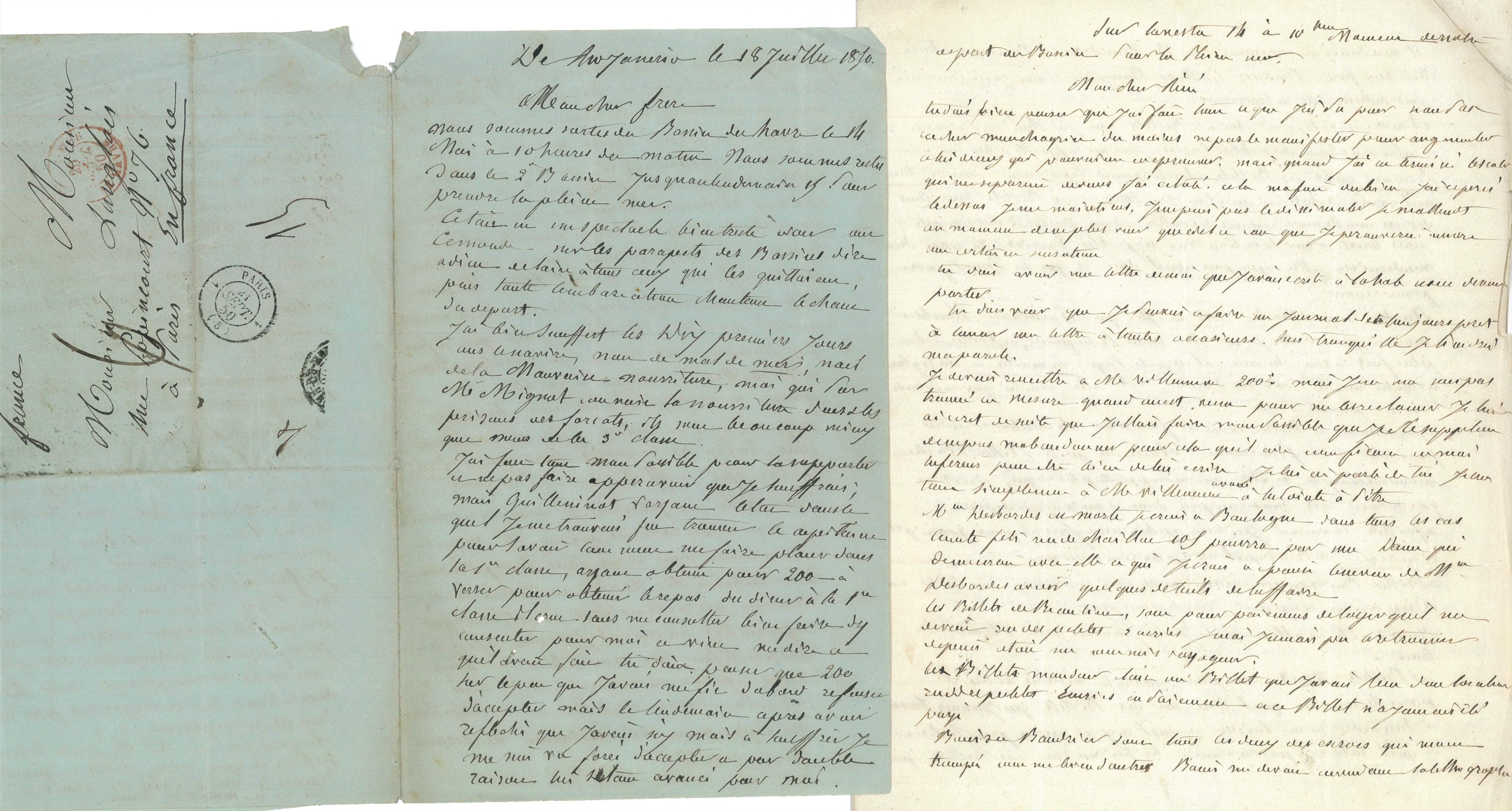 Env. 22 L.A.S., 1839-1852, adressées à René Langlois, dont 13 lettres, 62 pages in-8 et in-4, écrites entre 1850 et 1852, depuis son départ du Havre, de son escale à Rio au Brésil et à Valparaiso au Chili, et en majorité de San Francisco, sa destination finale + 6 brouillons de lettres de René à Stanislas (dont 3 sur du papier pelure, peu lisibles).