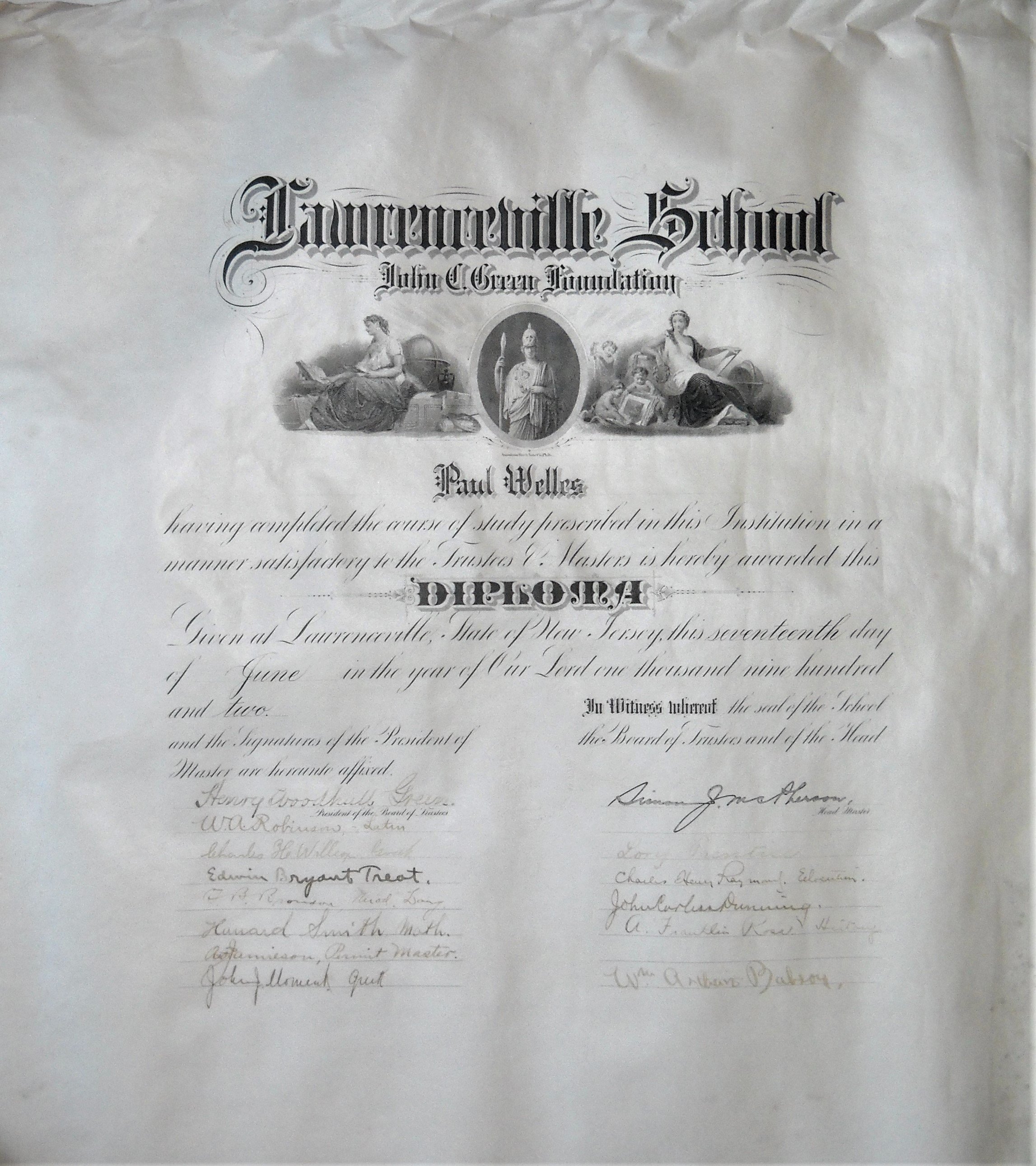 diplôme, 17 juin 1902, délivré à Paul Welles par lécole préparatoire de The Lawrenceville School située dans le New Jersey, signé par le président du conseil dadministration, le directeur et les enseignants, 49 x 58 cm ;