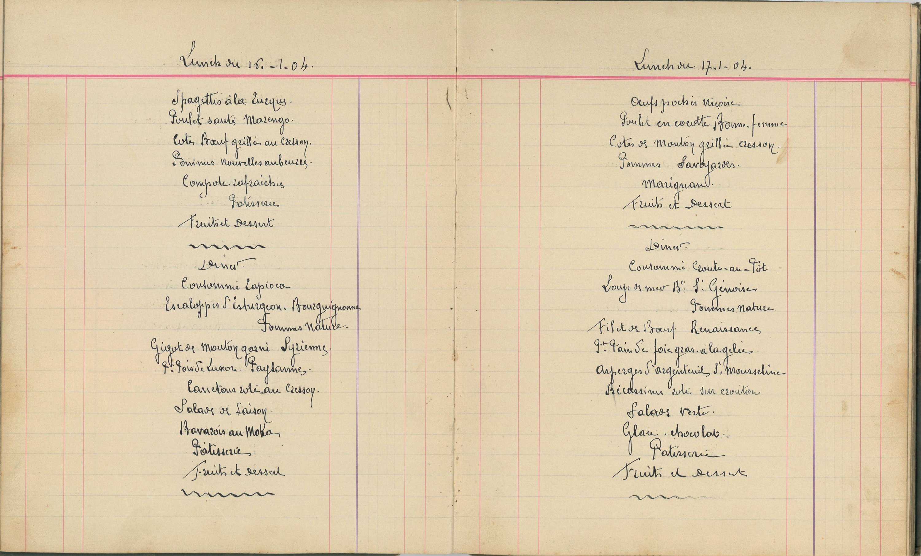 livre des menus manuscrit, du 21 novembre 1903 au 5 avril 1904, 134 pages in-4 ;