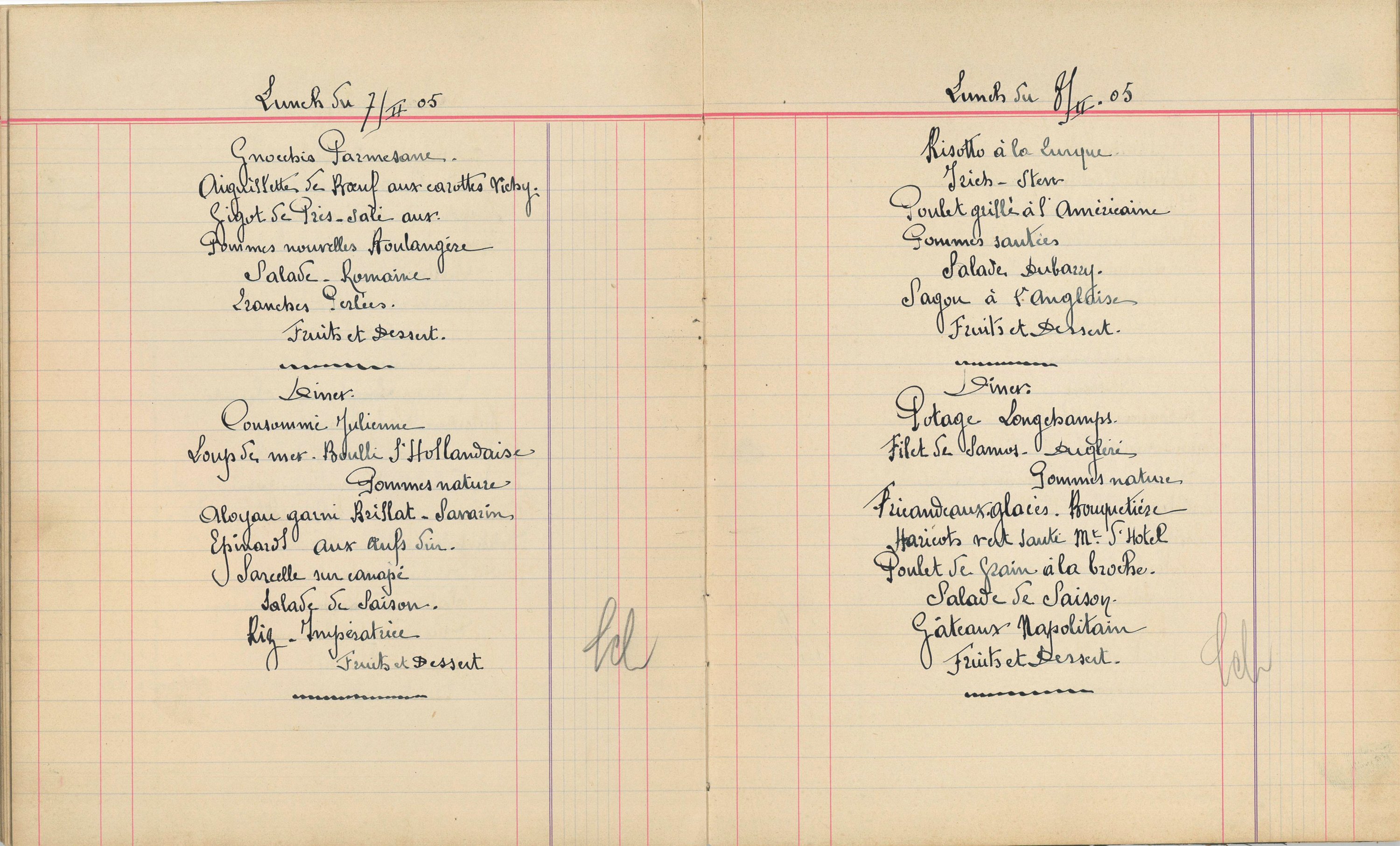 livre des menus manuscrit, du 18 mai 1906 au 9 mai 1907, 192 pages grand in-4 ;