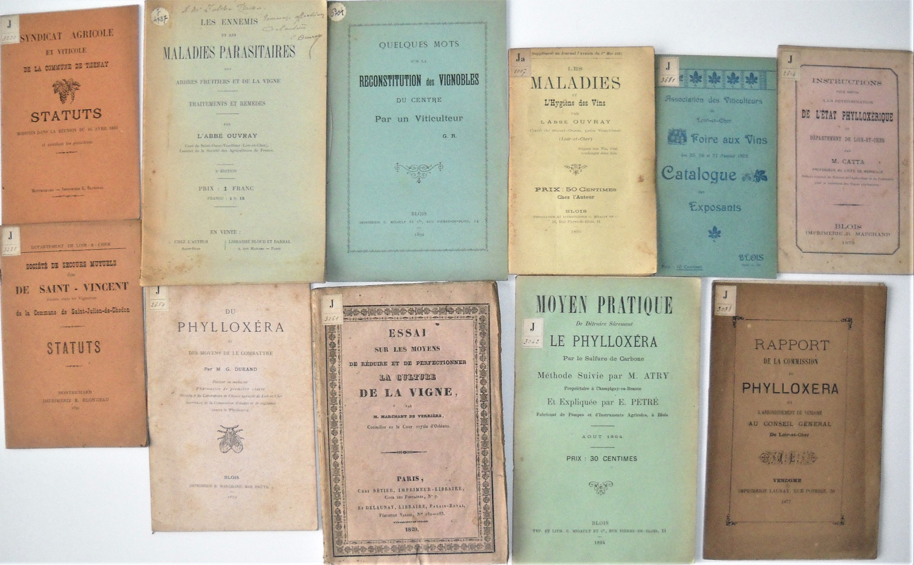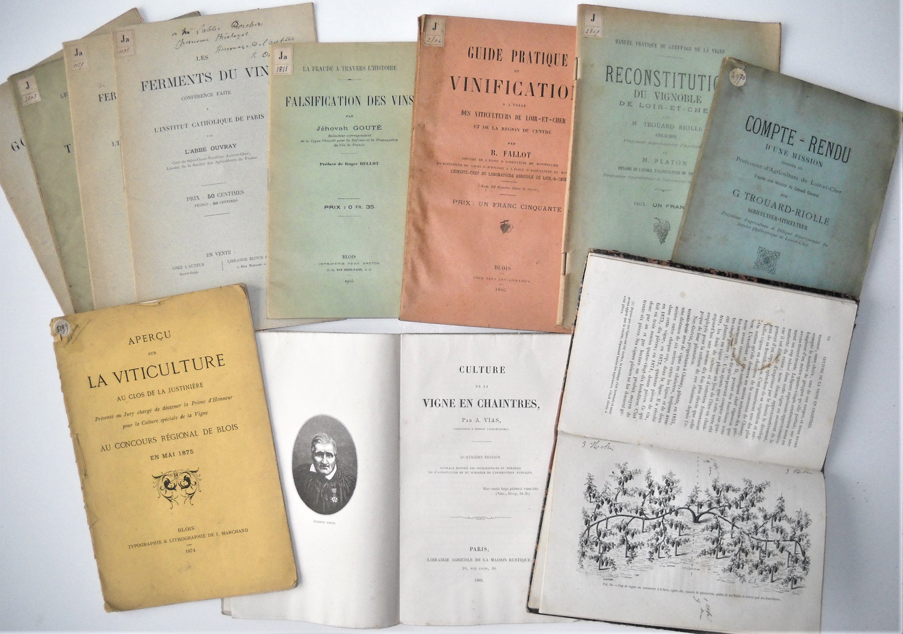 Essai sur la statistique nologique du département de Loir-et-Cher, Blois, 1824 ; Marchant de Verrière, Essai sur les moyens de réduire et de perfectionner la culture de la vigne, Paris, 1829 ; Aperçu sur la viticulture au clos de la Justinière présenté au concours régional de Blois en mai 1875, Blois, 1874 ; Vias instituteur à Chissay, Culture de la vigne en chaintres, Paris, 1875 ; Durand, Du phylloxéra et des moyens de le combattre, Blois, 1879 ; Catta, Instructions pour servir à la détermination de létat phylloxérique du département de Loir-et-Cher, Blois, 1879 ; Gibon, Tailleur de silex et vigneron de lOrléanais (Loir-et-Cher France), Paris, 1889 ; Trouard Riolle, Compte-rendu dune mission confiée au professeur dagriculture de Loir-et-Cher, Blois, 1889 ; Quelques mots sur la reconstitution des vignobles du Centre par un viticulteur, Blois, 1892 ; Statuts de la société de secours mutuels dite de Saint-Vincent établie entre les vignerons de la commune de Saint-Julien-de-Chédon (1892) ; Statuts du syndicat agricole et viticole de la commune de Thenay (1893) ; Statuts de lUnion vinicole de Loir-et-Cher (1894) ; Trouard Riolle et Platon, Reconstitution du vignoble de Loir-et-Cher, Blois, 1894 ; Atry et Pétré, Moyen pratique de détruire sûrement le phylloxéra par la sulfure de carbone, Blois, 1894 ; Fallot, Guide pratique de vinification à lusage des viticulteurs de Loir-et-Cher et de la région du Centre, Blois, 1895 ; G. Rabier-Jahan à Cour-sur-Loire près Menars, vignes américaines ; Association des viticulteurs de Loir-et-Cher, Foire aux vins des 25, 26 et 27 janvier 1902, catalogue des expossants ; Gouté, Falsification des vins, Blois, 1905 ; Abbé Ouvray, curé de Saint-Ouen Vendôme : Les maladies et lhygiène des vins, Blois, 1895 ; Les ferments du vin, conférence faite à linstitut catholique de Paris ; Le gouvernement et léducation du vin, conférence faite à linstitut catholique de Paris ; Les ennemis et les maladies parasitaires des arbres fruitiers et de la vigne, traitements et remèdes ; Les ferments de la terre conférence faite à linstitut catholique de Paris ; etc.