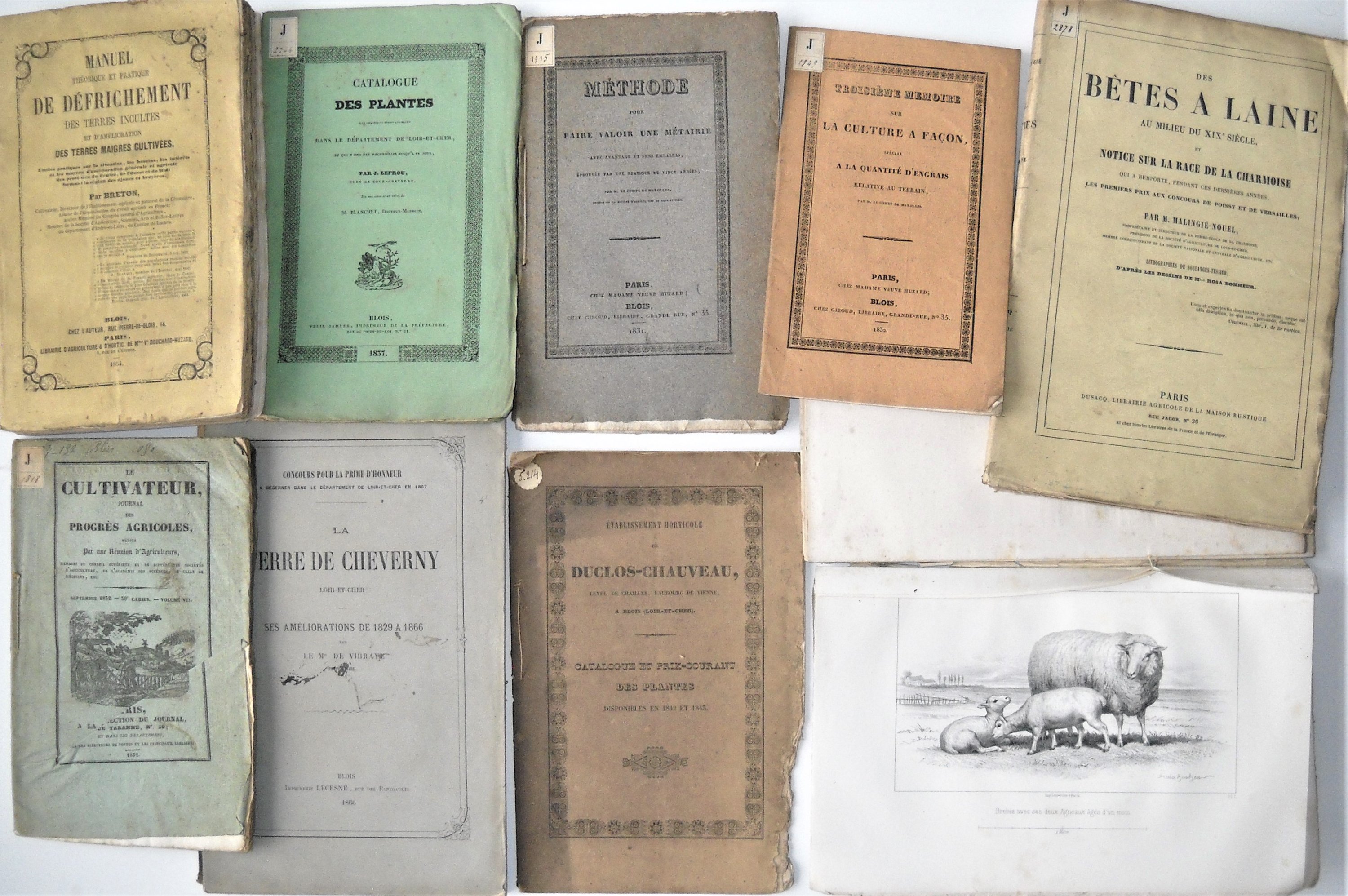 Agriculture : Comte de Marolles : Méthode pour faire valoir une métairie avec avantage et sans embarras, Blois, 1831 ; Troisième mémoire sur la culture à façon, spécial à la quantité dengrais relative au terrain, Blois, 1832 ; Culture à façon ou manière de faire valoir à prix convenu, Blois, 1838 ; Rapports sur la culture à façon employée à la Bertinière, Blois, 1831 ; Saniewski, Mémoire sur lemploi du sarrasin, Blois, 1840 ; Breton, Manuel théorique et pratique de défrichement des terres incultes et damélioration des terres maigres cultivées, Blois, 1854, 398 pp. ; Masure, Mémoire sur les avantages comparés de la marne et de la chaux employées en agriculture, Orléans, 1865 ; La question agricole, organisation de lagriculture, comices, domesticité, crédit, Blois, 1866 ; Marquis de Vibraye, La terre de Cherverny, ses améliorations de 1829 à 1866, Blois, 1866 ; Anjubault, Recherches sur les travaux relatifs au rouissage des chanvres de la Sarthe, Le Mans, 1866 ; Leguay, Recueil des usages locaux du département de Loir-et-Cher, Paris, 1888 ; Fourrier, Une ferme dans le Val de Loire au pays Blésois, projet dexploitation rurale, Blois, 1894 ; Botanique : Julien Lefrou, Catalogue des plantes qui croissent spontanément dans le département de Loir-et-Cher et qui y ont été recueillies jusquà ce jour, Blois, 1837 ; Le Grand, Sur la flore de Loir-et-Cher végétation de ce département comparée à celle du Cher, Bourges, 1886 ;