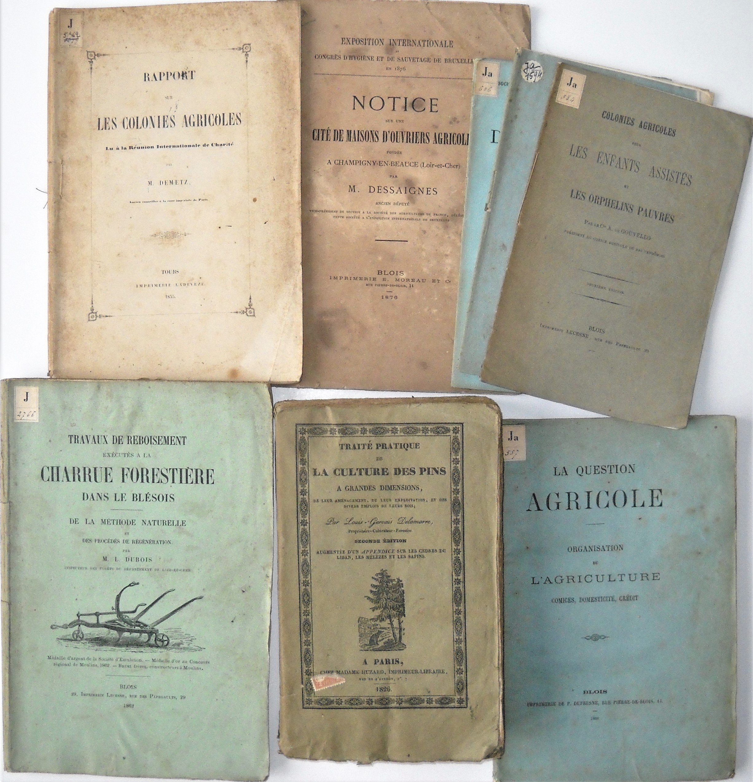 De Montpezat, Notice sur la fondation dune colonie agricole dans le département de Loir-et-Cher, Blois, 1847 ; Demetz, Rapport sur les colonies agricoles, Tours, 1855 ; Dessaignes, Notice sur une cité de maisons douvriers agricoles fondée à Champigny-en-Beauce, Blois, 1876 ; Statuts de la colonie agricole de Nourray ; De Gouvello : Colonies agricoles pour les enfants trouvés et abandonnés, Blois, 1862 ; La dépopulation des campagnes, les asiles ruraux et les orphelinats agricoles, Paris, 1869 ; etc.
