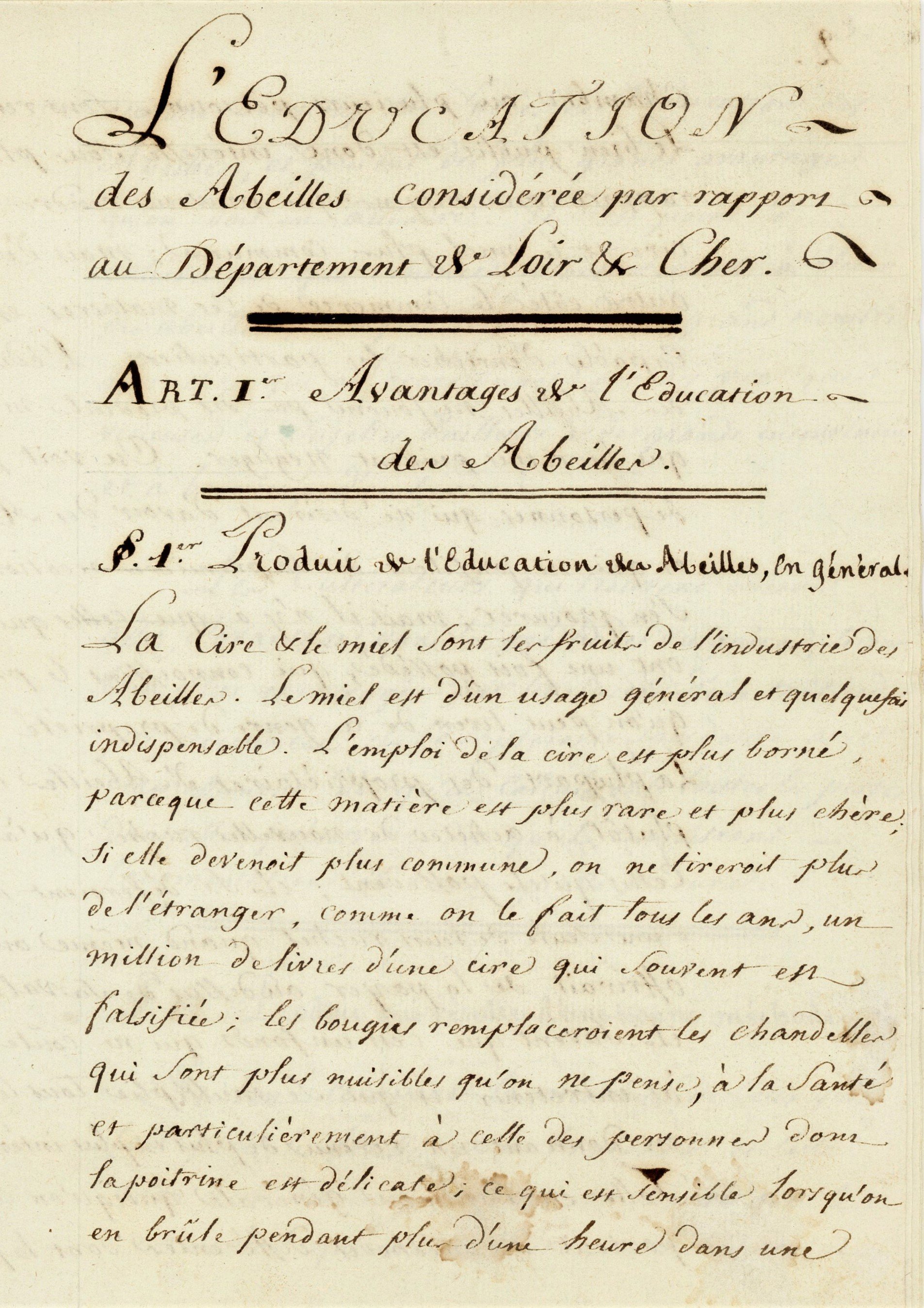 Léducation des abeilles considérée par rapport au département de Loir-et-Cher, mémoire (copie de la main de lauteur), 1802, 20 pp. in-4, et copie autographe signée de la lettre adressée à lépoque au préfet de Loir-et-Cher ;