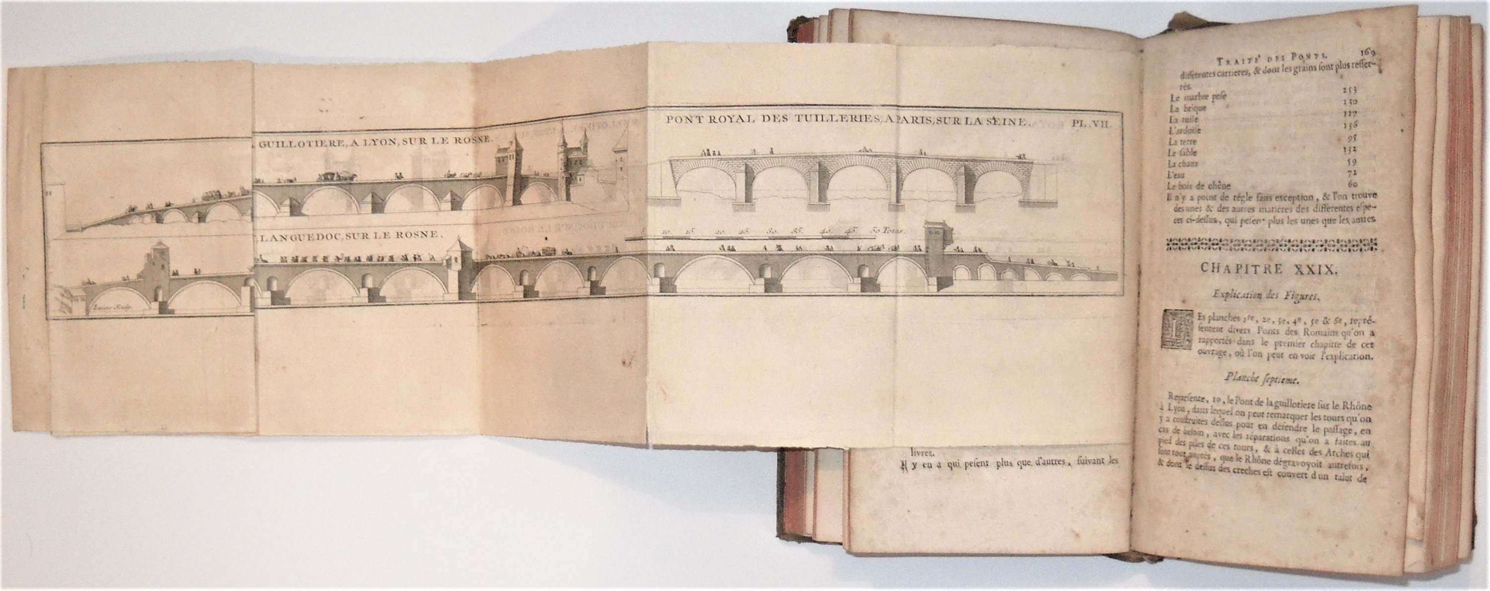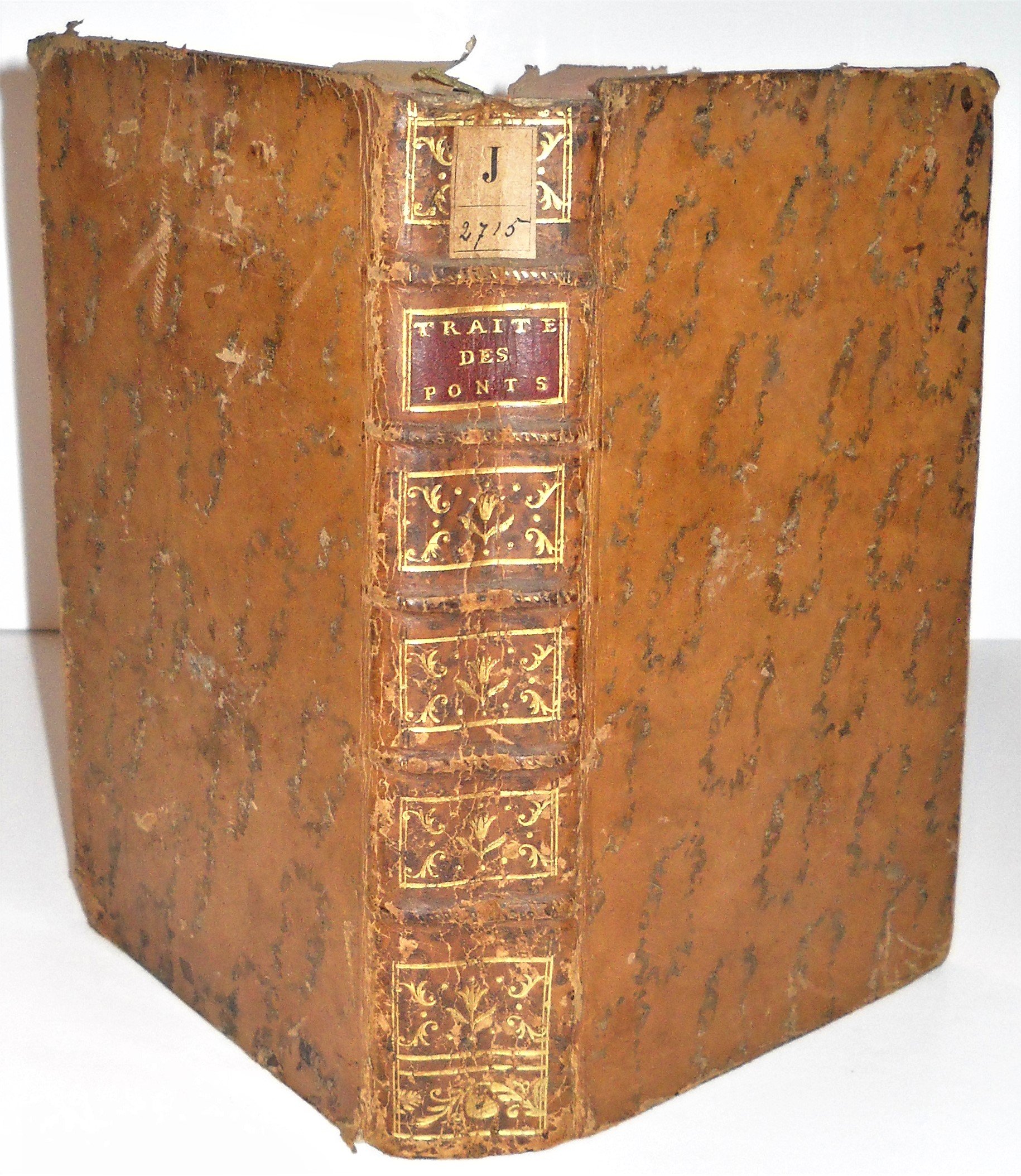Traité des ponts, où il est parlé de ceux des Romains & de ceux des modernes... Des projets des ponts... Des différentes sortes de ponts, dormants ou fixes... Avec l'explication de tous les termes dart qu'on emploie à la construction des ponts... Les édits, déclarations, arrêt & ordonnances... Paris, veuve Duchesne, 1765, rel. in-8 plein veau dépoque (en létat), 336 pp. (pliure à 2 pp.) avec 30 pl. dépliantes in-texte et gravure en frontispice.