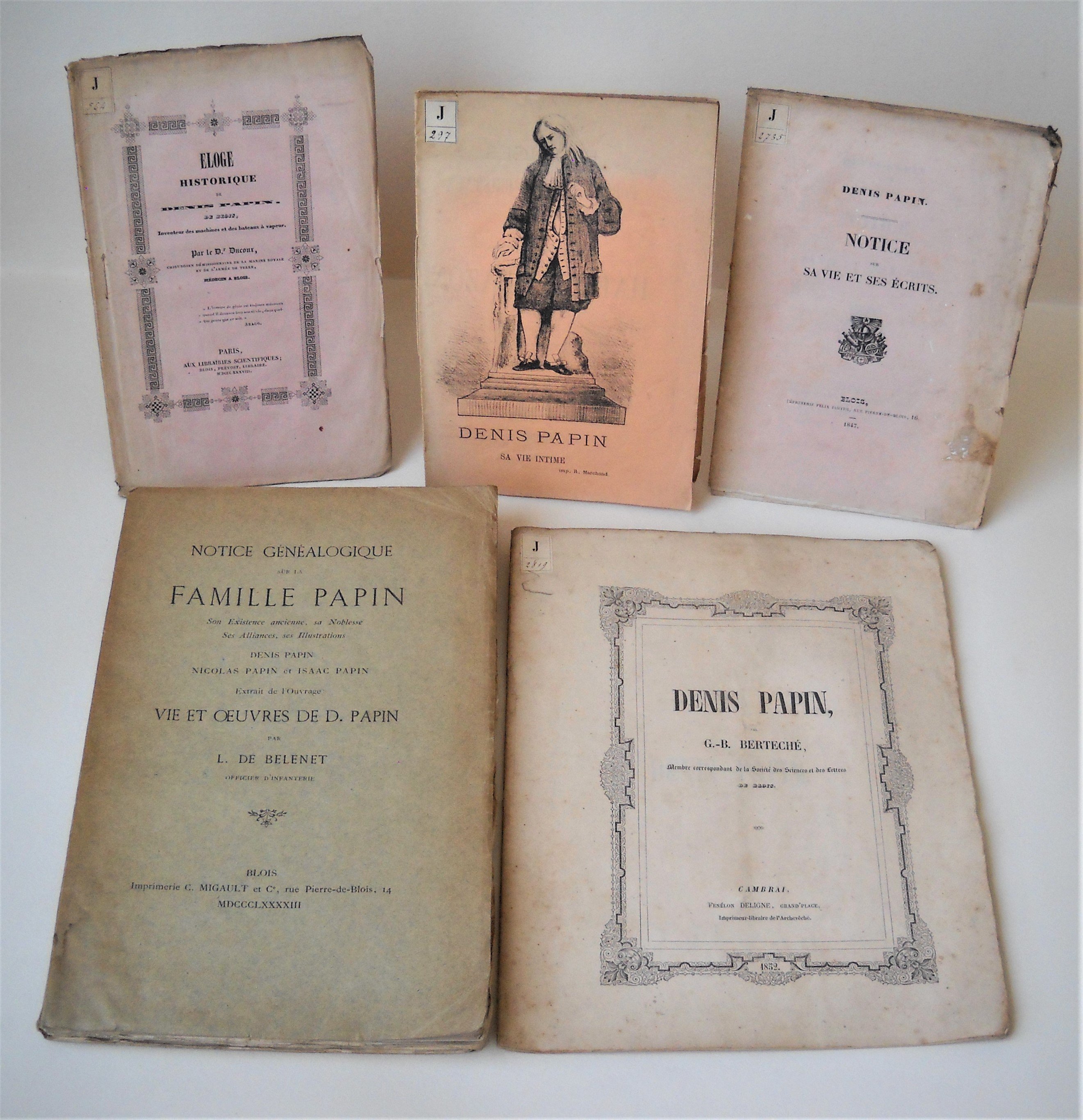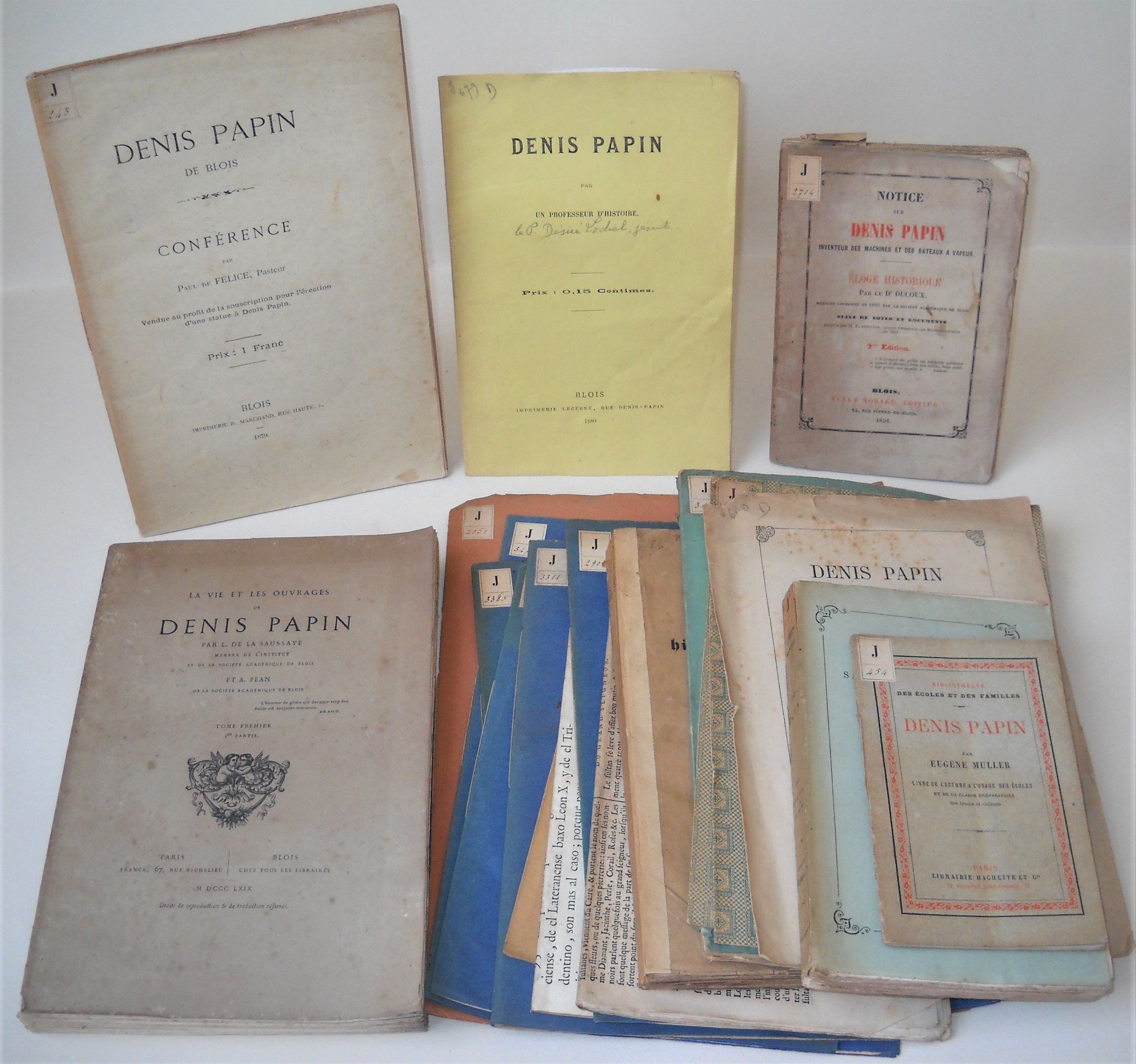 Ducoux, Eloge historique de Denis Papin de Blois, Paris, 1838 ; De La Saussaye, Denis Papin, notice sur sa vie et ses écrits, Blois, 1847 ; Berteché, Denis Papin, Cambrai, 1852 ; Ducoux, Notice sur Denis Papin inventeur des machines et bateaux à vapeur, Blois, 1854 ; Baron Ernouf, Denis Papin sa vie et son uvre, Paris, 1874 ; Félice, Denis Papin de Blois, Blois, 1879 ; de La Saussaye et Péan, La vie et les ouvrages de Denis Papin, Paris/Blois, 1879 ; Lodiel, Denis Papin par un professeur dhistoire, Blois, 1880 ; Muller, Denis Papin, Paris, 1881 ; de Belenet, Notice généalogique sur la famille Papin, Blois, 1893 ; etc.