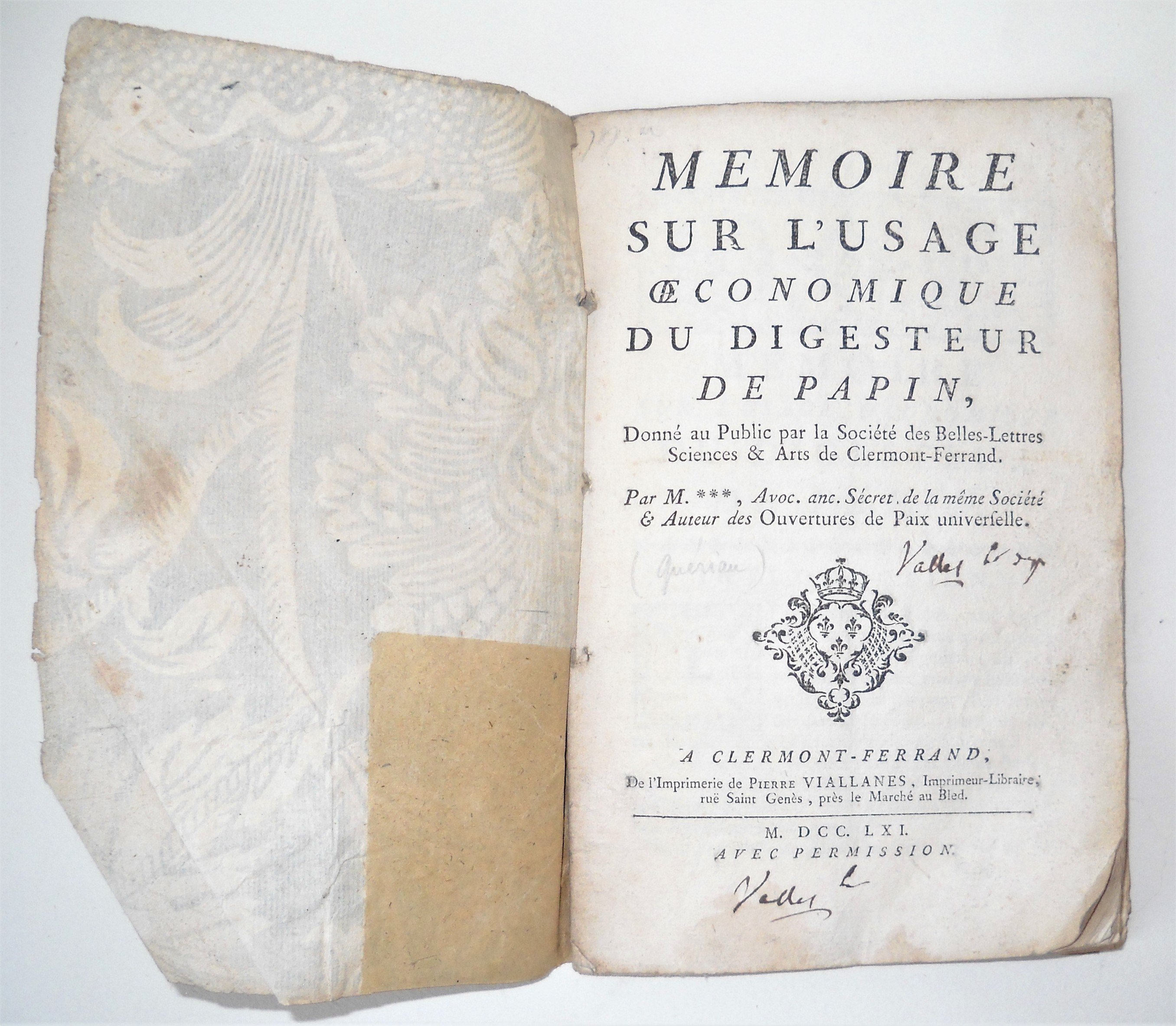 Mémoire sur l'usage oeconomique du digesteur de Papin, Clermont-Ferrand, Pierre Viallanes, 1761, in-8, 43 pp. avec 1 planche in-t.