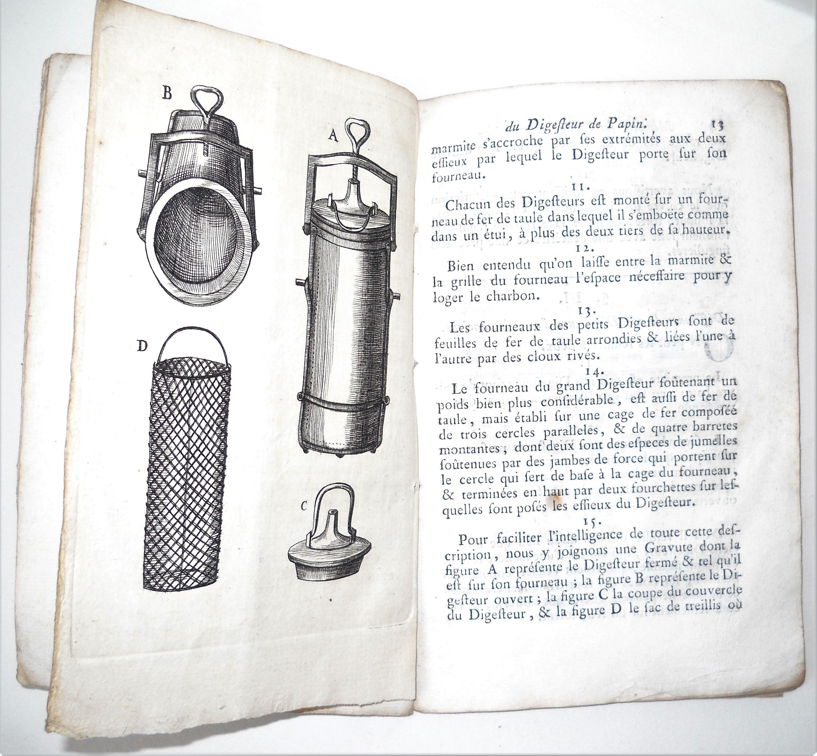 Rarissime édition originale qui décrit l'aspect et la manipulation de la marmite hermétique conçue par Papin, et améliorée par Quériau, pour fabriquer du bouillon en tablettes.