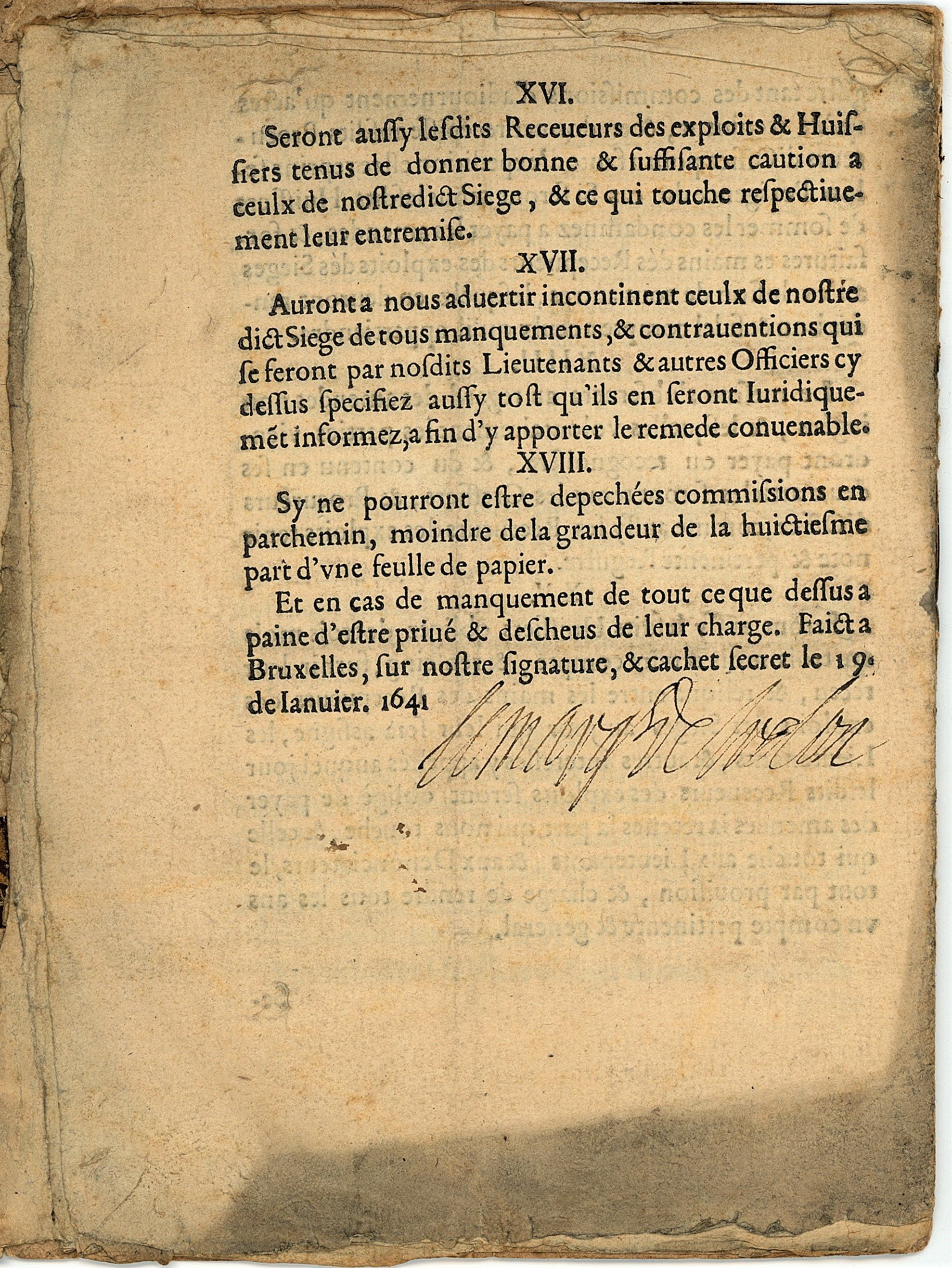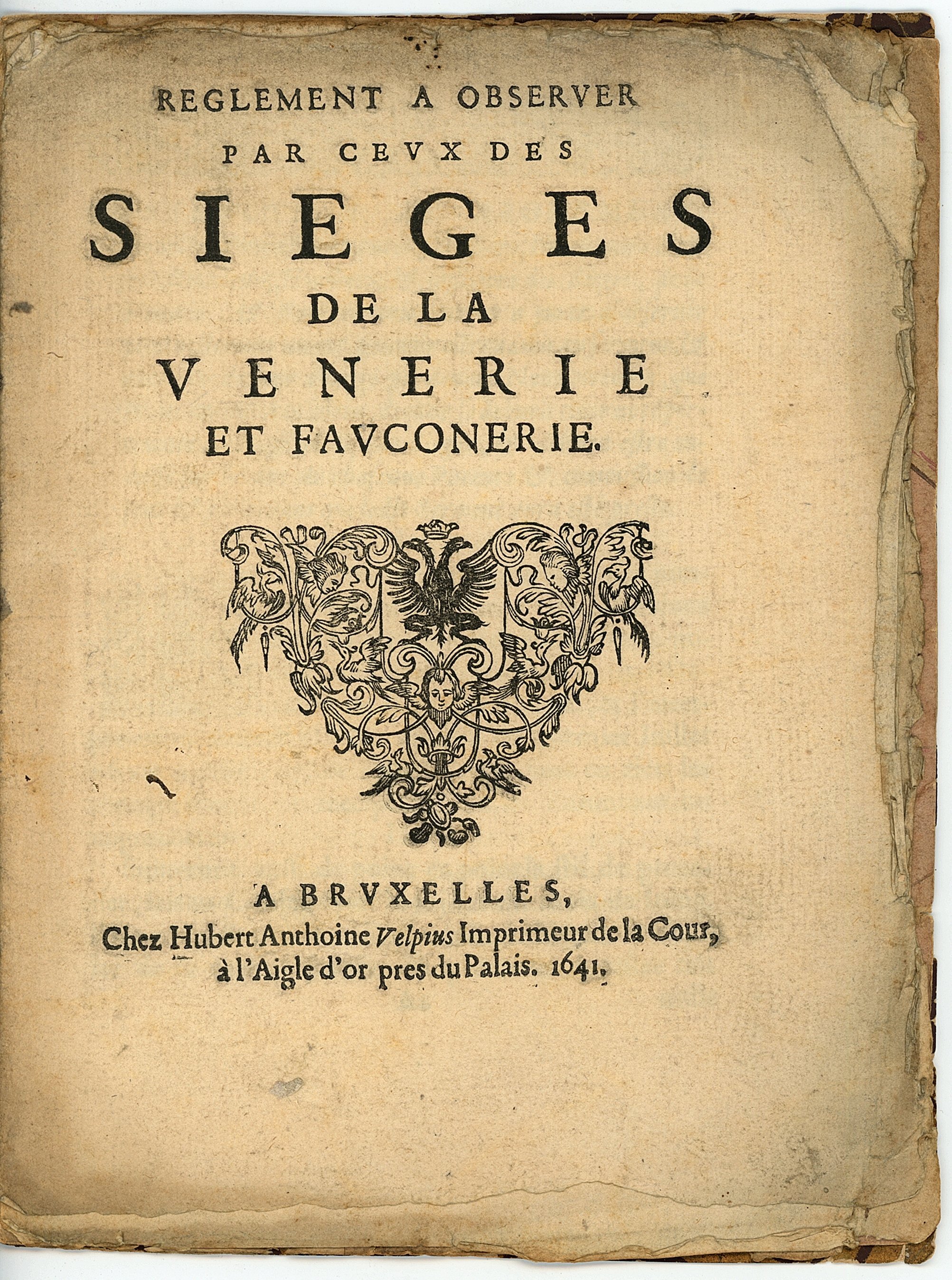 Règlement à observer par ceux des sièges de la vénerie et fauconerie, Bruxelles, chez Hubert Anthoine Velpins imprimeur de la Cour, à lAigle dor près du palais, 1641, 6 pp. in-8 imprimée.