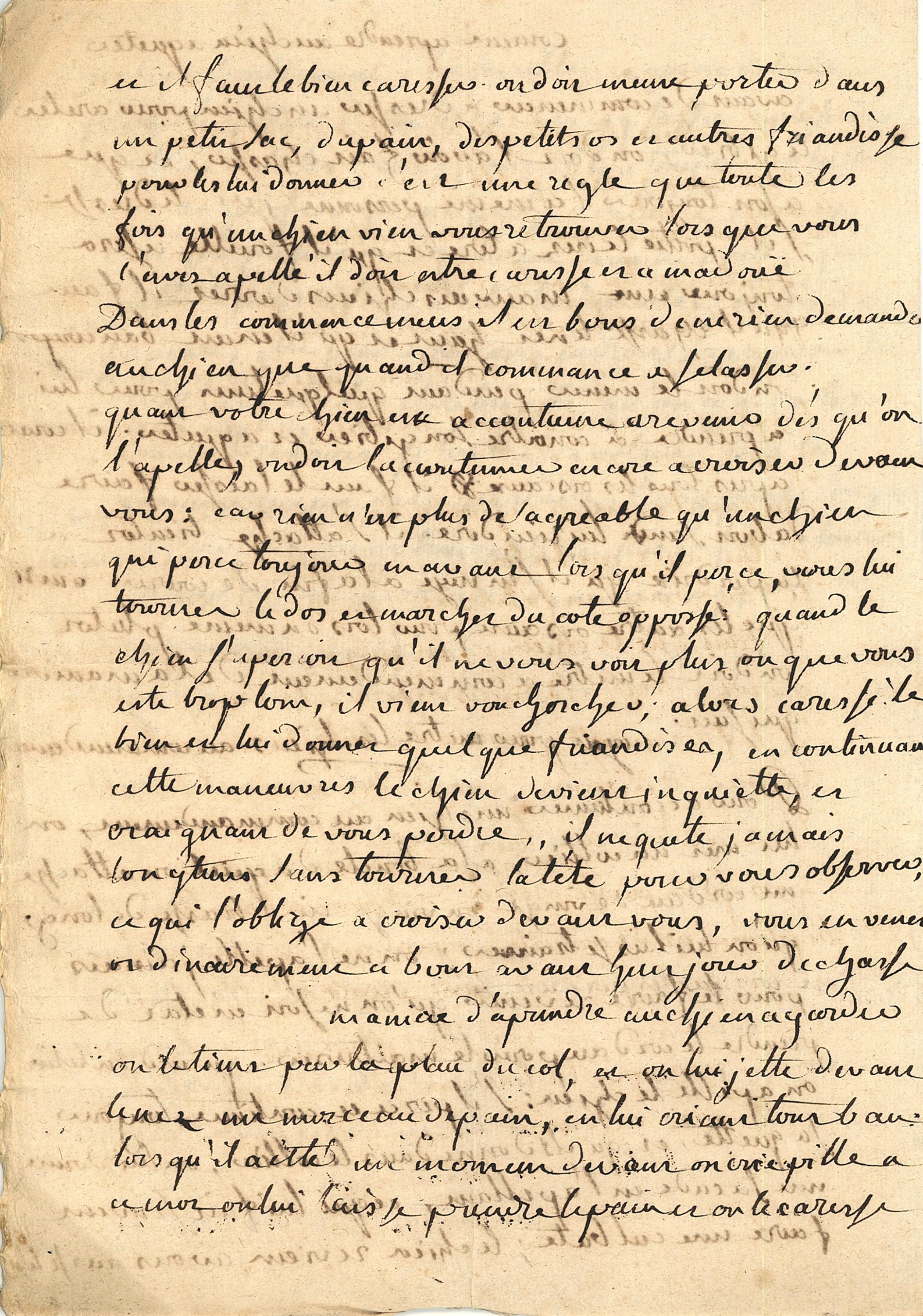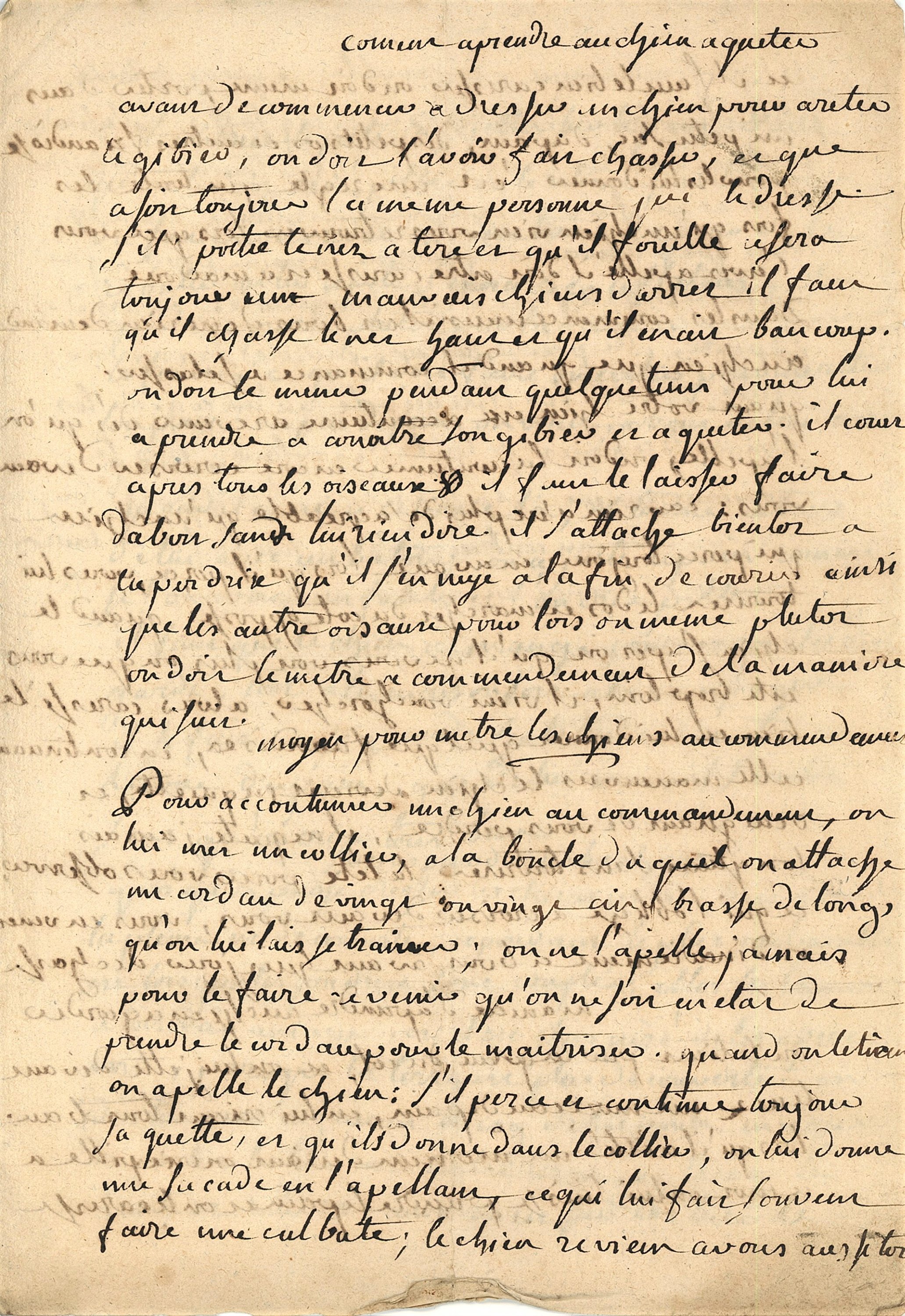 Manuscrit, fin du 18e siècle, 4 pages in-4 ; recommandations de dressage pour apprendre aux chiens de chasse à quêter, mettre au commandement, à faire garder et la meilleure saison pour dresser.