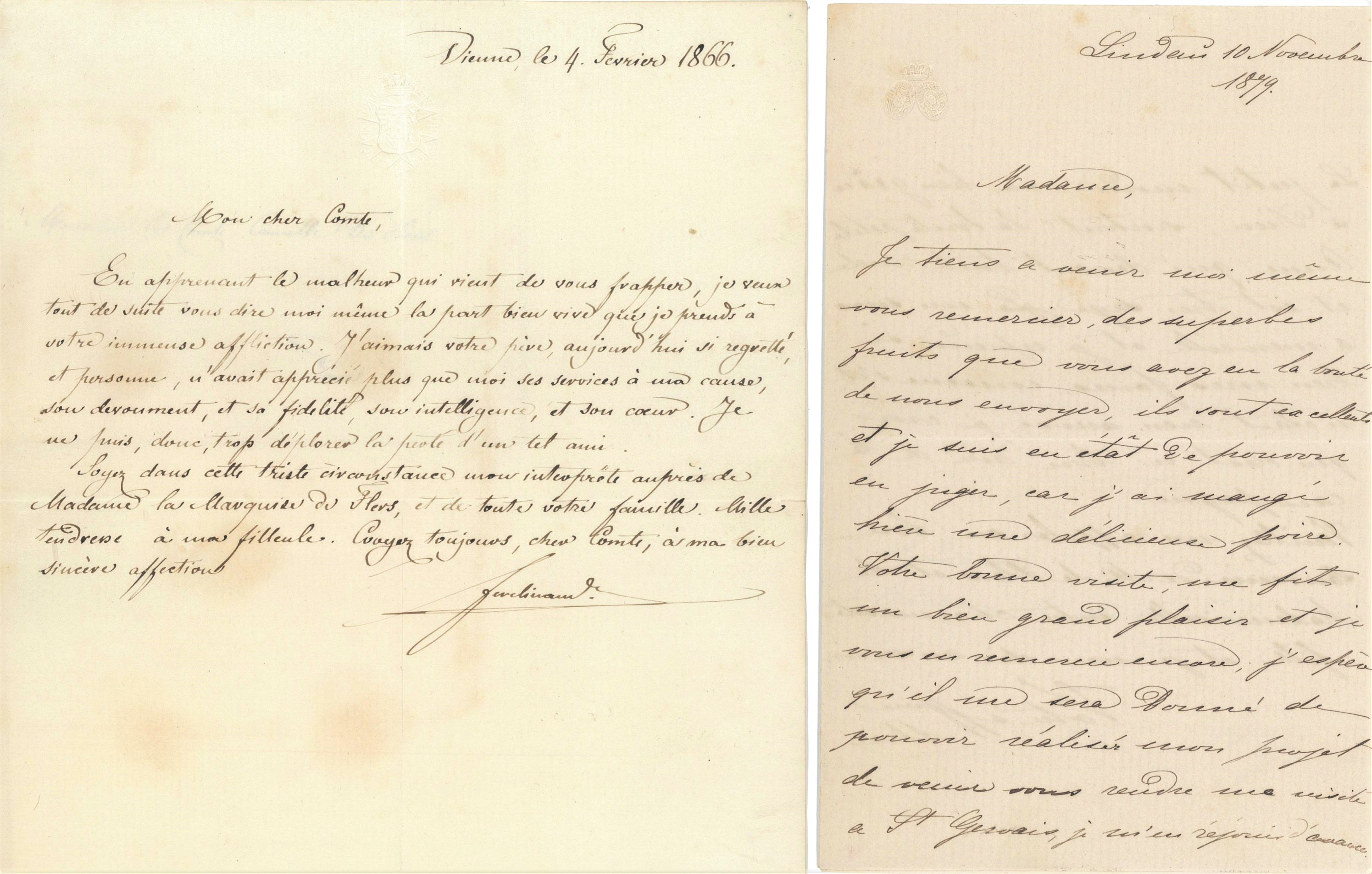 2 L.A.S., Gins, 16 et 30 janvier 1881, Marie Antoinette de Habsbourg (1858-1883), archiduchesse et princesse de Toscane, abbesse du couvent royal et impérial thérésien de Hradcany à Prague, adressées à sa filleule Marguerite de La Motte-Ango de Flers (1860-1928), 5 pages in-8, la félicitant pour son mariage avec Louis vicomte de Montrichard ;
