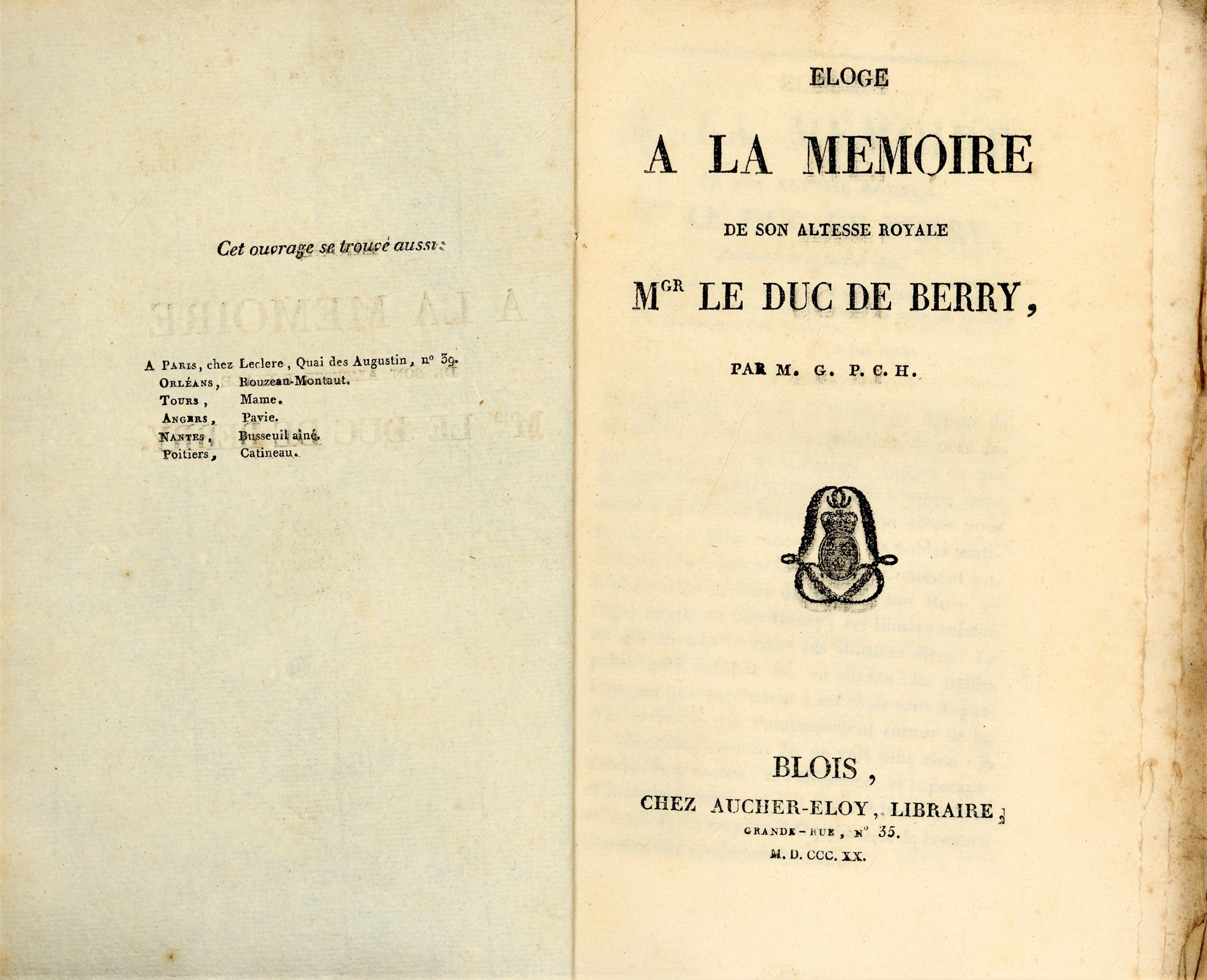 Eloge à la mémoire de Son Altesse Royale Mgr le Duc de Berry, Blois, Aucher-Eloy, 1820, in-8, 33 pp., double exemplaire ;