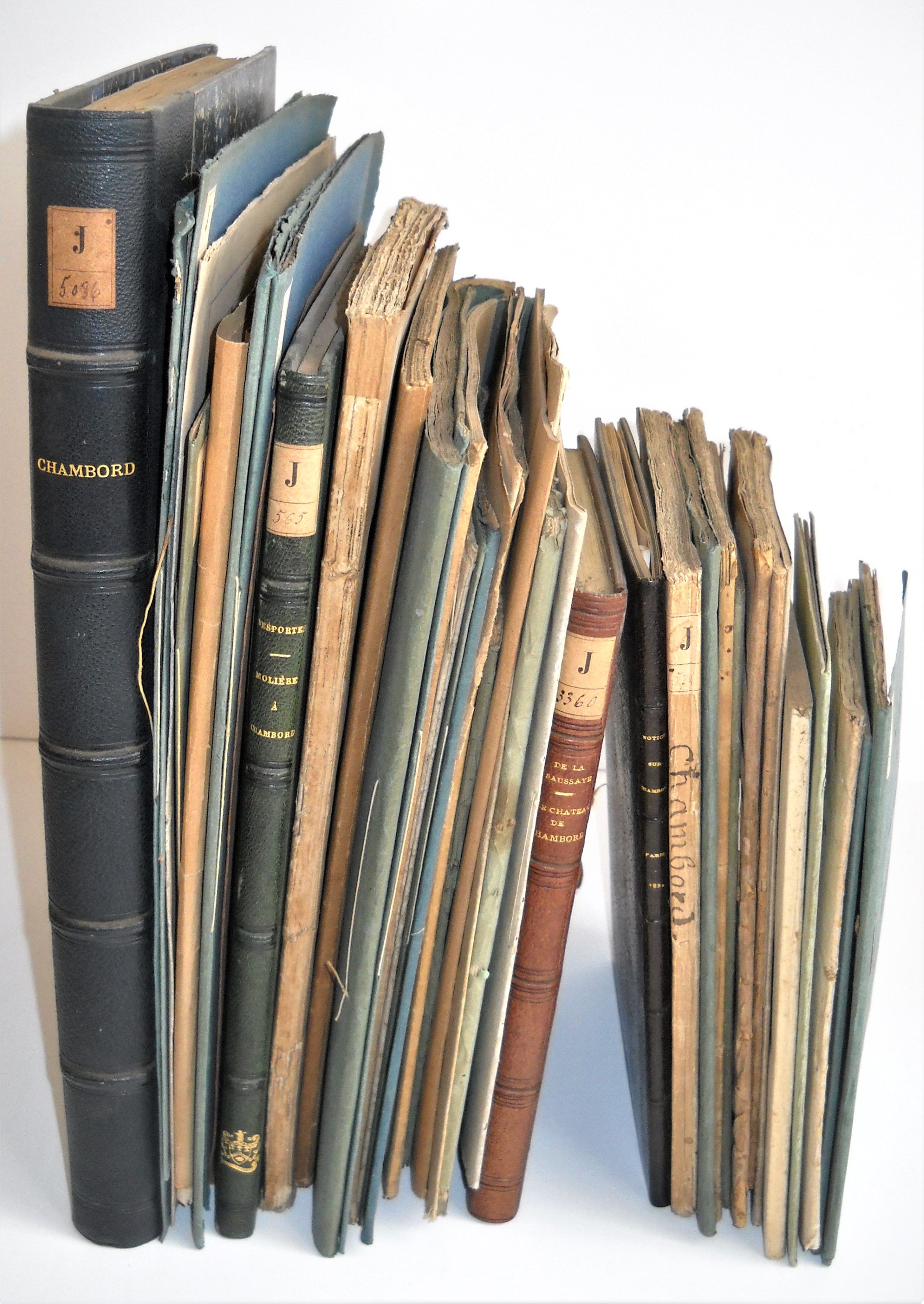 pour lacquisition de Chambord, Paris, 1821 ; Ménissier et Martin, Le château de Chambord hommage en un acte et en vaudeville, Paris, 1821 ; Gilbert, Notice historique et descriptive du château de Chambord et de ses dépendances, Blois, 1821 ; Souscription de Chambord, 3 bulletins imprimés : 1er, 4e et 5e rapport, 1823-1824, imp. de J.C. Trouvé, Paris ; Première visite de S.A.R. Madame à Chambord, 18 juin 1828, Paris, 1828 ; Riou, Voyage à Chambord, Tours, 1831 ; Vergnaud-Romagnési, Notice sur le château de Chambord, Paris, 1832 ; Pétition relative au domaine de Chambord, Nantes, 1834 ; Louis de la Saussaye : Notice sur le domaine de Chambord, Chambord, 1834 ; Histoire du château de Chambord, Blois, 1854 ; Le château de Chambord, Lyon, 1859 ; Seytre, Promenade à Amboise, Blois et Chambord, 1840 ; Desportes, Molière à Chambord, comédie en quatre actes et en vers, Paris, 1843 ; Boucher, Plan général du domaine de Chambord, Orléans, 1856, plan dépliant ; Salmon, Marché fait avec des maçons pour la construction de certaines parties du château de Chambord, Paris, 1856 ; Chambord, banquet du 29 septembre 1879 ; Arnould : Chambord origines de propriété, Blois, 1884 ; Où en est la question de Chambord, Abbeville, 1887 ; Robinet de Cléry, La question de Chambord au point de vue du droit, Paris, 1886 ; Jarry, Le château de Chambord, Orléans, 1888 ; de Croy, Quelques renseignements inédits sur les maitres maçons des châteaux de Chambord et dAmboise, Orléans, 1902 ; Dreux, Chambord the castle and its history, 1908 ; etc. Qqs doublons.