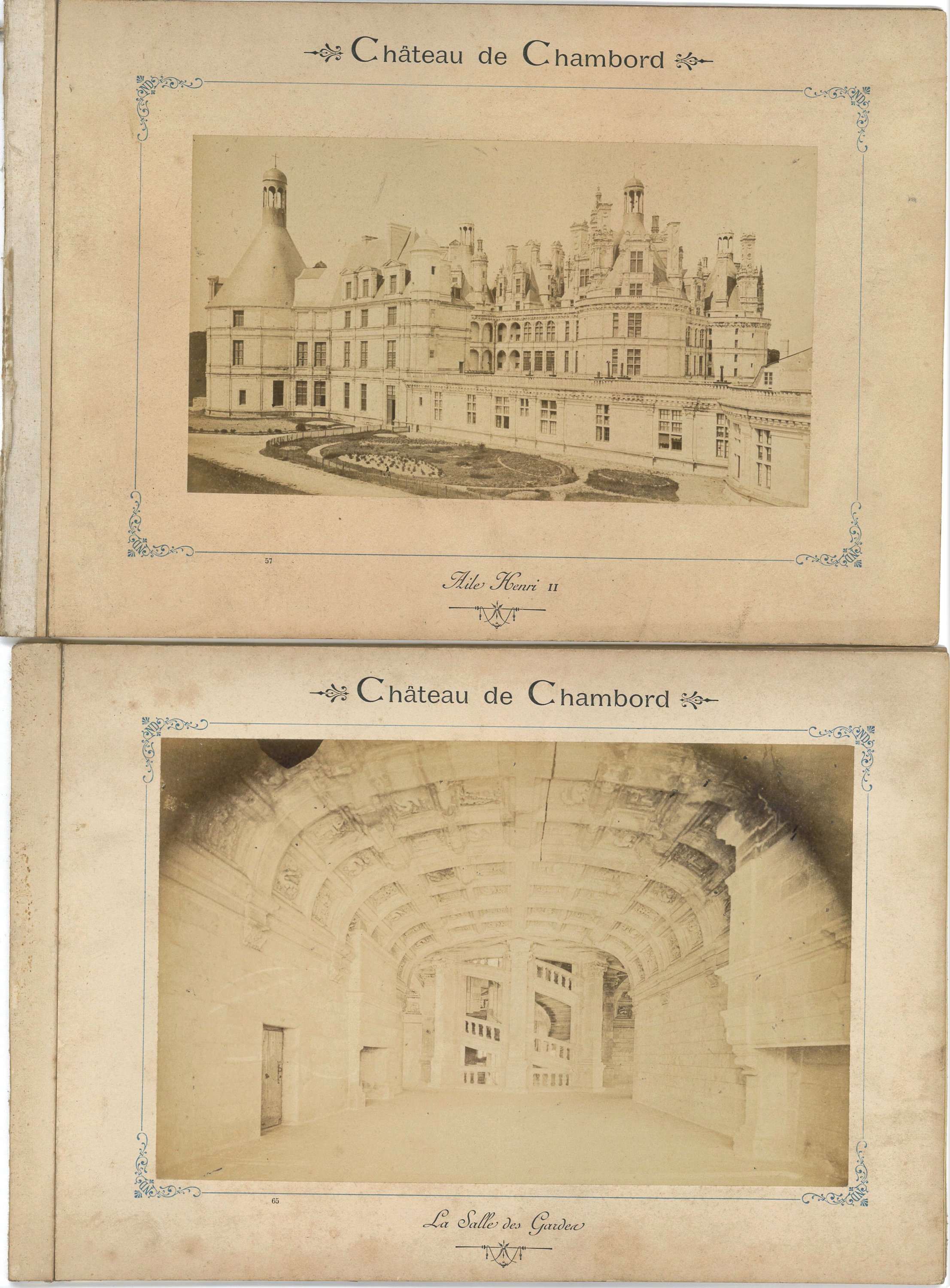 Joint: 8 clichés photographiques (env. 10 x 17 cm) du château de Chambord contrecollées sur carton fort (17 x 24 cm), fin du 19e siècle.
