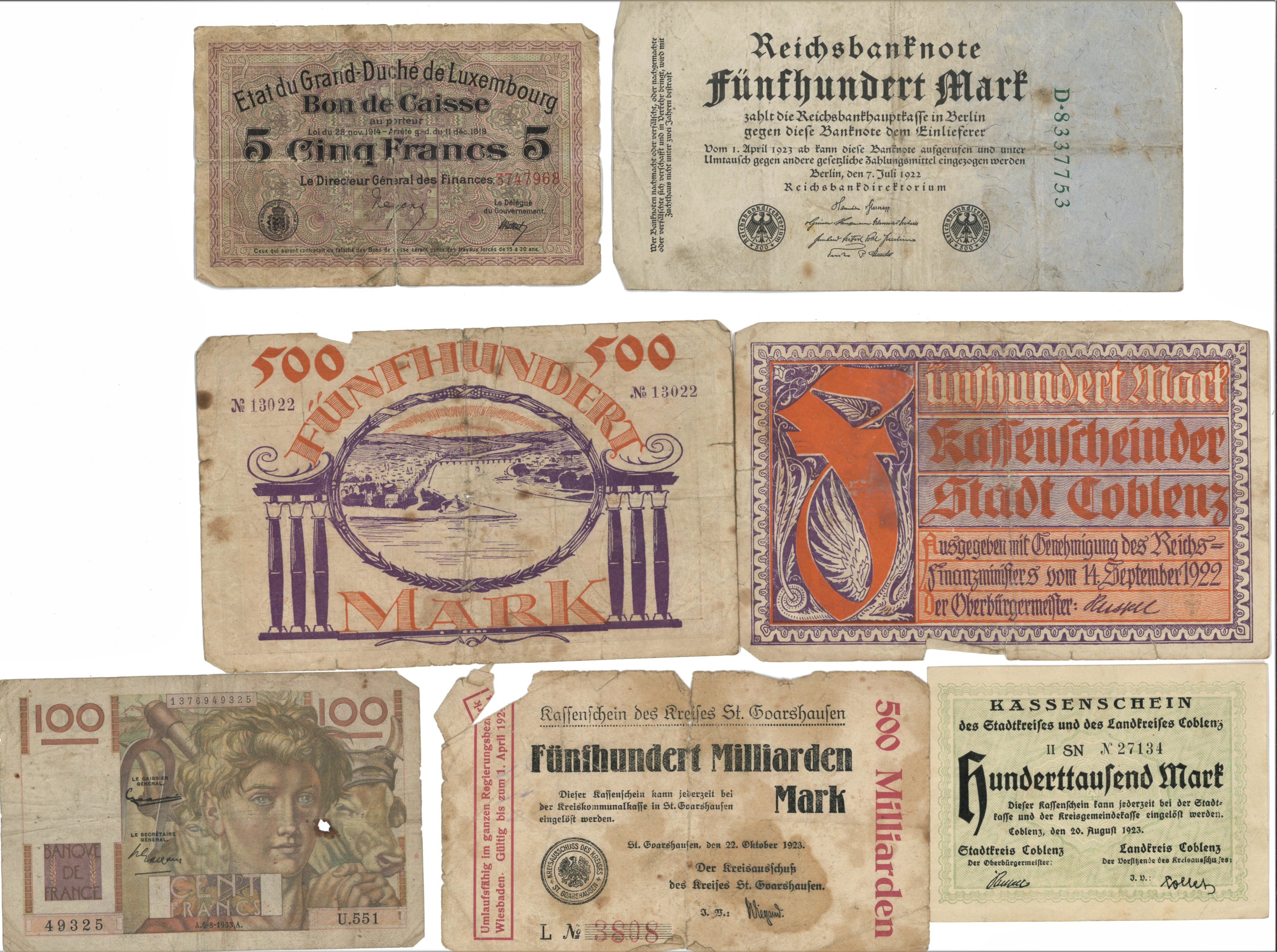 JOINT: Lot de 26 billets, en létat: Bon de caisse de 5 francs de lÉtat du Grand-Duché de Luxembourg (1919) 17 ex. 500 mark Reichsbanknote Ber-lin 7 juillet 1922 5 ex. billets de nécessité de Coblenz 500 mark (1922) 1 ex. billet de nécessité de Coblenz 100 000 mark (1923) 1 ex. billet de nécessité de St Goarshausen 500 milliards de mark (1923) 1 ex. 100 francs Jeune Pay-san (1953) Titre provisoire au porteur de 1888 de la compagnie universelle du canal interocéanique de Panama.